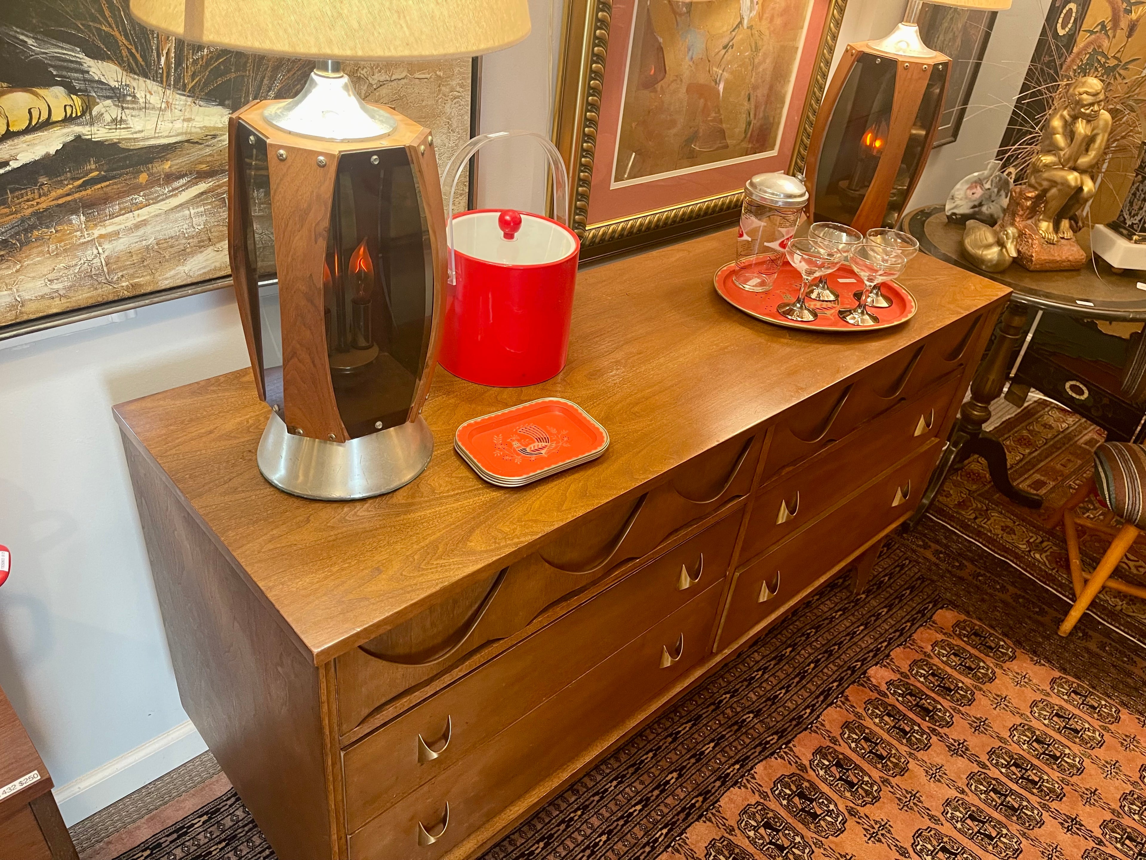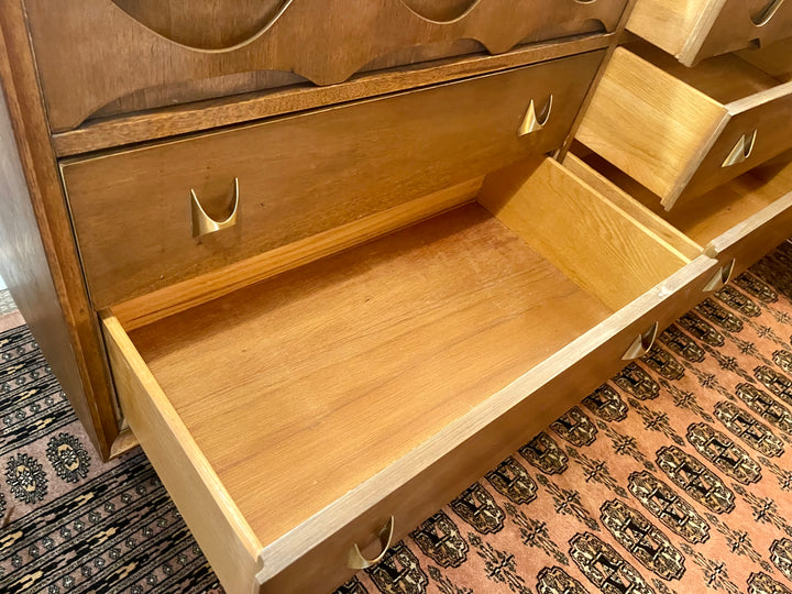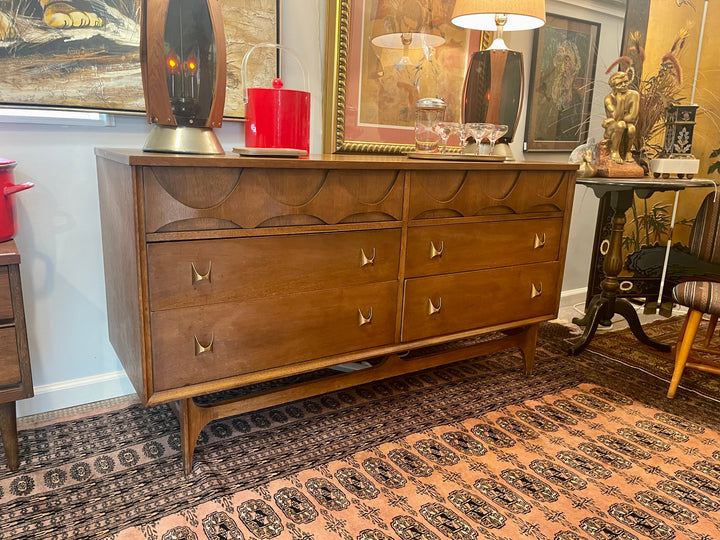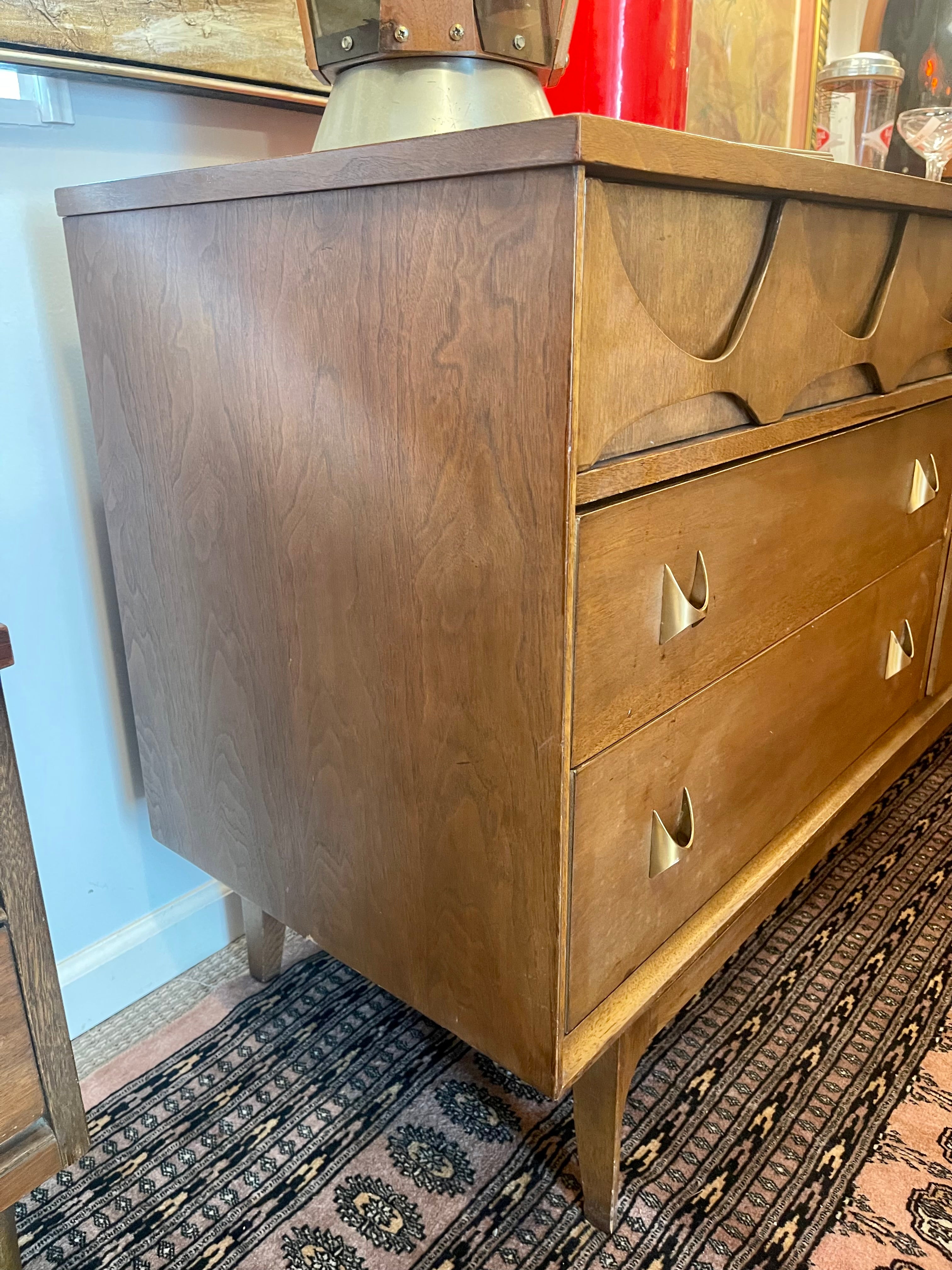 Perhaps the most sought after line on the market, Broyhill Brasilia pieces offer some of the most incredible features and elements of the mid century modern era. Based on the city of Brasilia, the capital of Brazil, the dramatic arches and hardware on these pieces of furniture are immediately recognizable. This Lowboy dresser is a great example, with the high arches dominating the top two drawers. Grab this one now because it won’t last long!