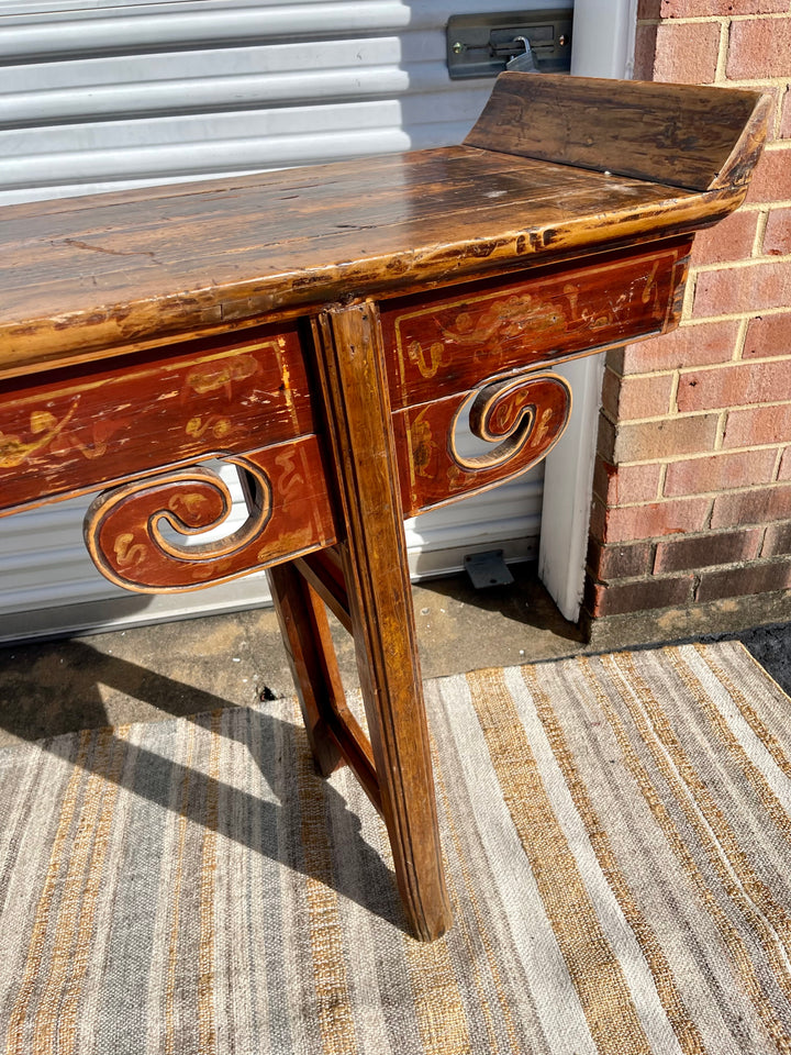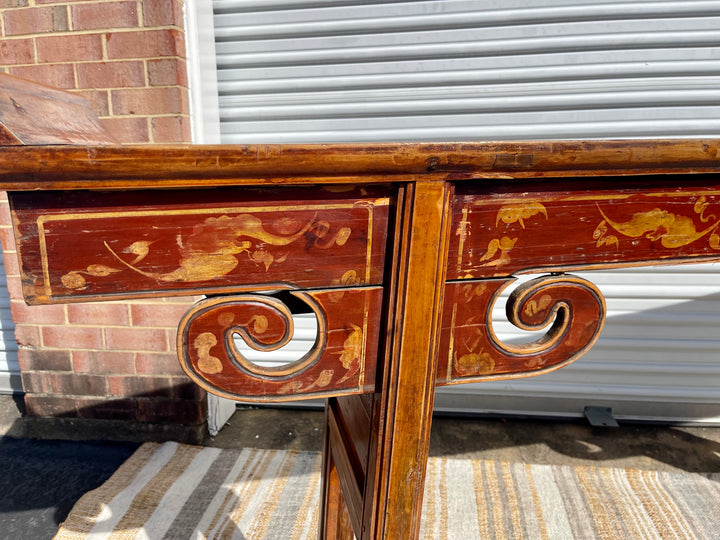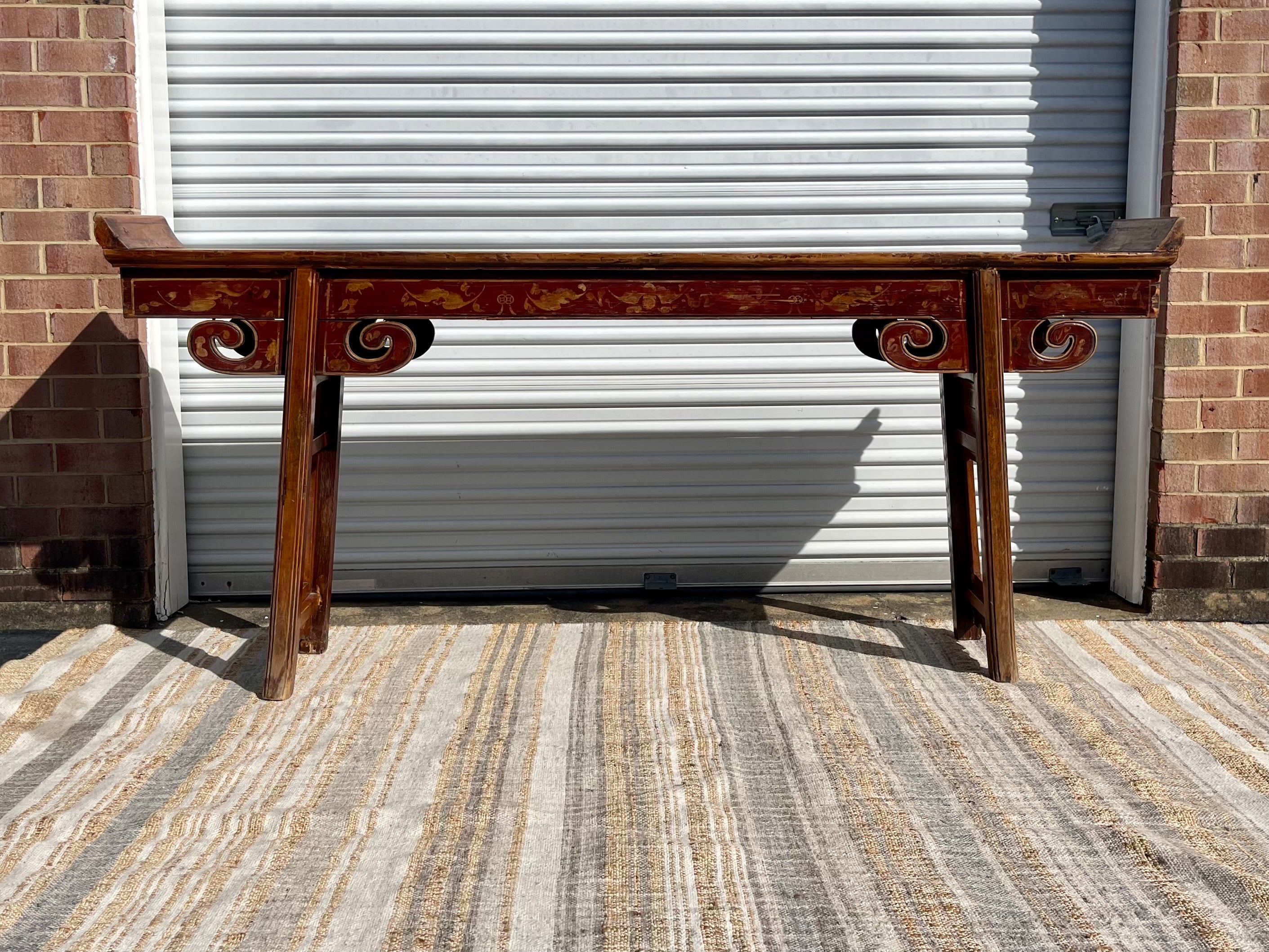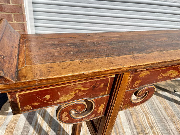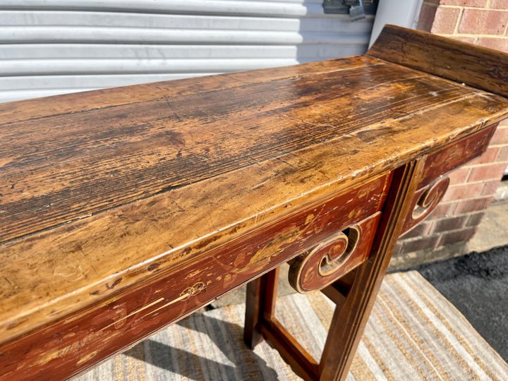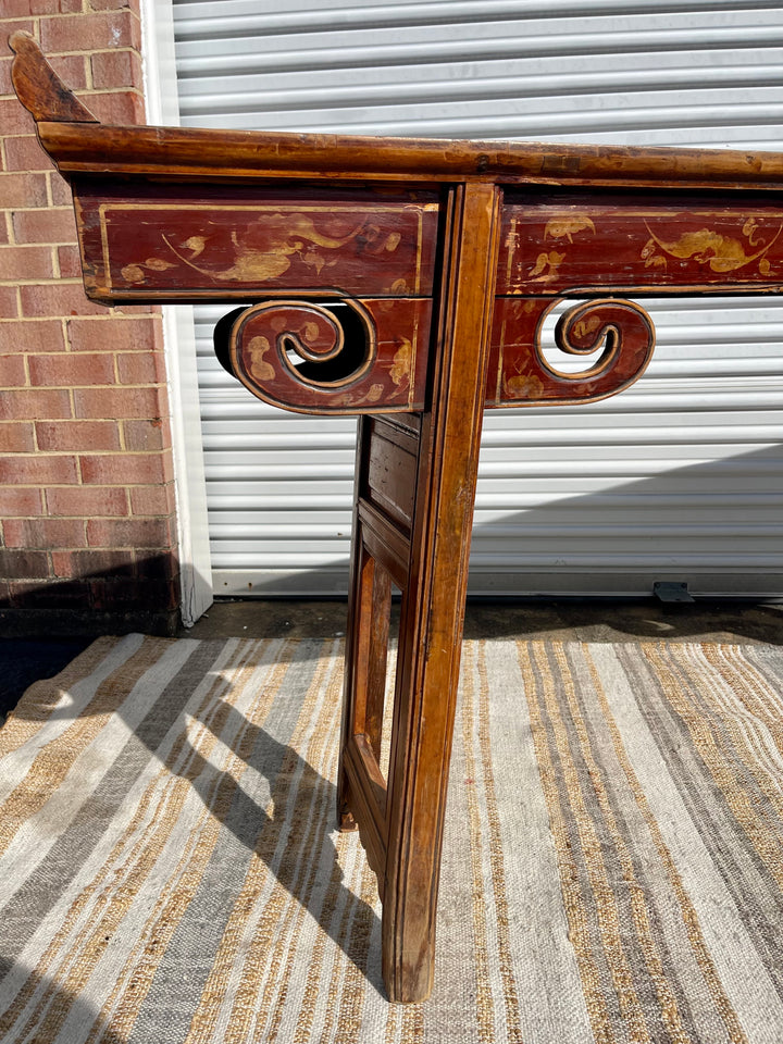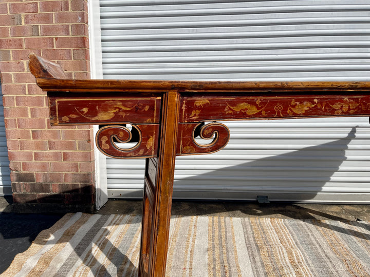 Rare antique Chinese painted altar table. Measuring seven feet long, this beautifully constructed piece of history adds a unique and timeless element to any room. Striking patina, antique Hand-painted and carved details all combine to set this piece apart. Would make a lovely console table.