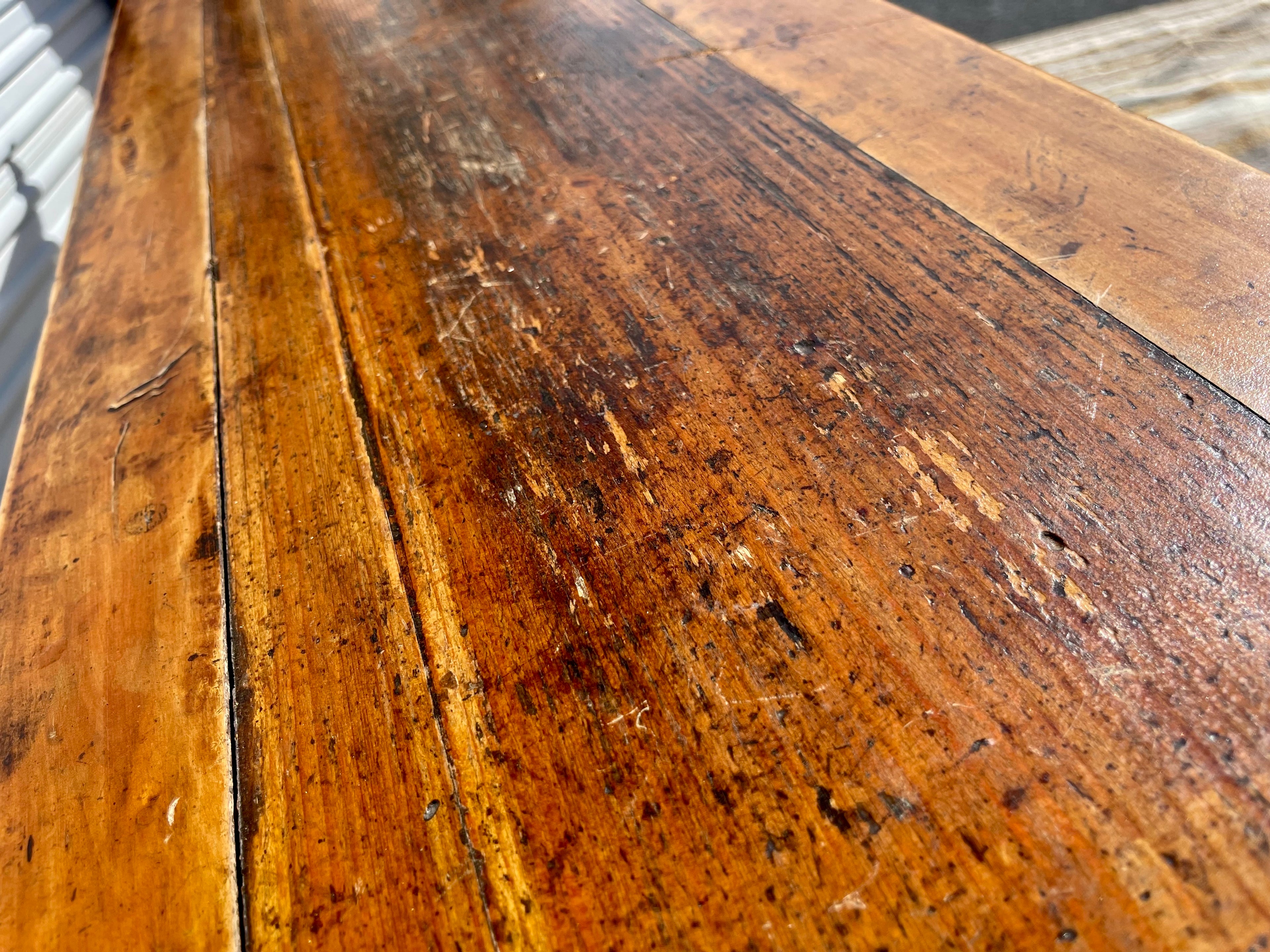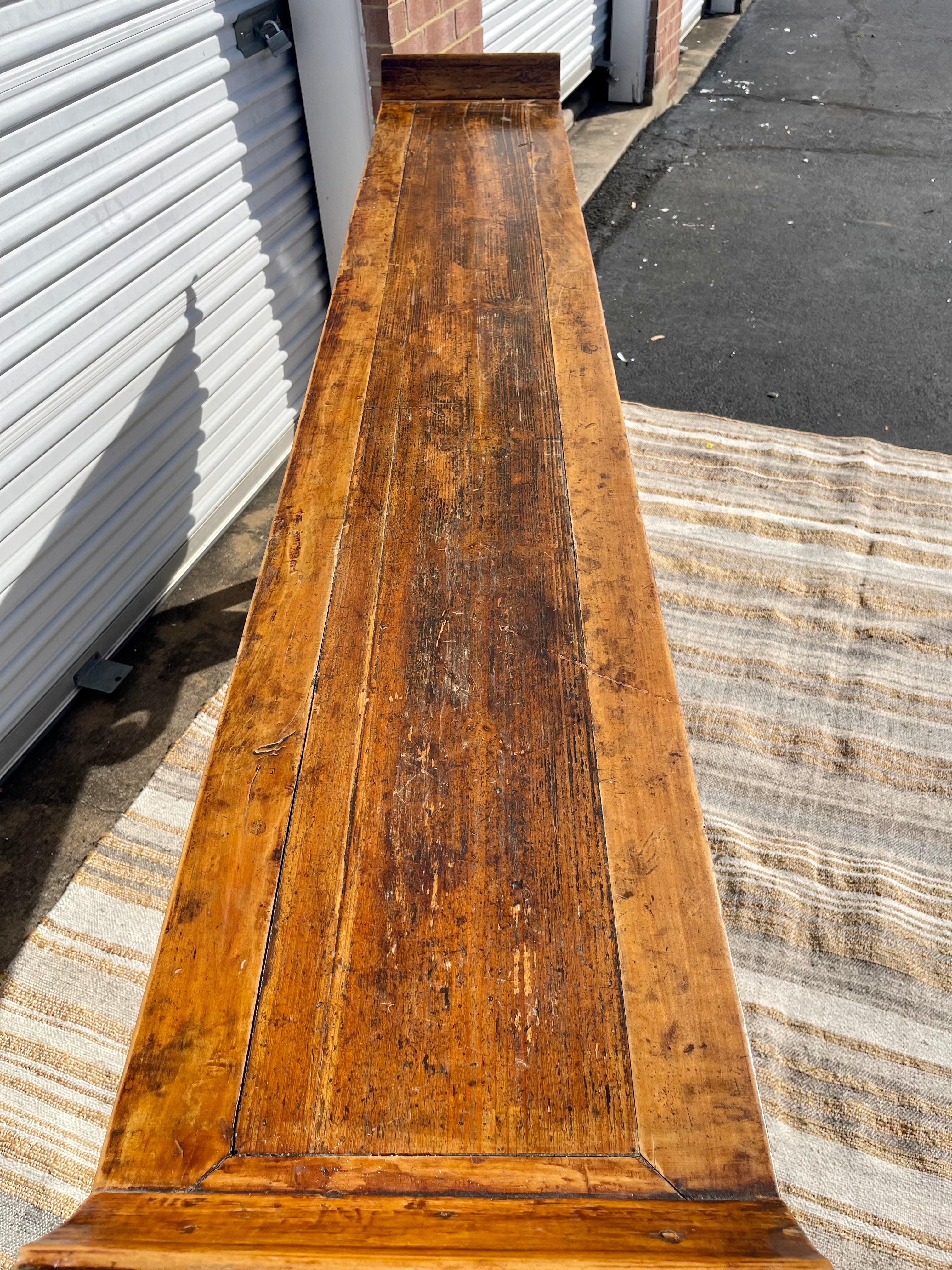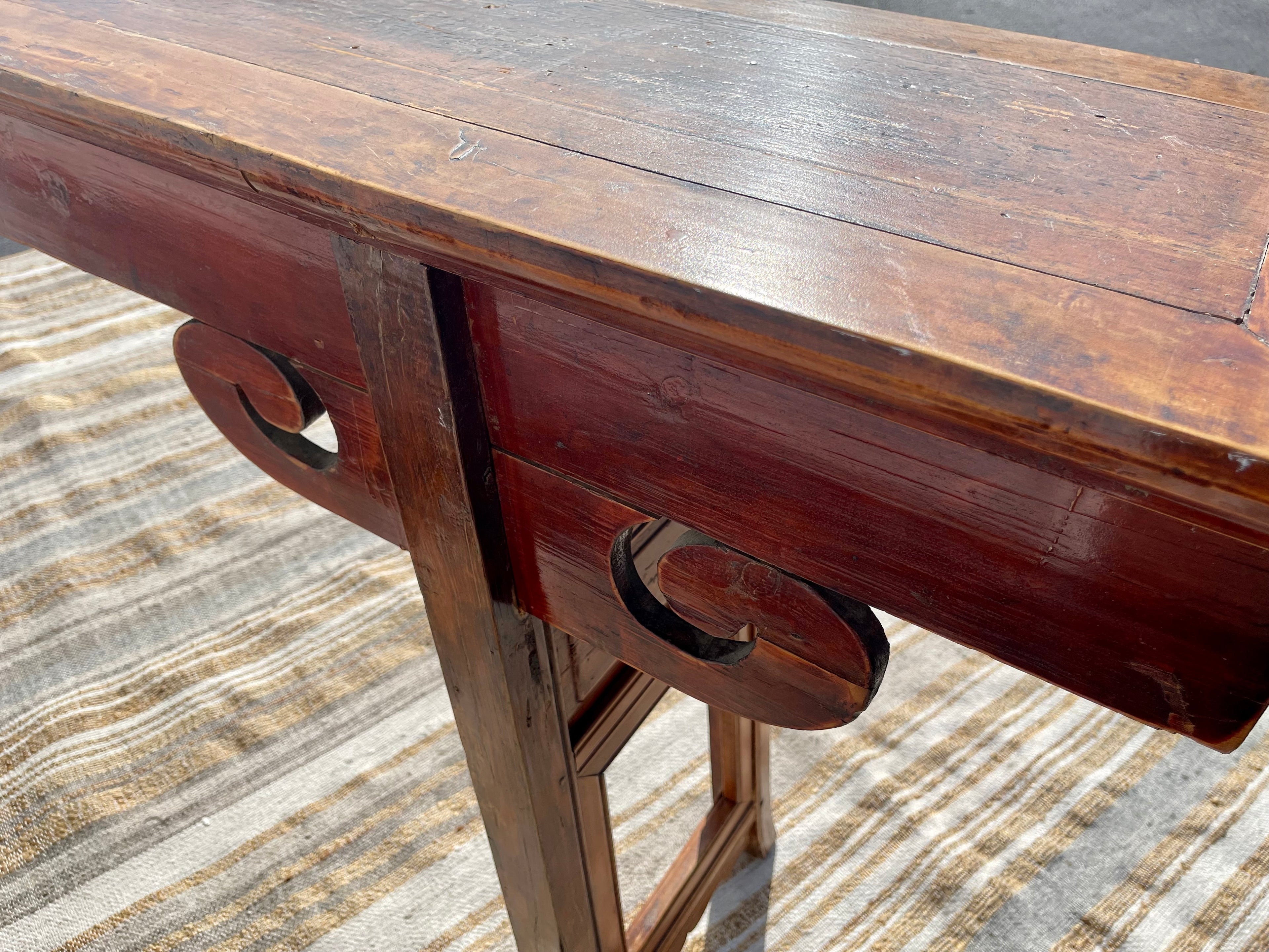 Rare antique Chinese painted altar table. Measuring seven feet long, this beautifully constructed piece of history adds a unique and timeless element to any room. Striking patina, antique Hand-painted and carved details all combine to set this piece apart. Would make a lovely console table.