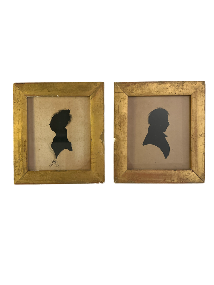 5-3/4” Framed Miniature Silhouette Sketches of Man and Woman in Gold Frames