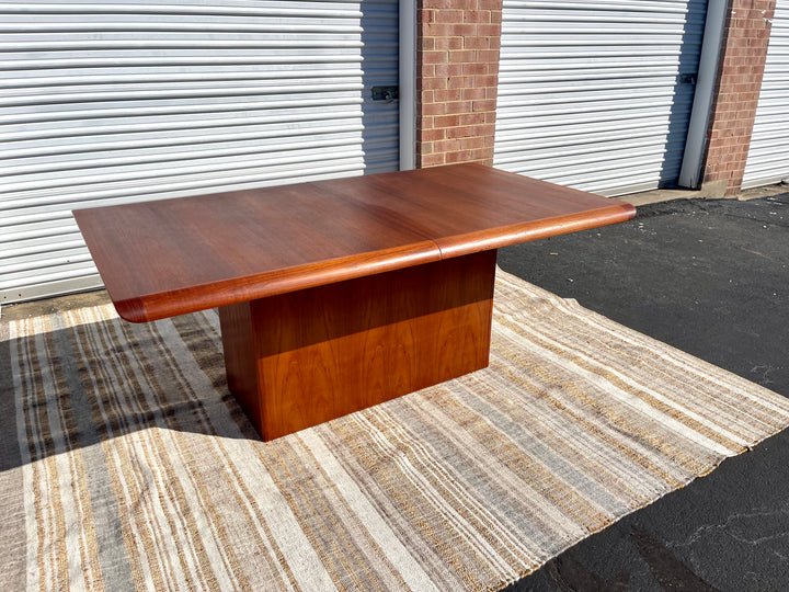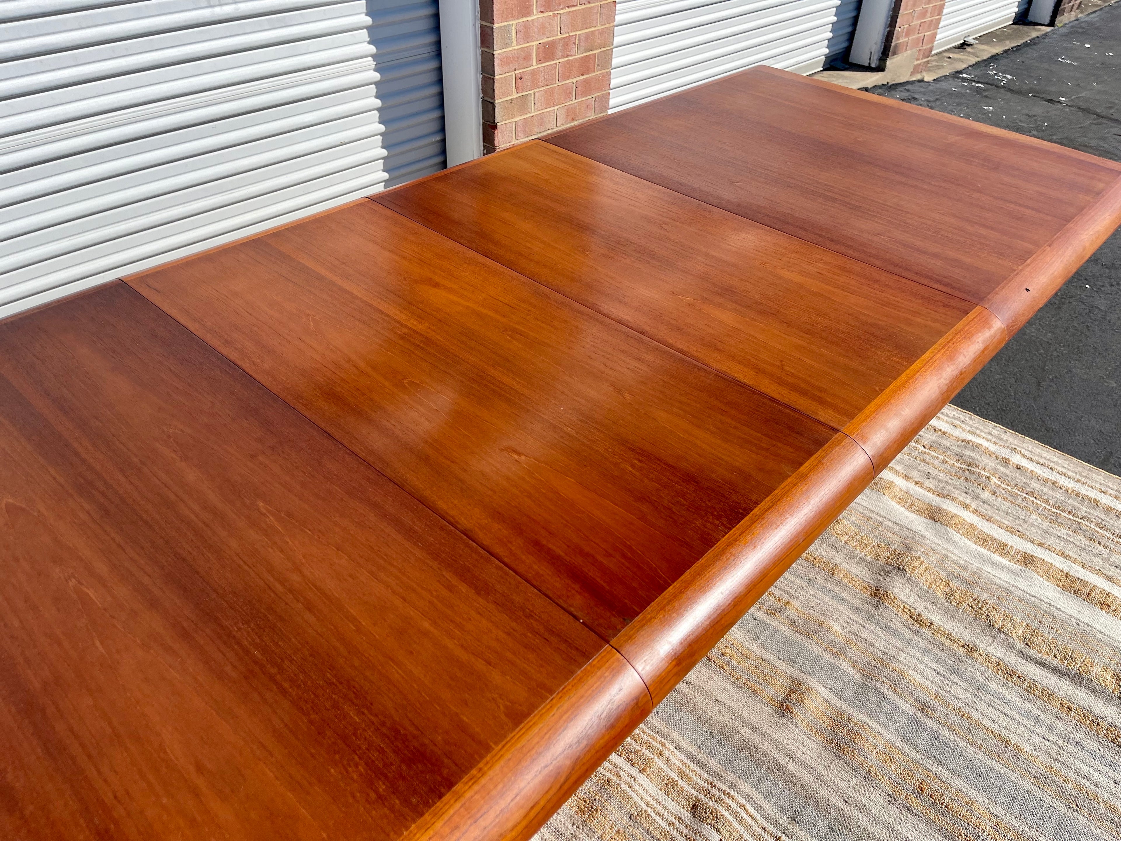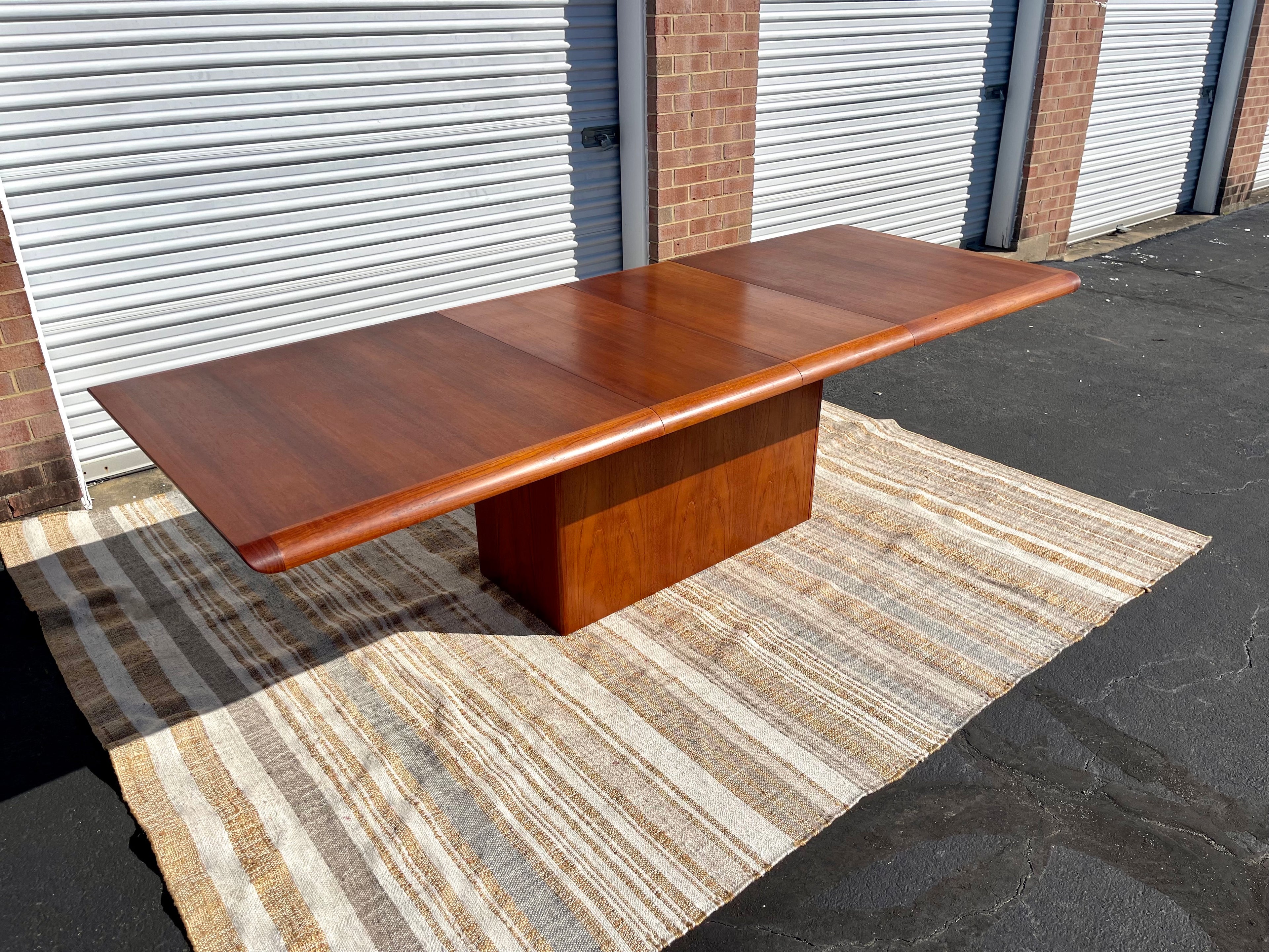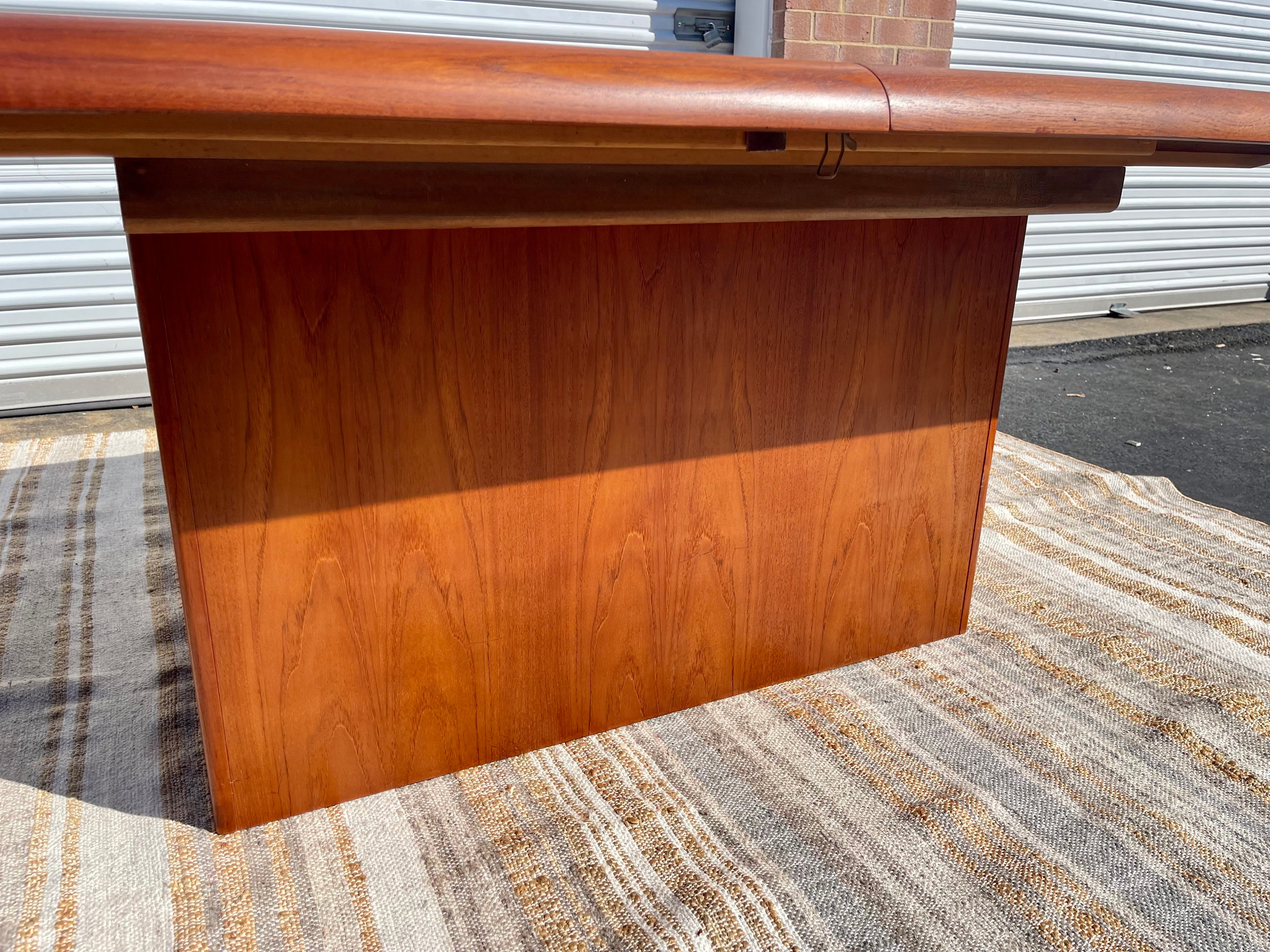 Fully restored teak dining table by Velje Stole. The depth and variance in the teak wood grain is striking. Wide tapered solid teak edges set this piece apart. The plinth base is also a rarer offering from the company. Two large leaves make this table perfect for any occasion. Not many of these around!