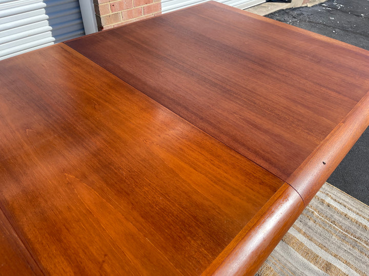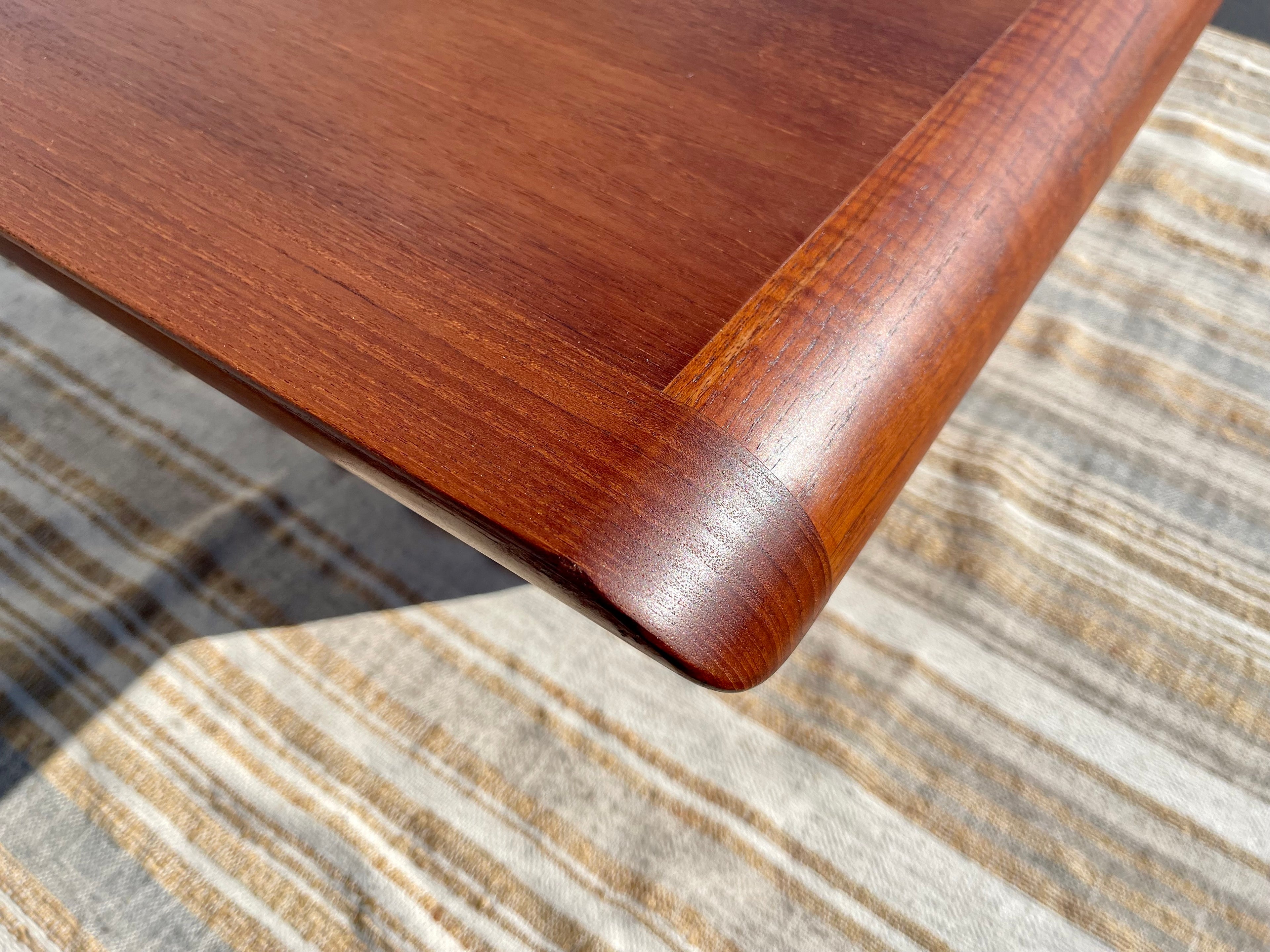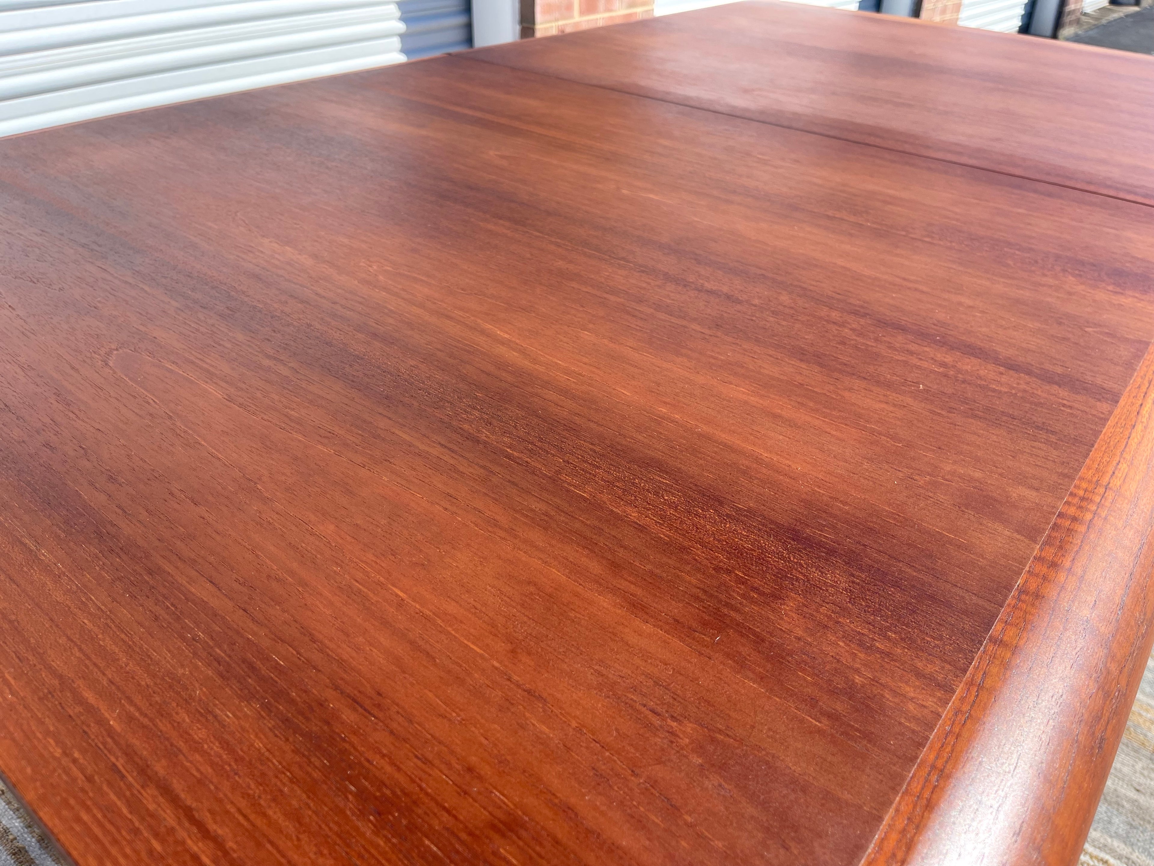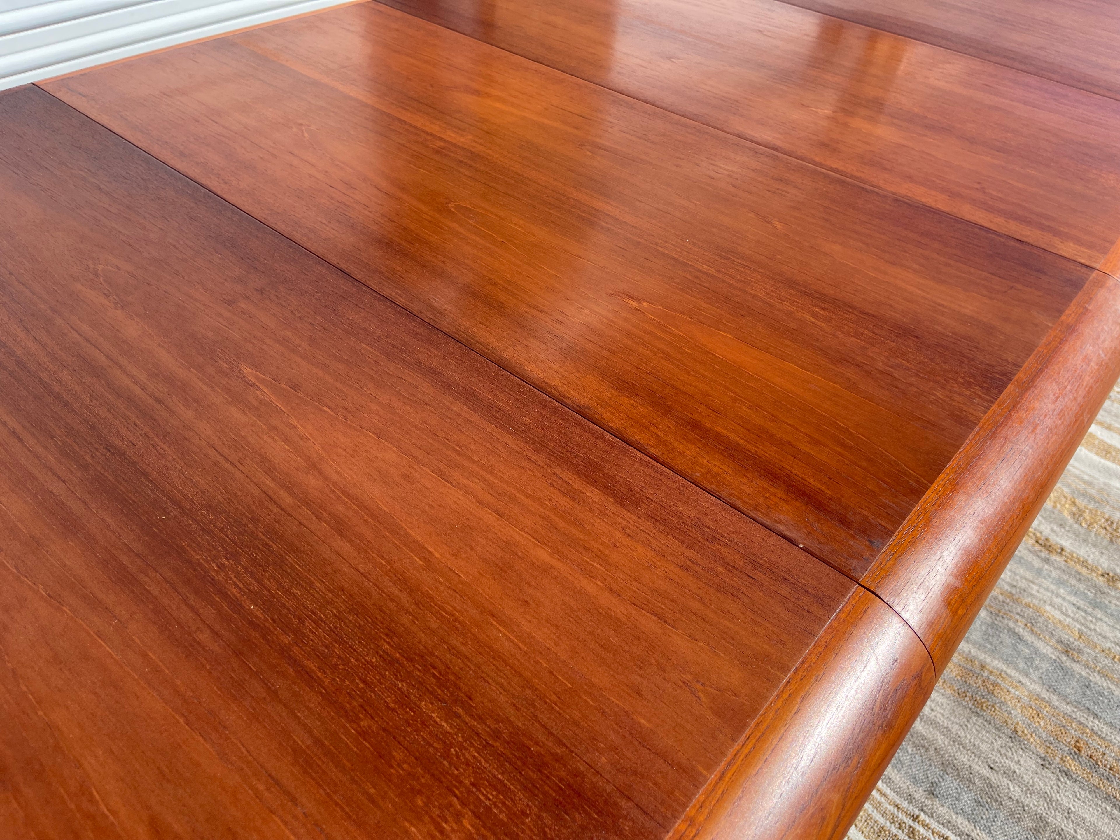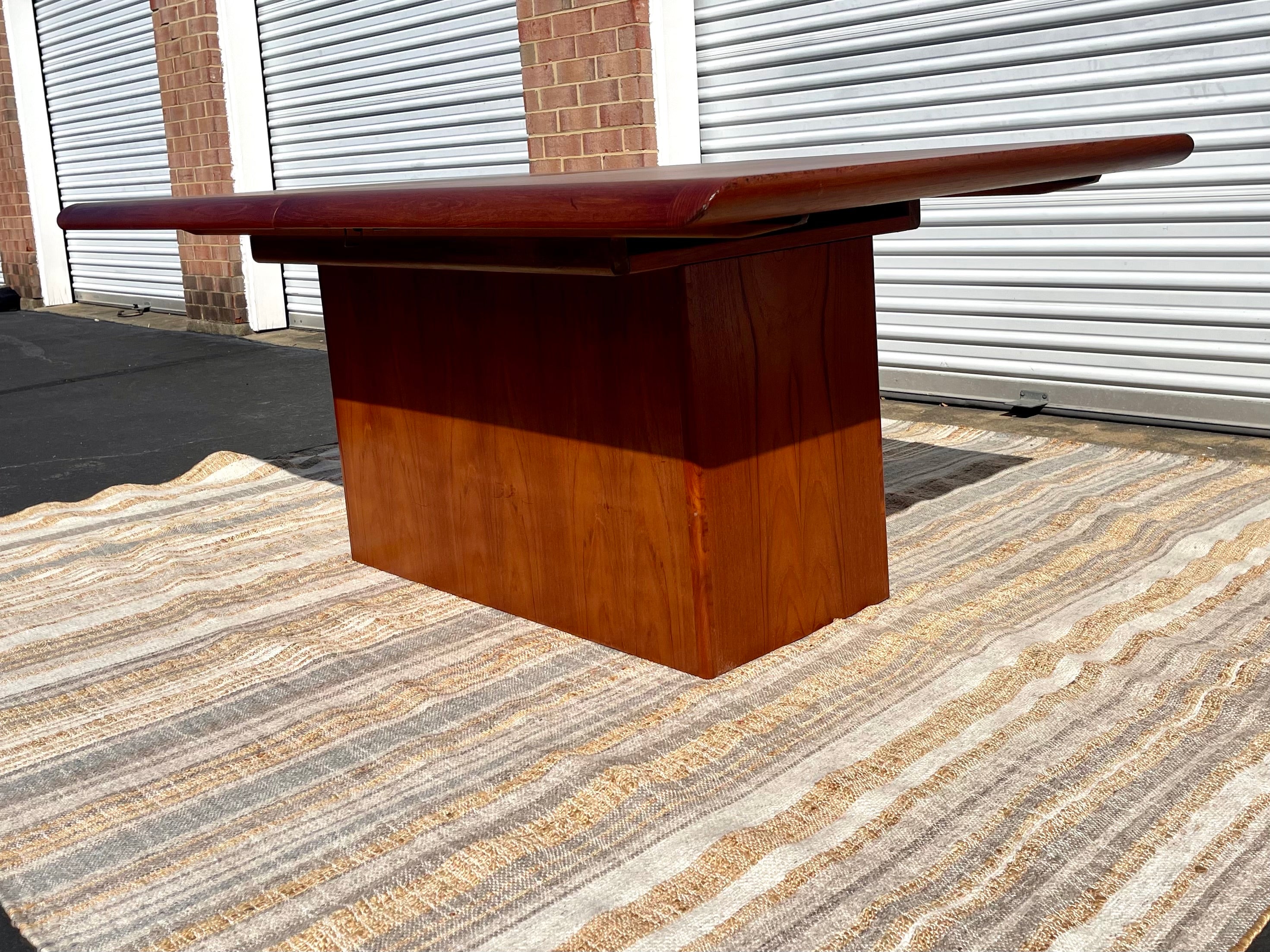 Fully restored teak dining table by Velje Stole. The depth and variance in the teak wood grain is striking. Wide tapered solid teak edges set this piece apart. The plinth base is also a rarer offering from the company. Two large leaves make this table perfect for any occasion. Not many of these around!