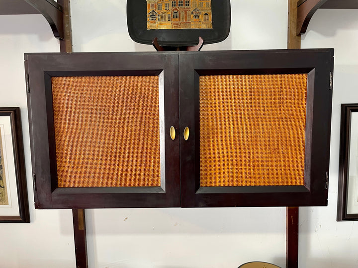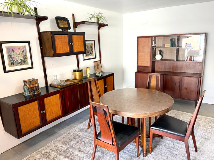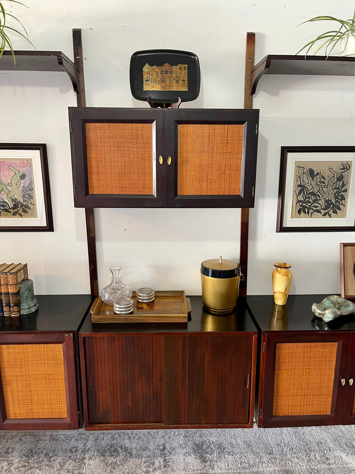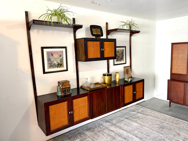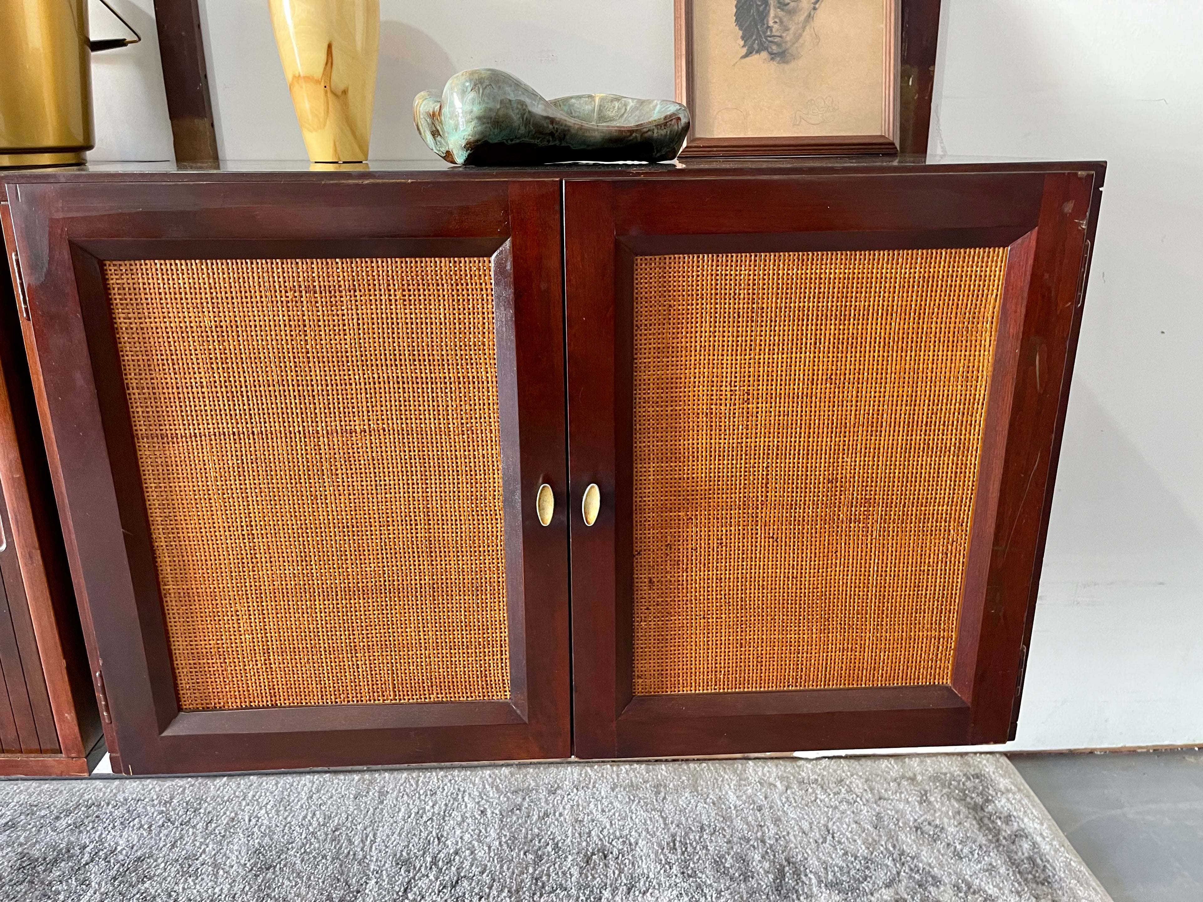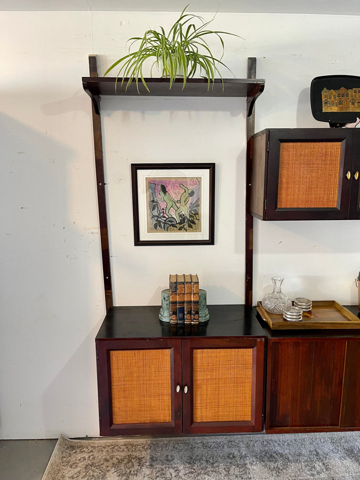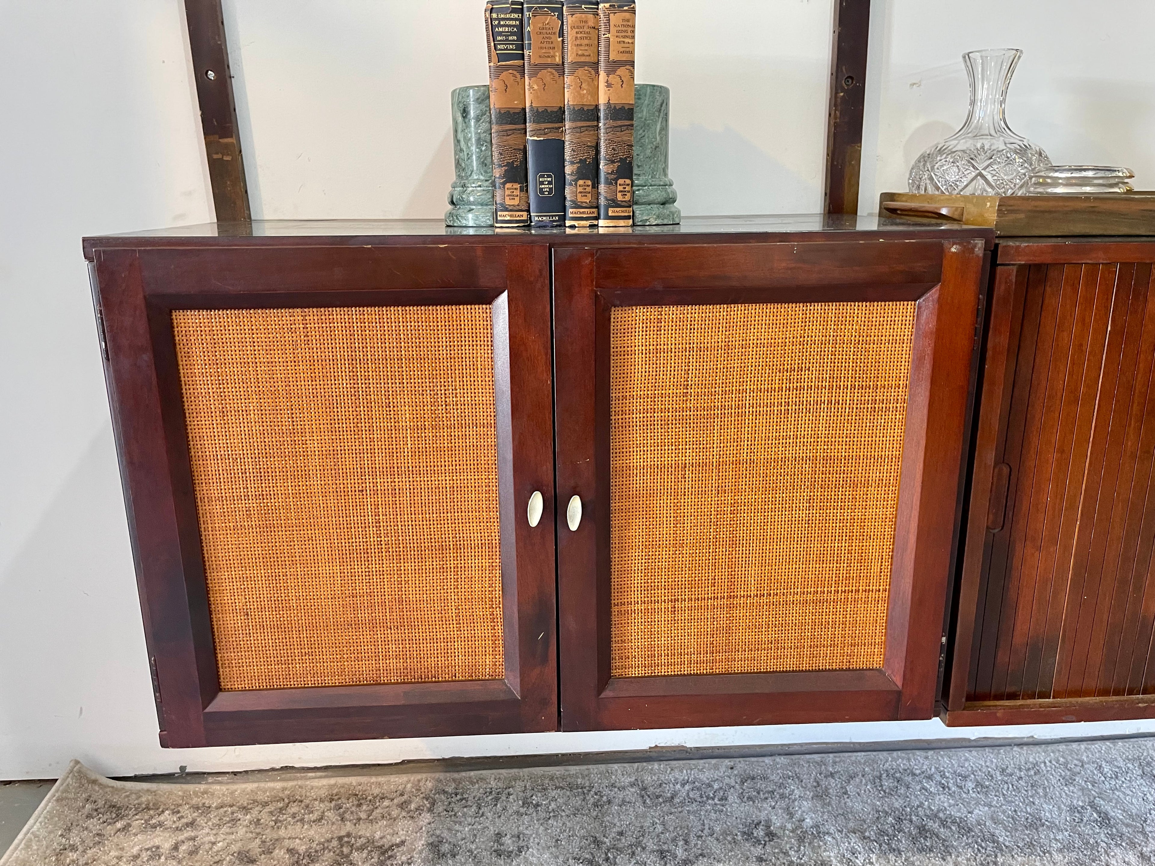 This set features beautifully crafted caned fronts on three of the units and a fourth unit with sliding slatted wood doors. There are also two additional shelves to complete the set. Each wall unit also has several shelves which can be arranged or removed for your specific needs.