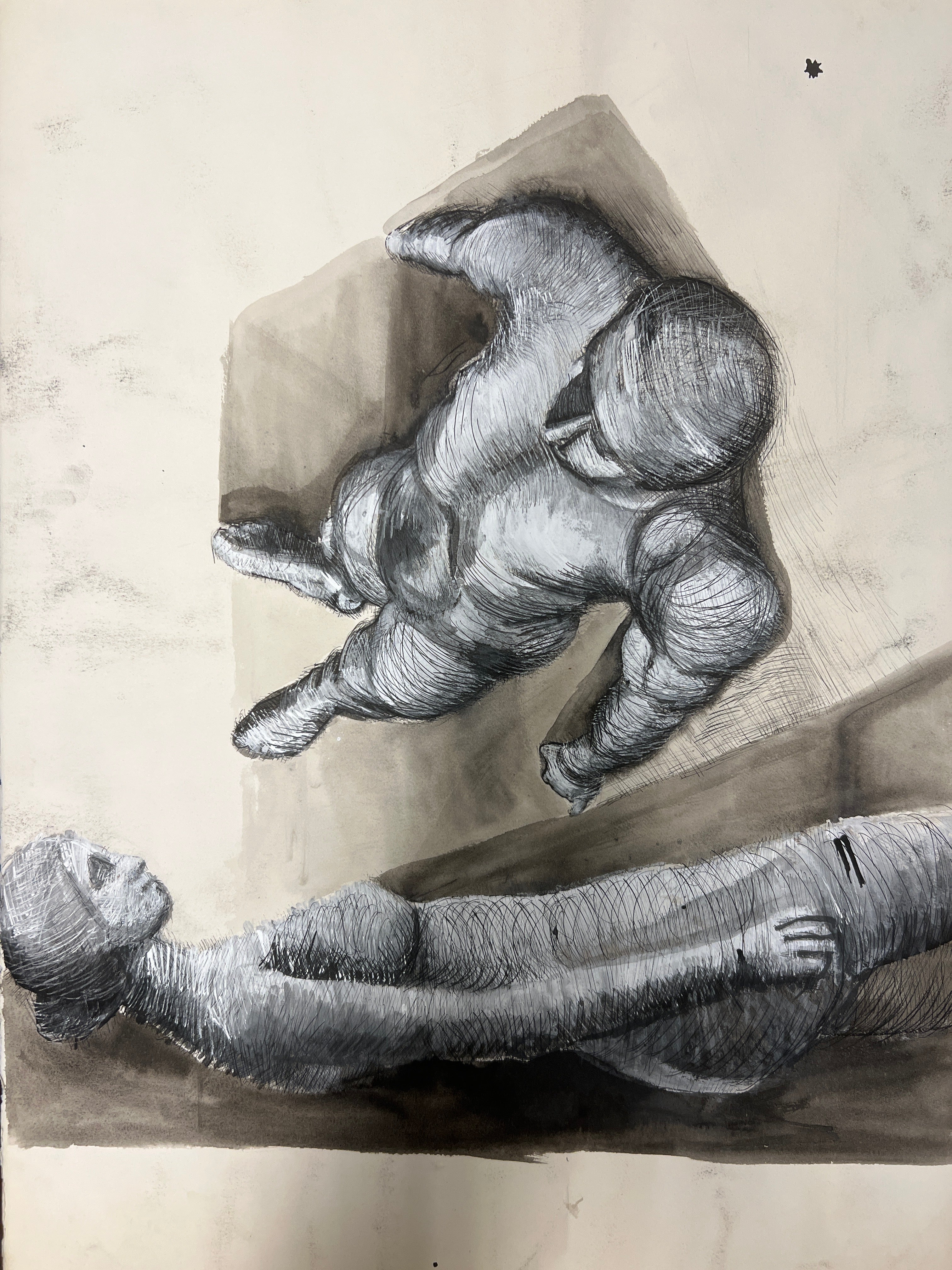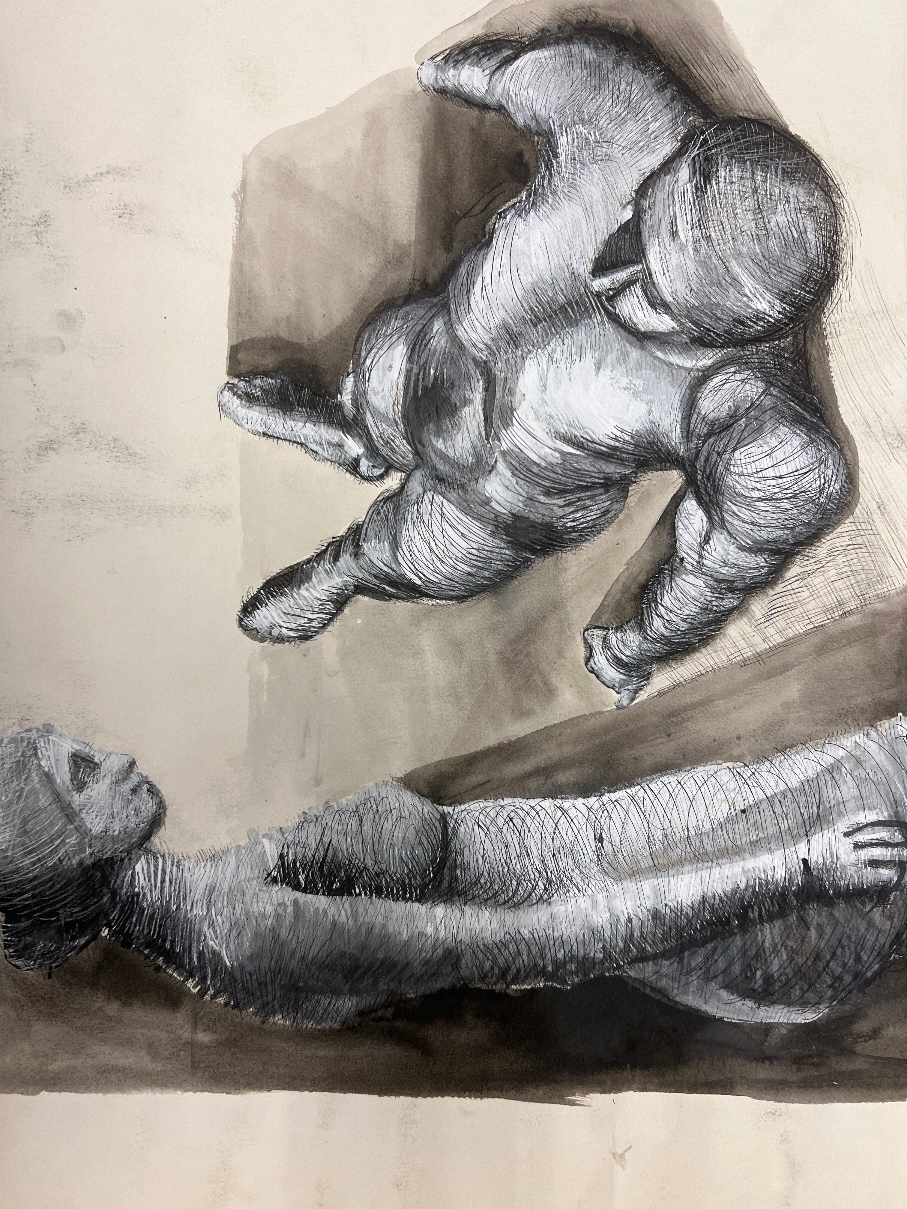 This piece is charcoal and mixed media on paper, unframed. Shipping available.