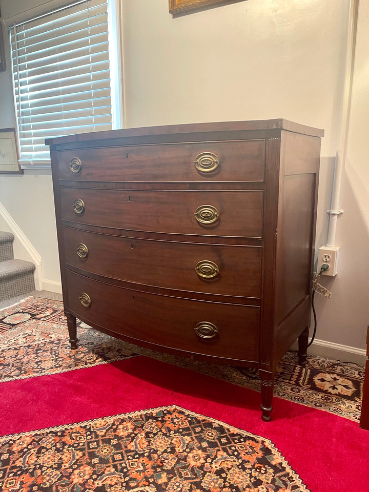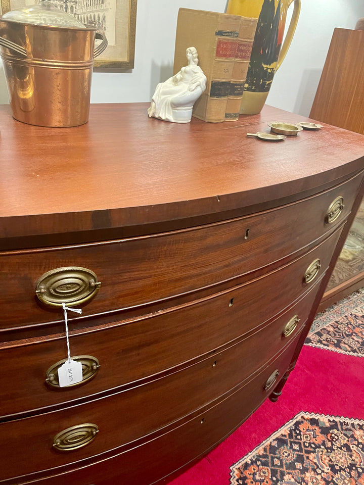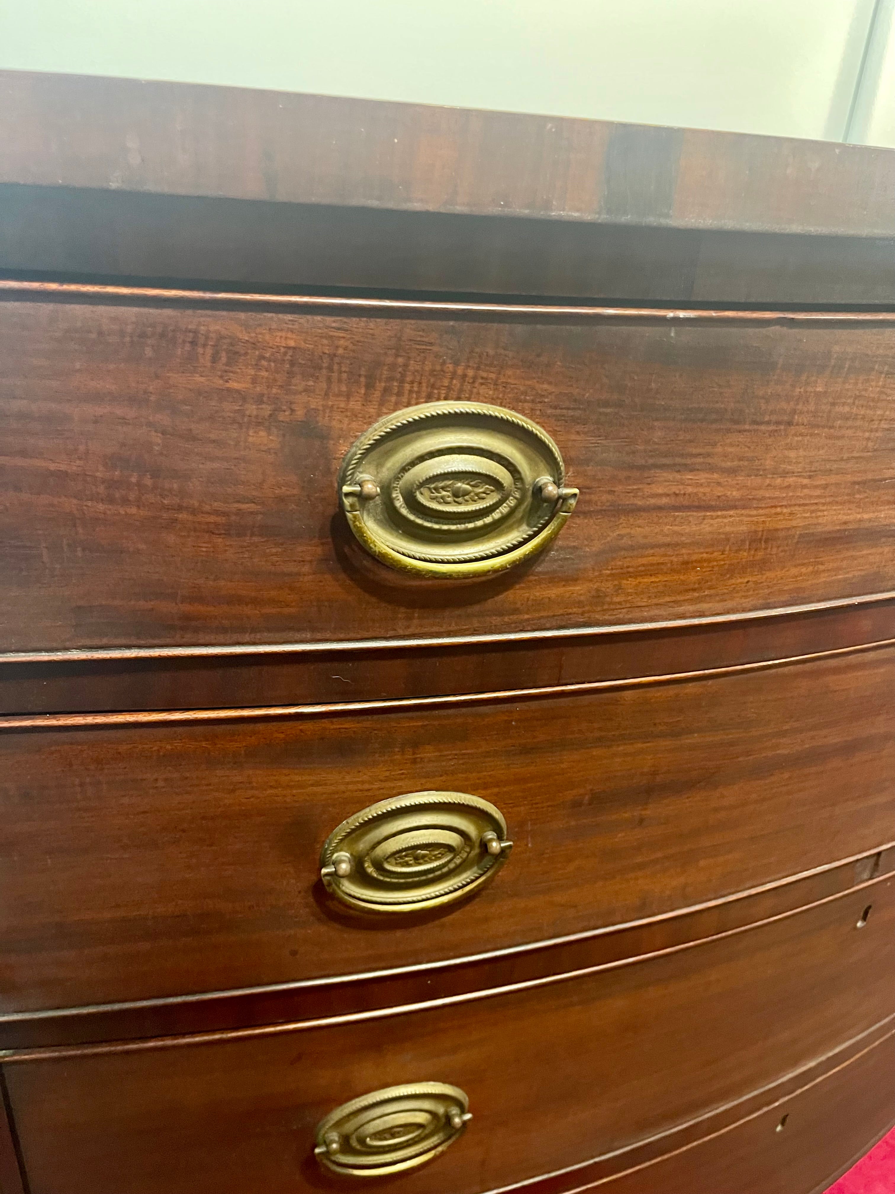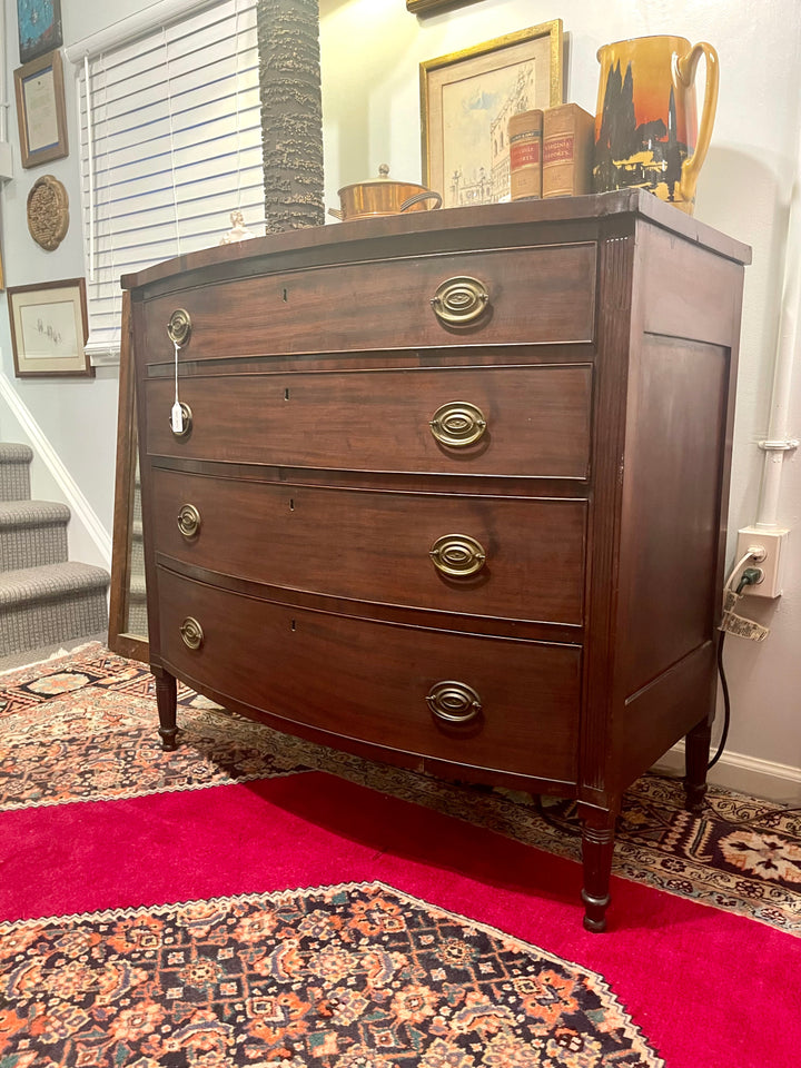 There is simply no replacing the richness and beauty of an authentic antique piece of mahogany furniture. This example, likely made in the late 19th century, is no exception. This chest of drawers is in the “American Empire” style, which drew inspiration from 17th and 18th century French design.