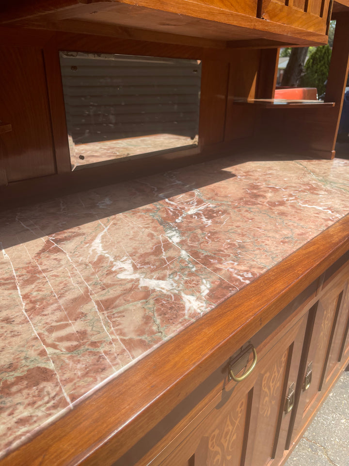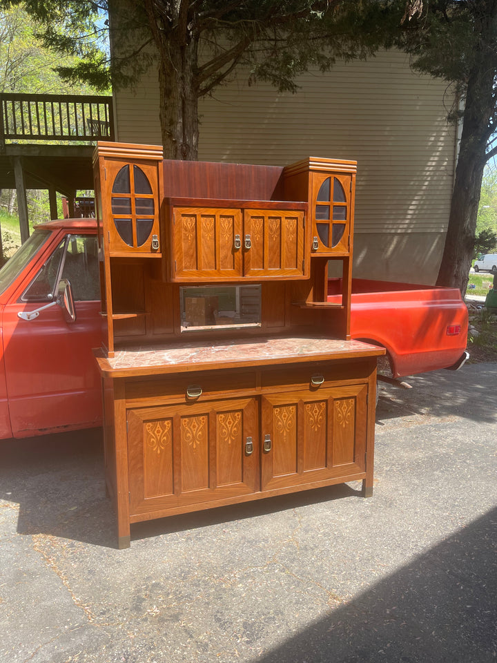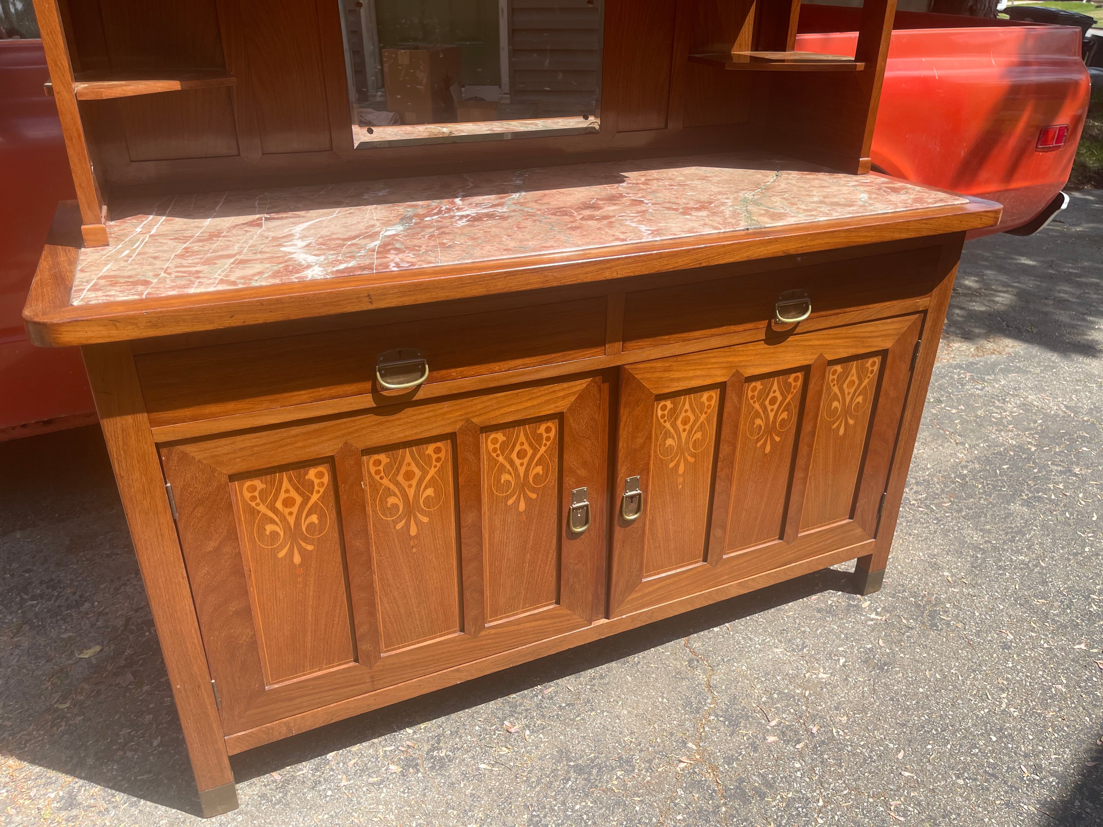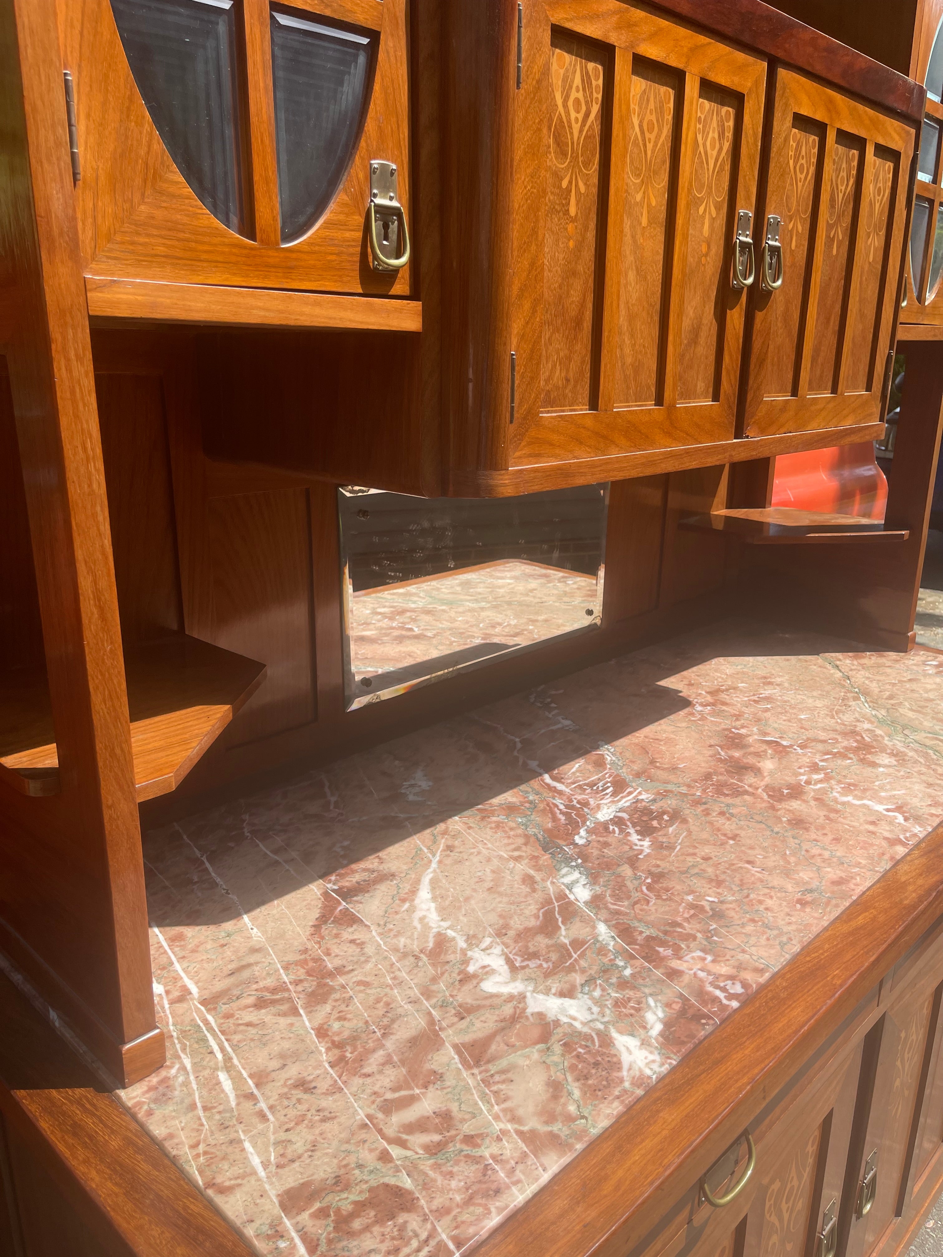 Beautifully crafted antique German buffet. Arts and crafts style. Beveled glass windows, parquetry inlay and a beautiful marble top make this a true statement piece. Maximum storage and functionality. Has original keys. 37 inches to counter height.