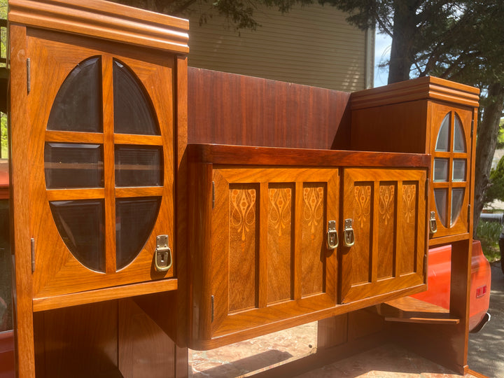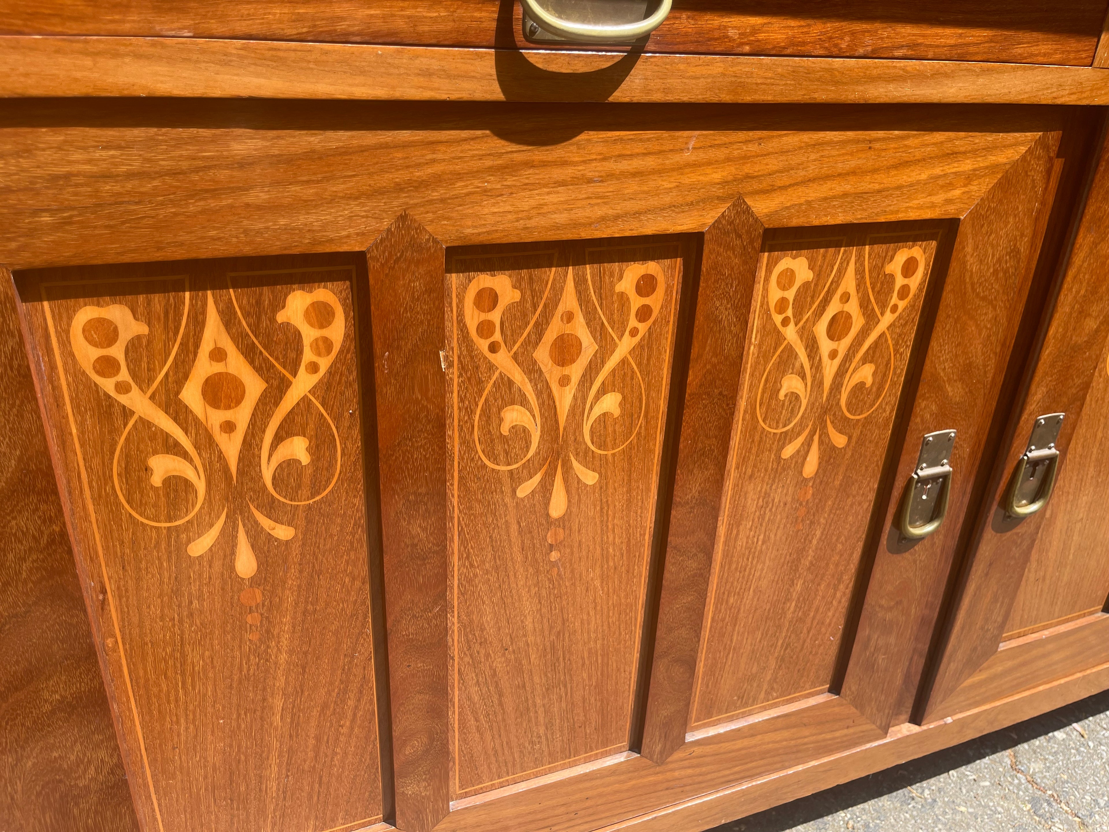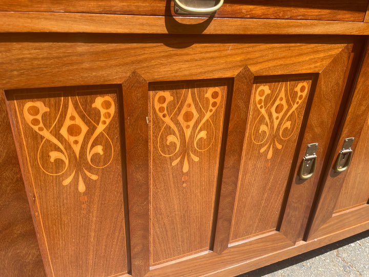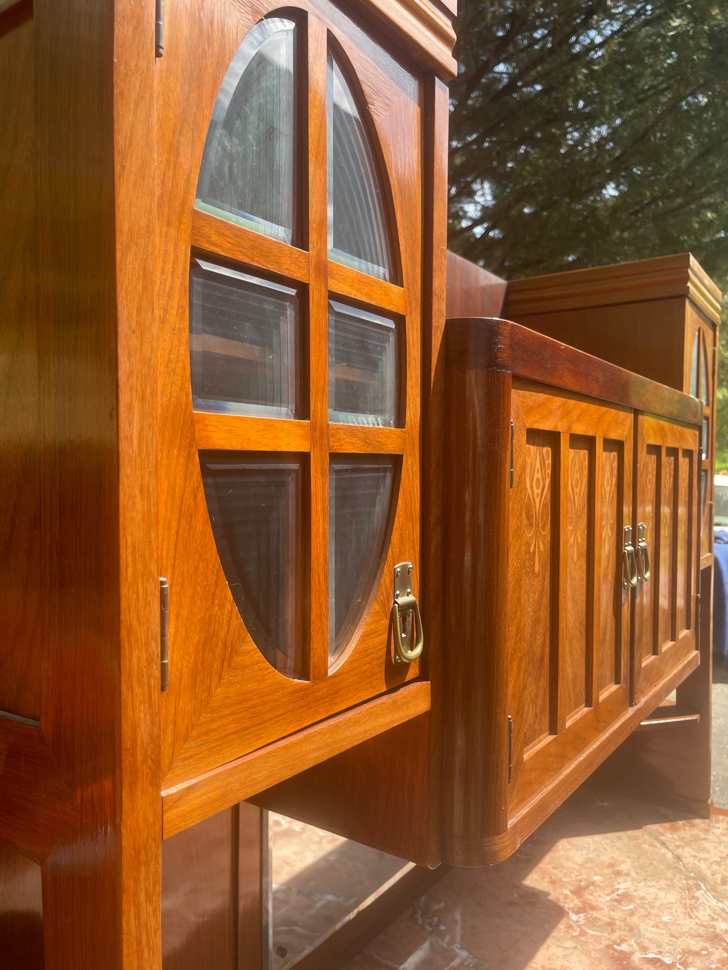 Beautifully crafted antique German buffet. Arts and crafts style. Beveled glass windows, parquetry inlay and a beautiful marble top make this a true statement piece. Maximum storage and functionality. Has original keys. 37 inches to counter height.