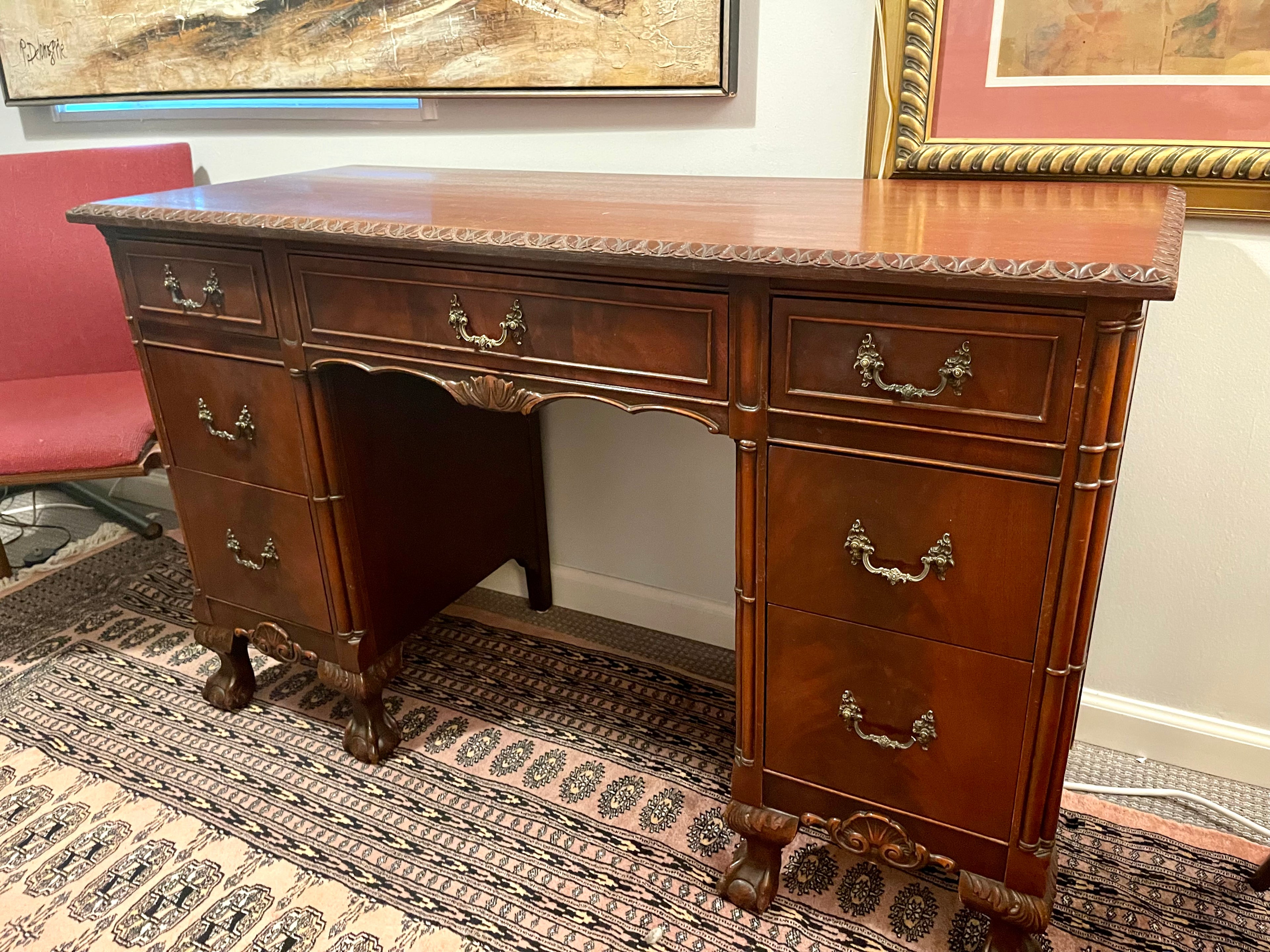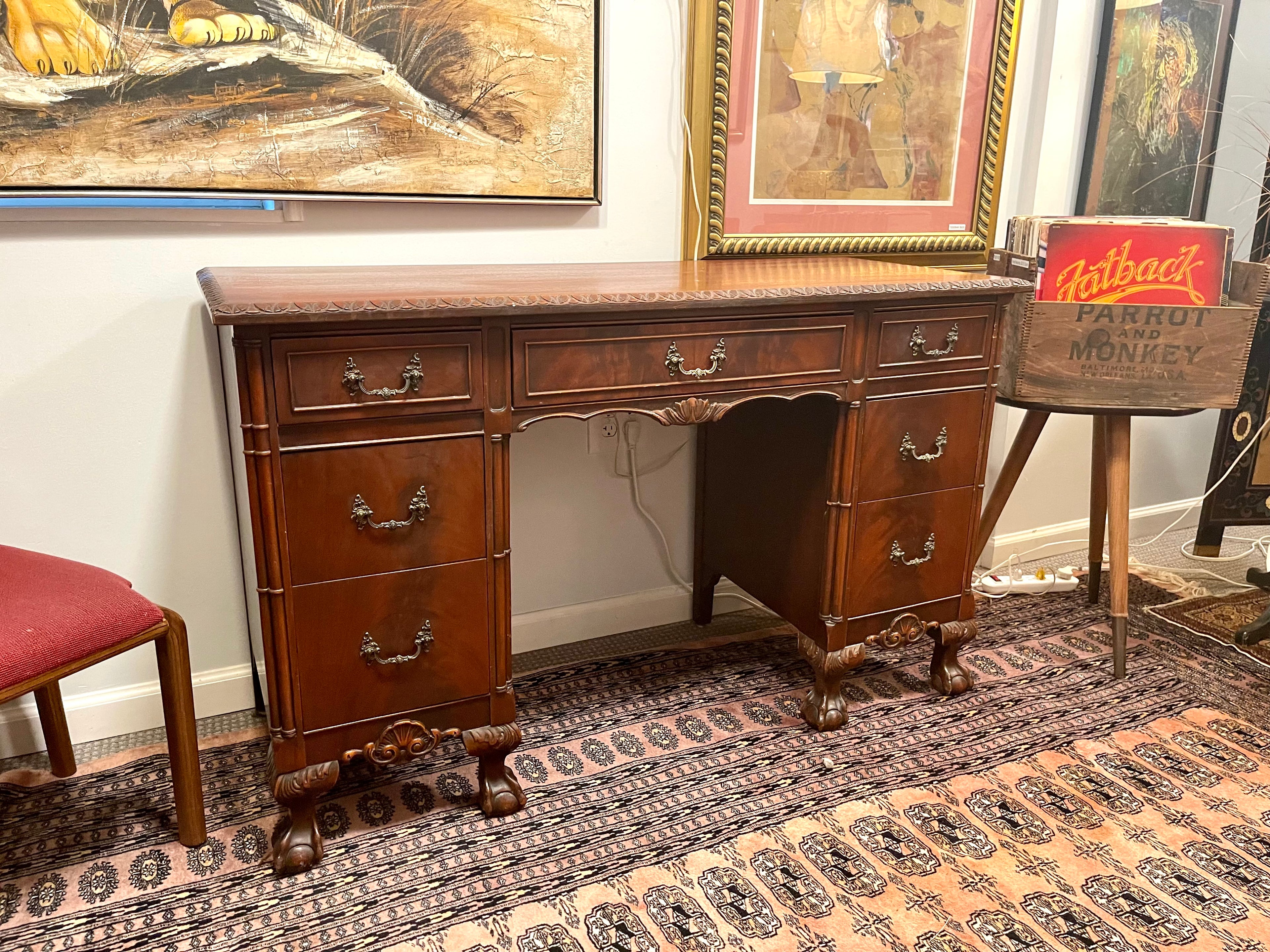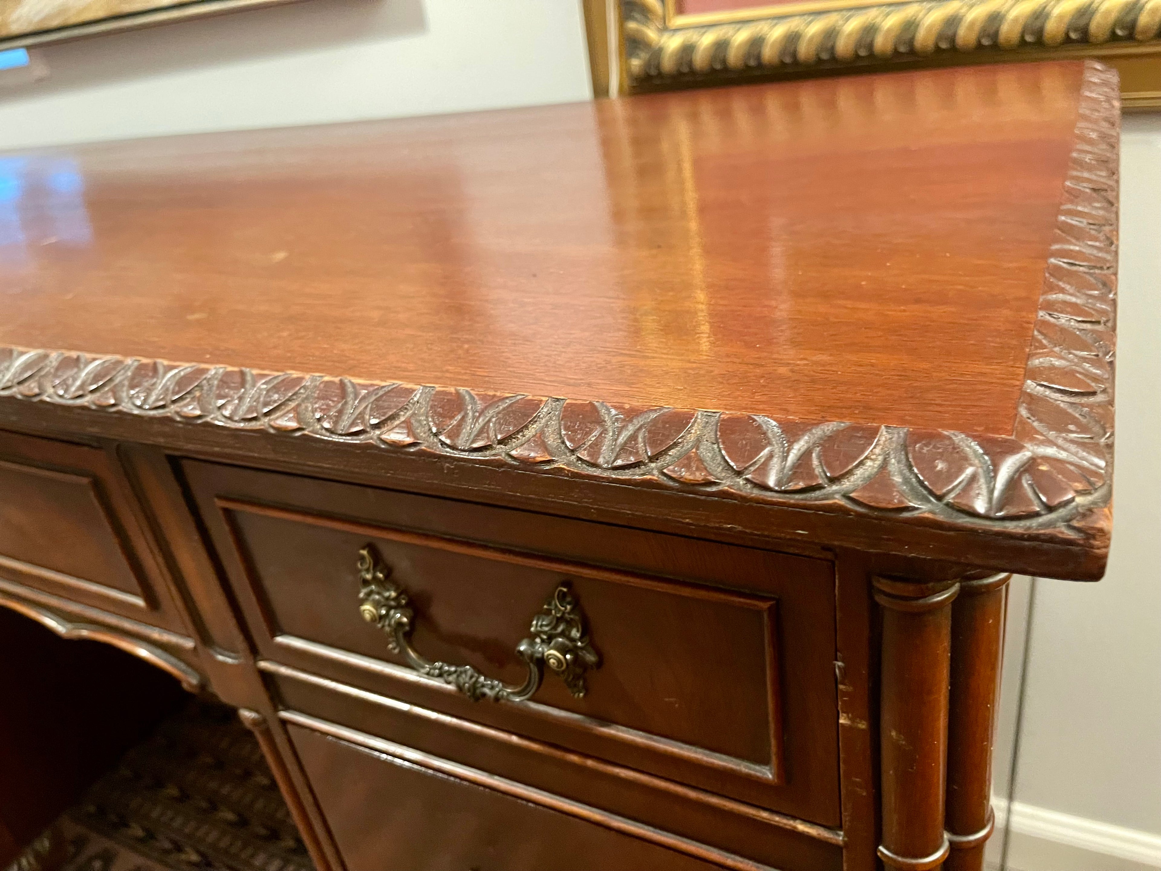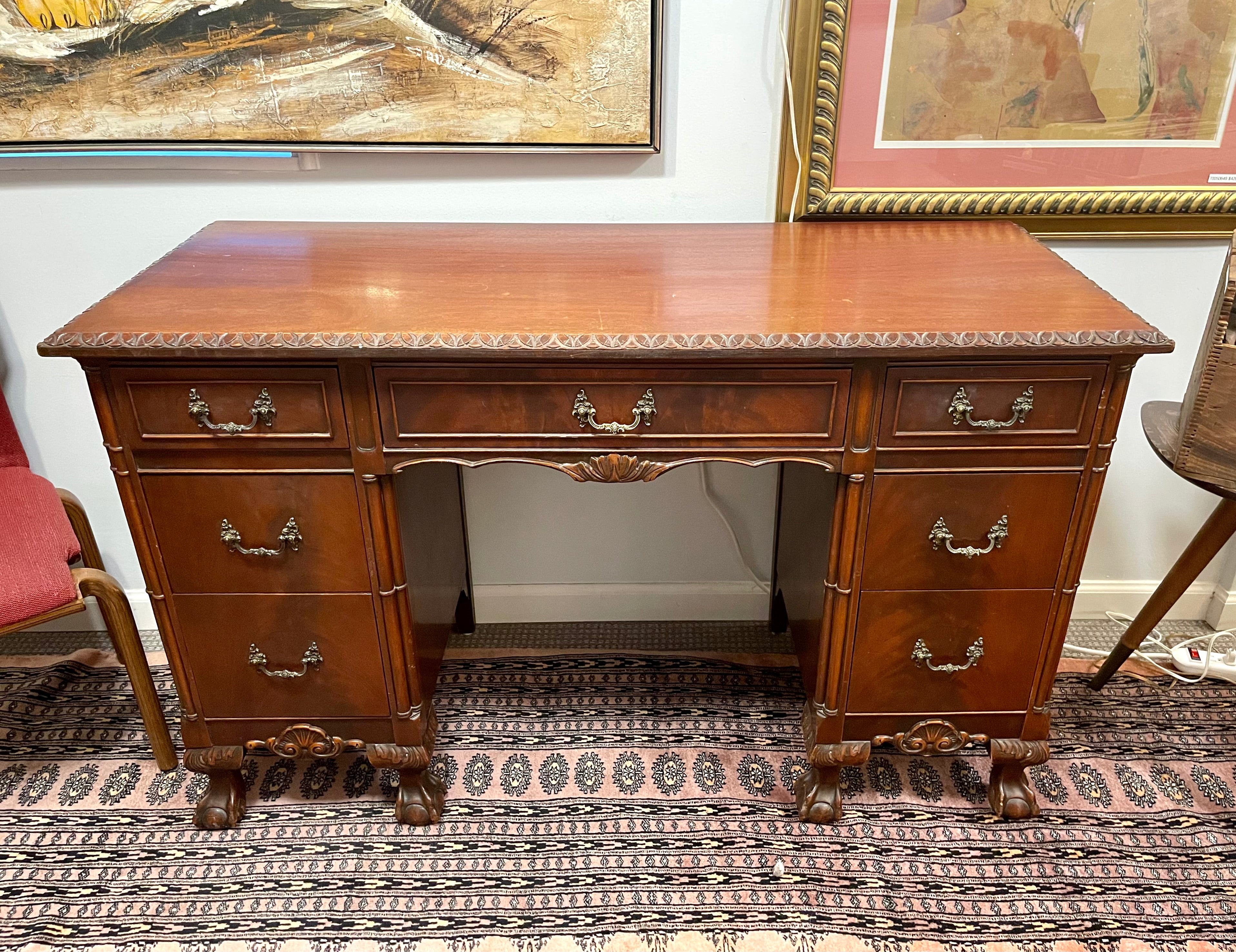Functional and stylish, this petite Georgian-style writing desk would make a lovely addition to an entryway, bedroom, or home office. Add a lovely wall-mounted mirror for a perfect bedroom vanity. This solid wood hand-carved mahogany desk features columned details and clawed feet which add a classically designed feel. Ample drawers for storage and convenience.