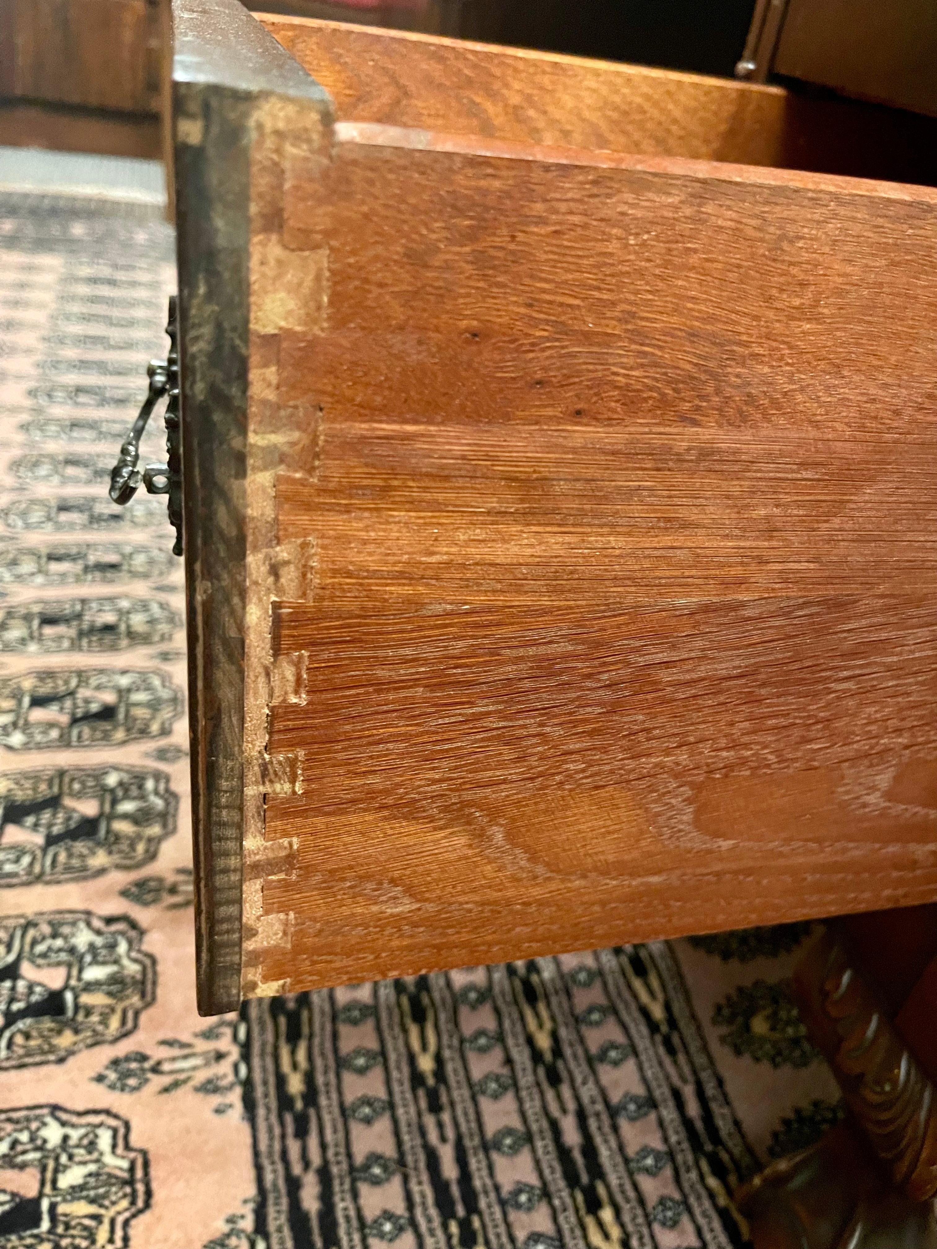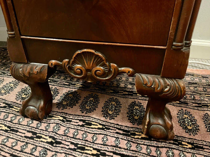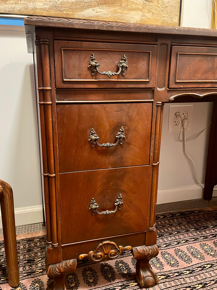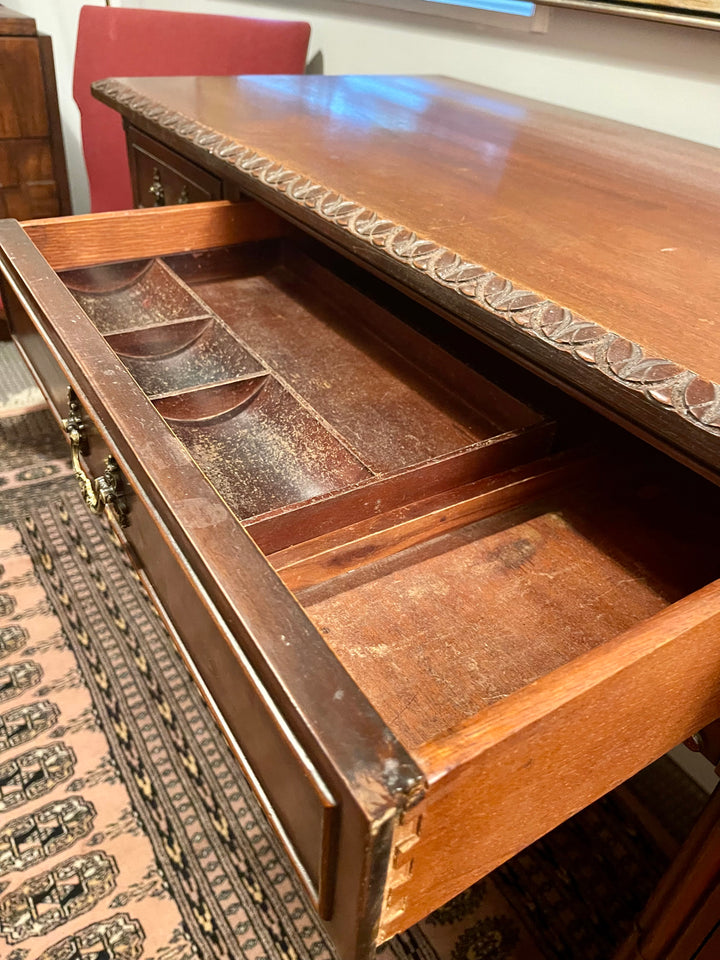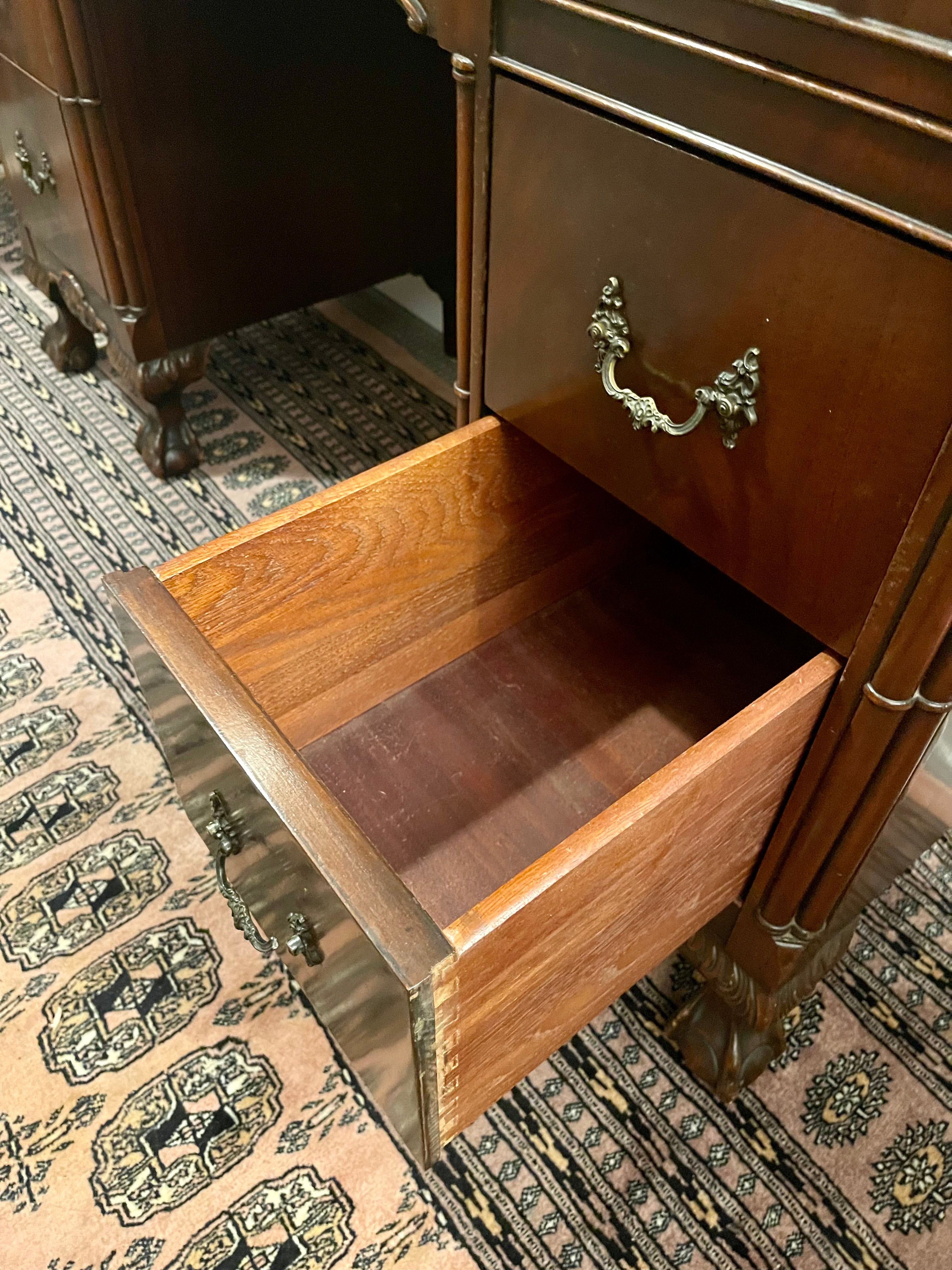 Functional and stylish, this petite Georgian-style writing desk would make a lovely addition to an entryway, bedroom, or home office. Add a lovely wall-mounted mirror for a perfect bedroom vanity. This solid wood hand-carved mahogany desk features columned details and clawed feet which add a classically designed feel. Ample drawers for storage and convenience.