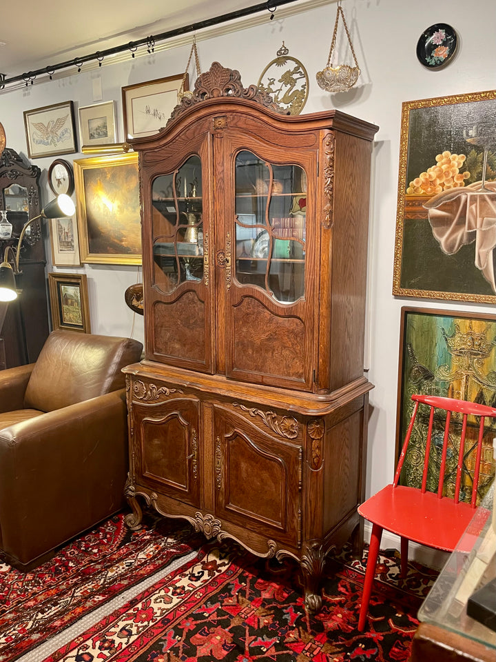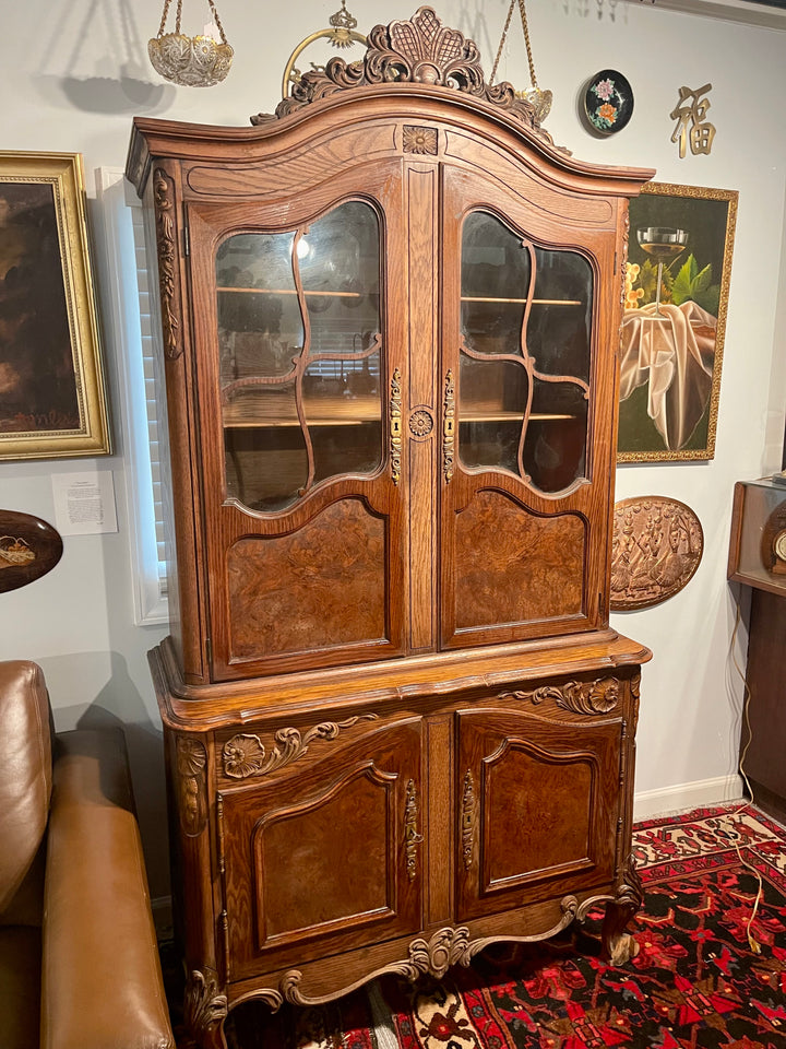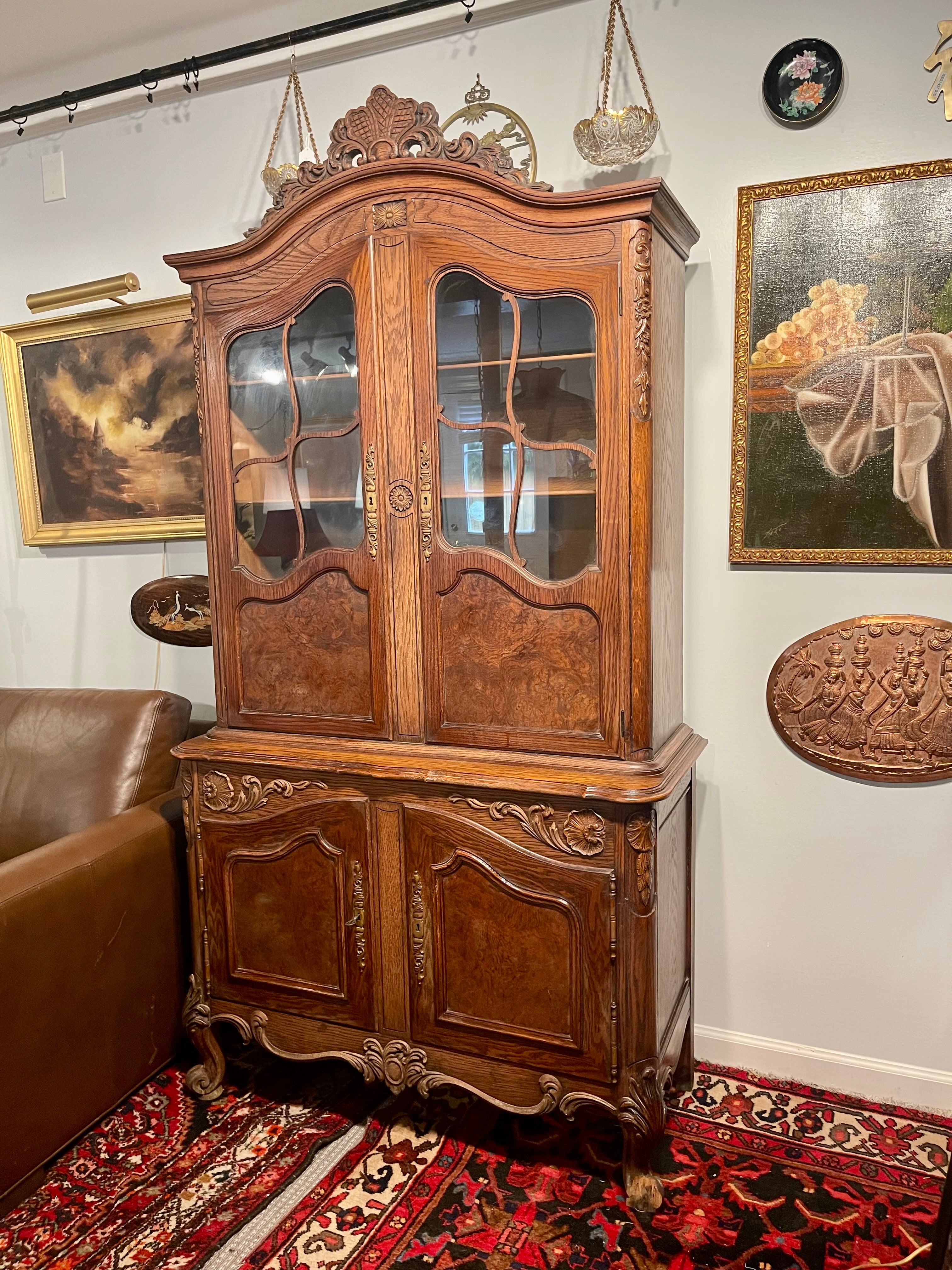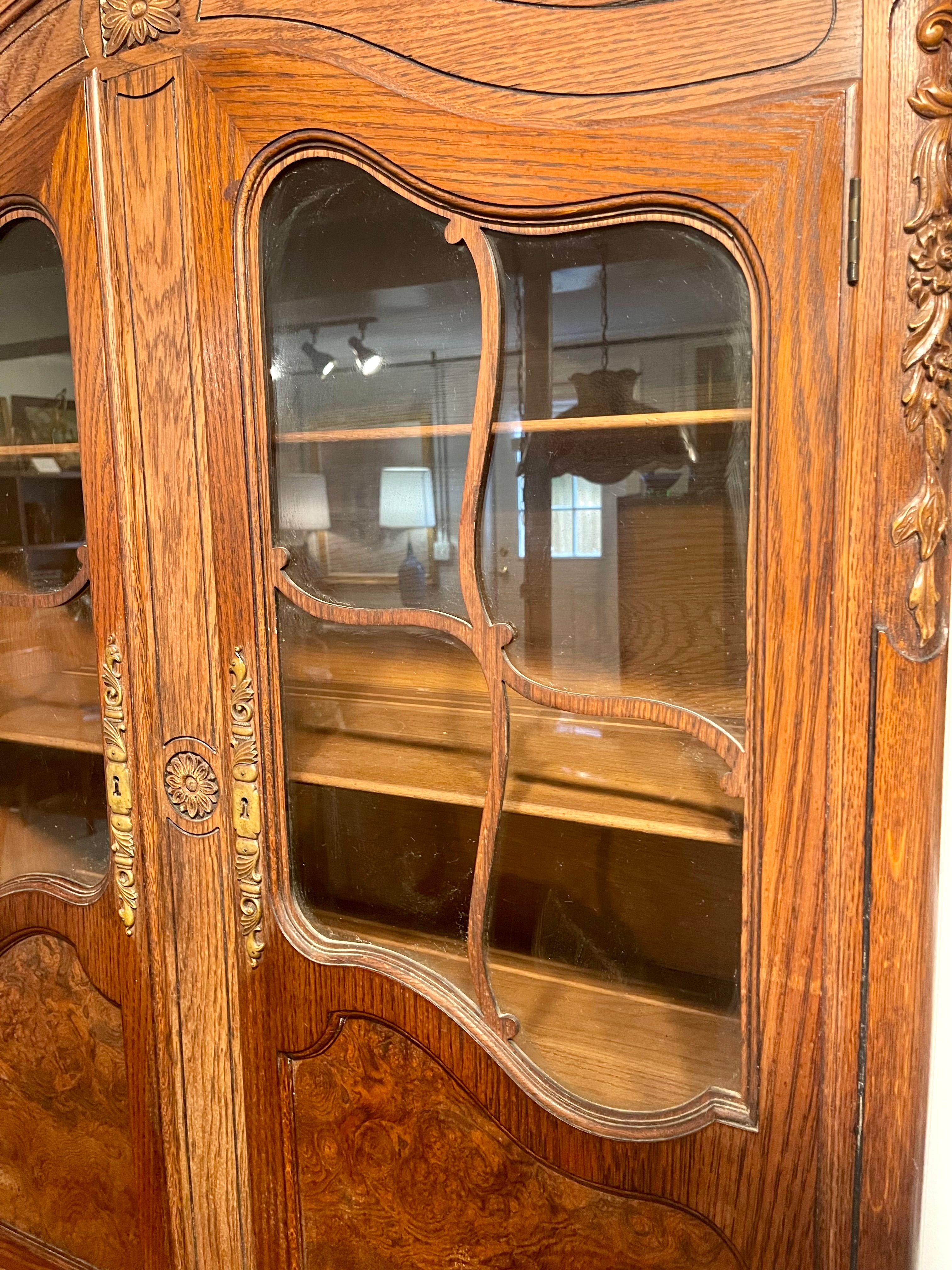 Antique French glass-fronted petite cabinet. The flowing shape of the glass panes evokes an Art Nouveau style. Likely a late 19th to early 20th reproduction of the original 18th century Louis XV style. Hand-carved oak throughout. Would be a beautiful home library, living room or dining room piece. Burled wood paneling I’m the door fronts adds depth and warmth. An original can run nearly $10,000 elsewhere!