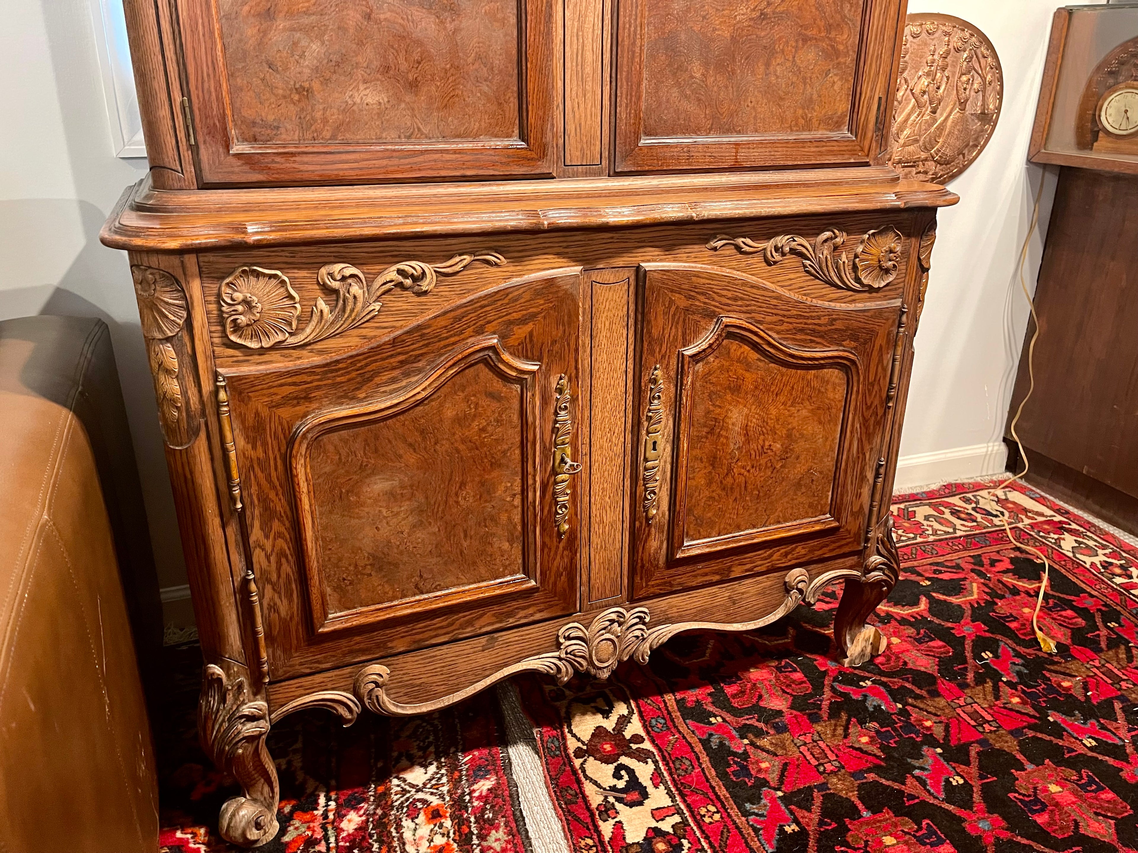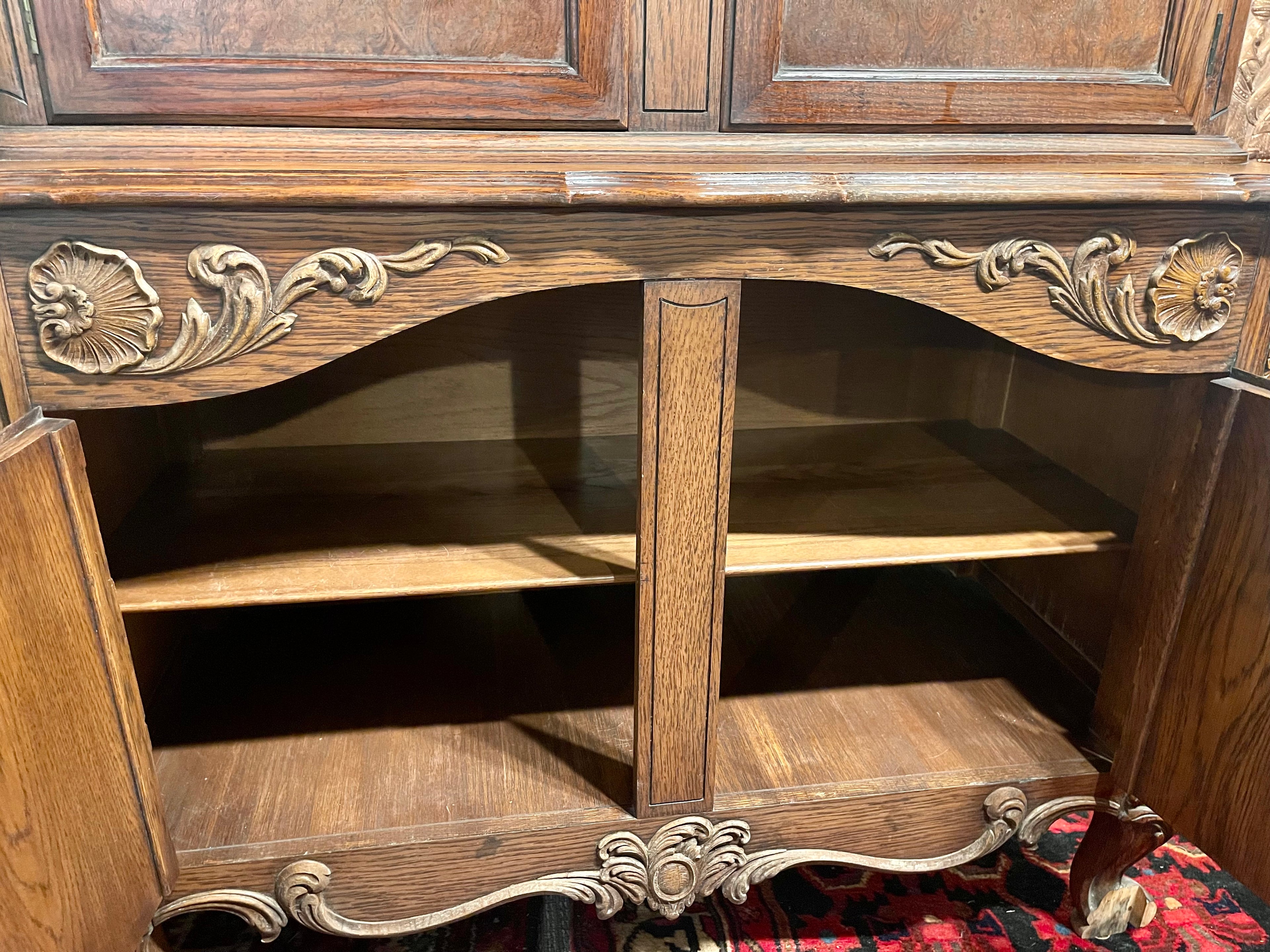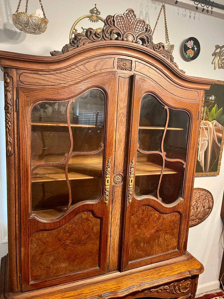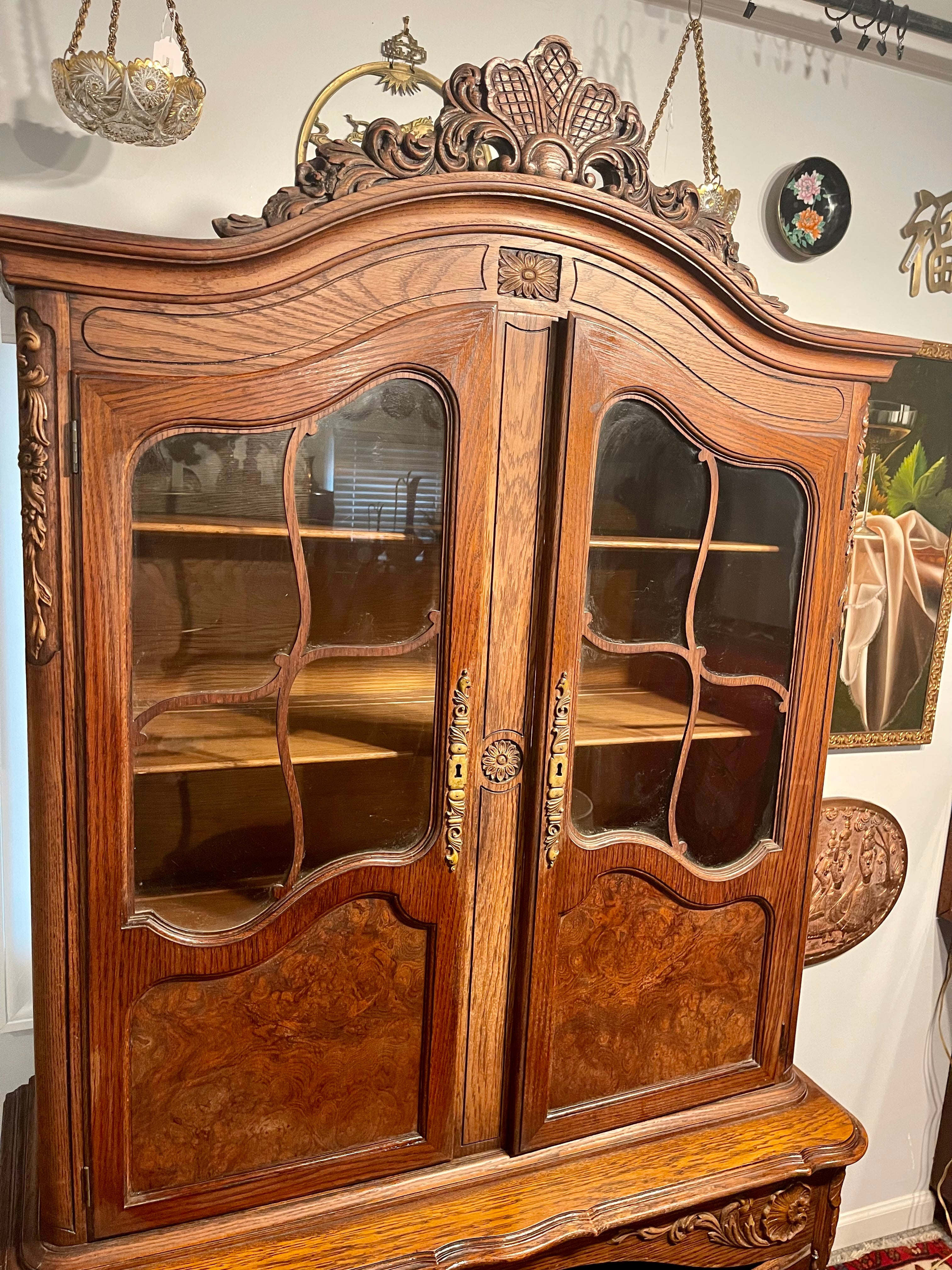 Antique French glass-fronted petite cabinet. The flowing shape of the glass panes evokes an Art Nouveau style. Likely a late 19th to early 20th reproduction of the original 18th century Louis XV style. Hand-carved oak throughout. Would be a beautiful home library, living room or dining room piece. Burled wood paneling I’m the door fronts adds depth and warmth. An original can run nearly $10,000 elsewhere!