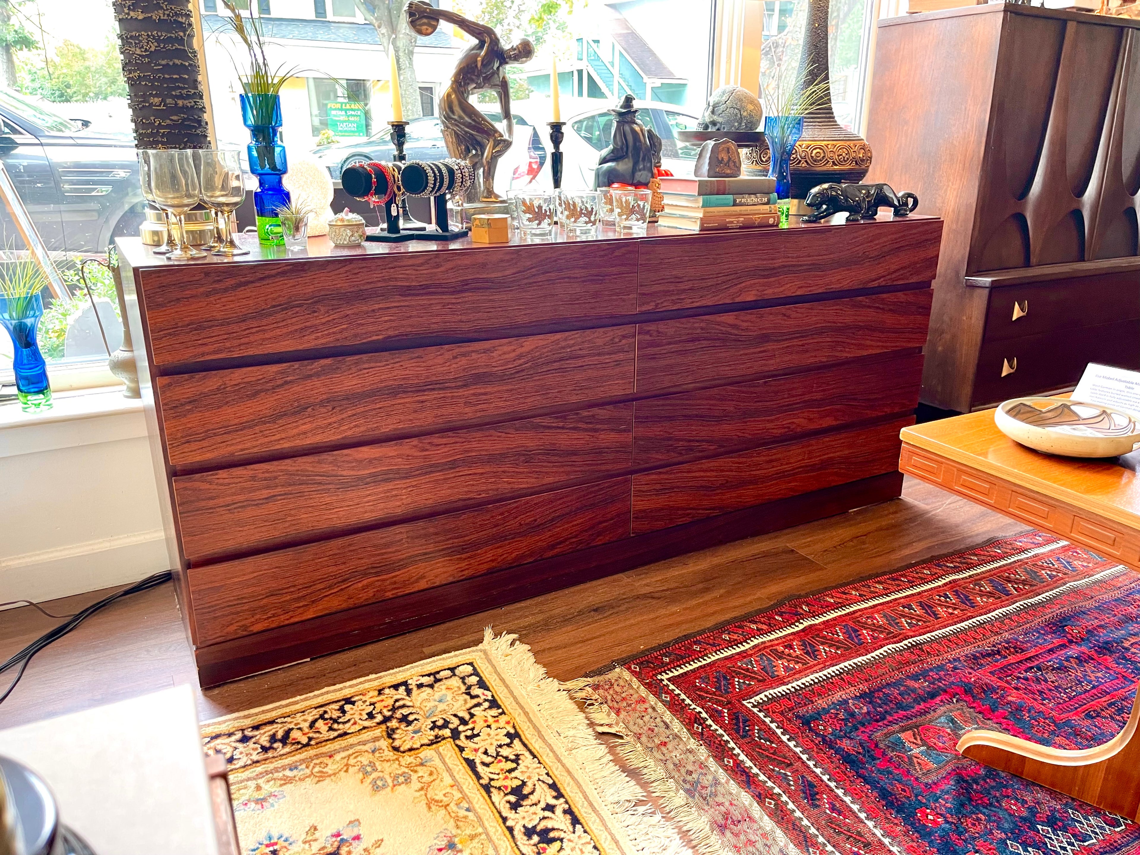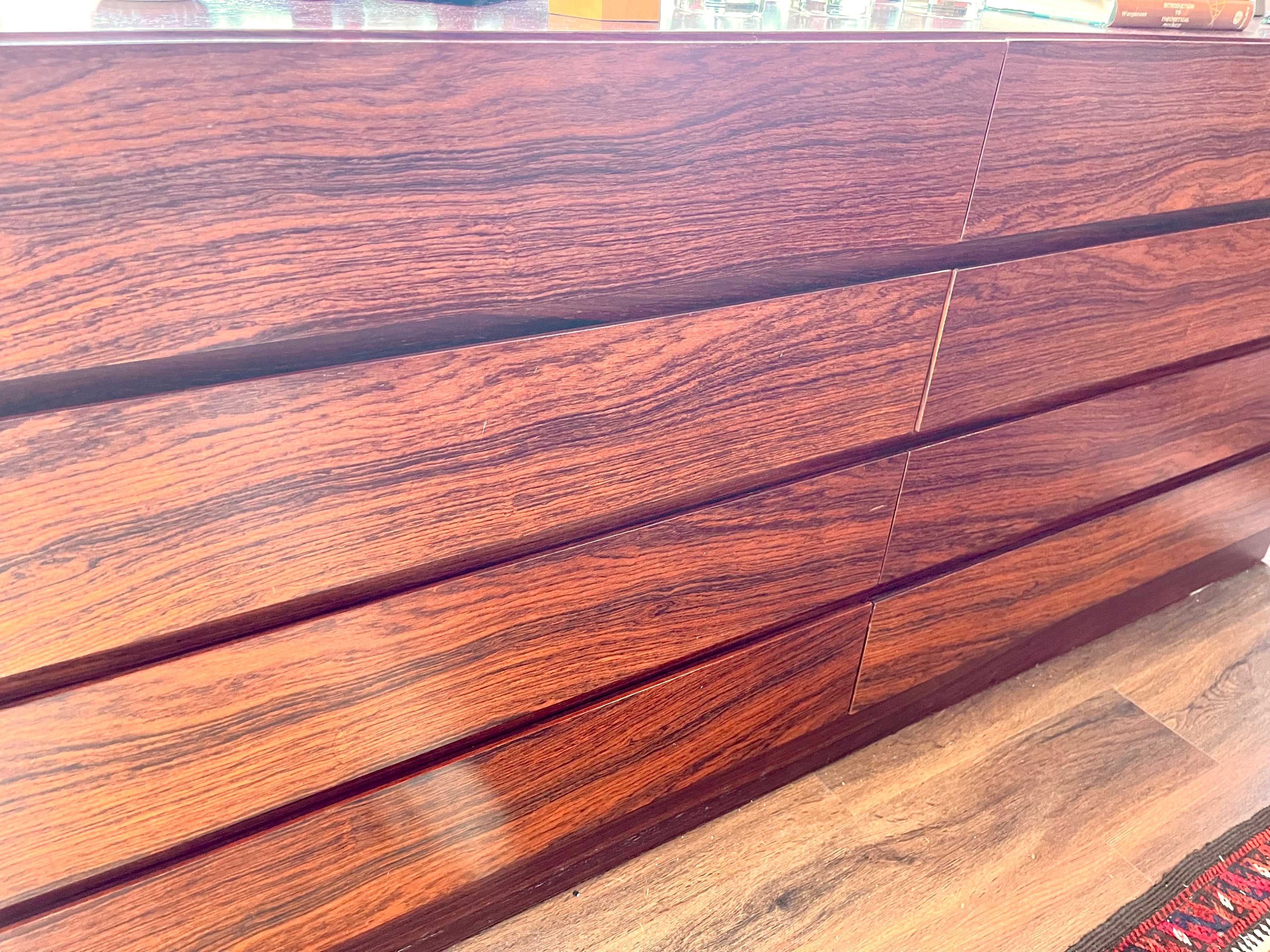 Arne Wahl Ivensen for Vinde Mobelfabrik Eight Drawer Lowboy Dresser and she’s a beauty! The epitome of the Danish modern design aesthetic, the sleek lines, tapered drawers, and glowing rosewood set this piece apart. It’s not every day you get a chance to own a piece of design history! Matching nightstands available.
