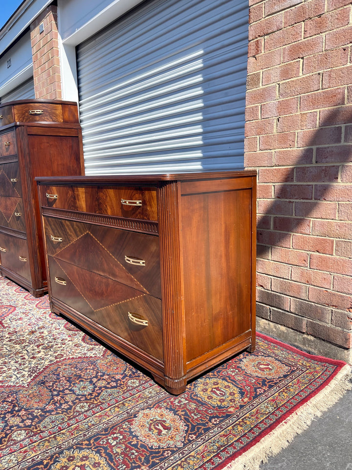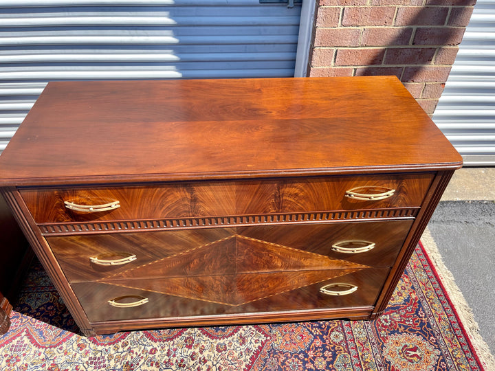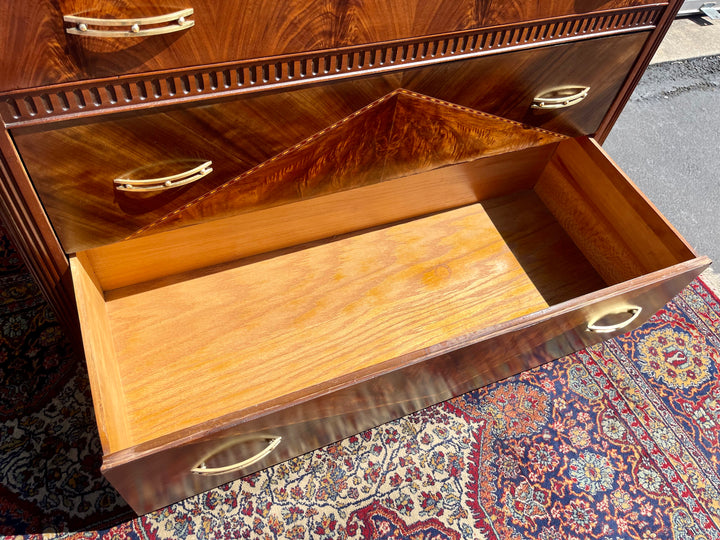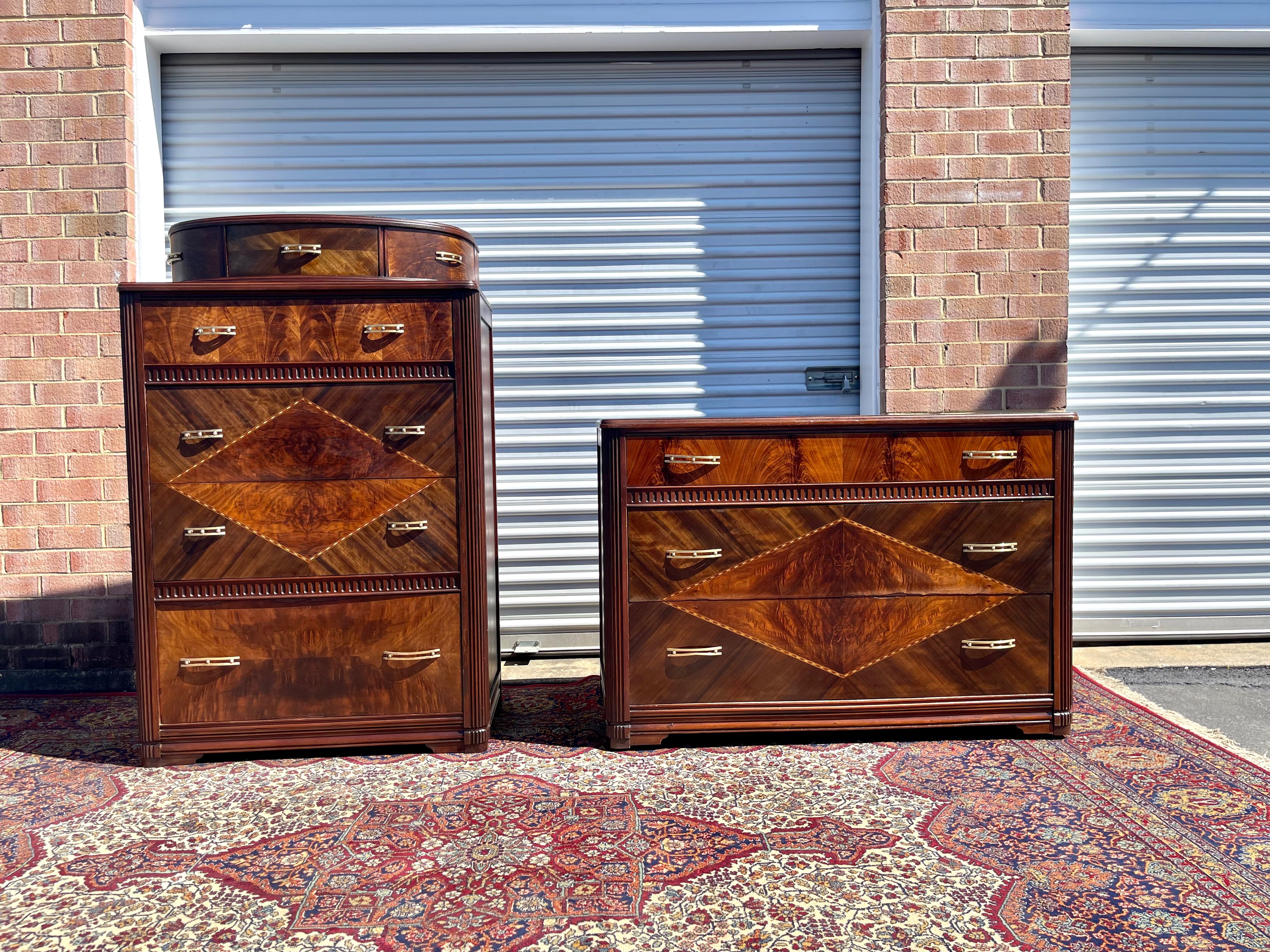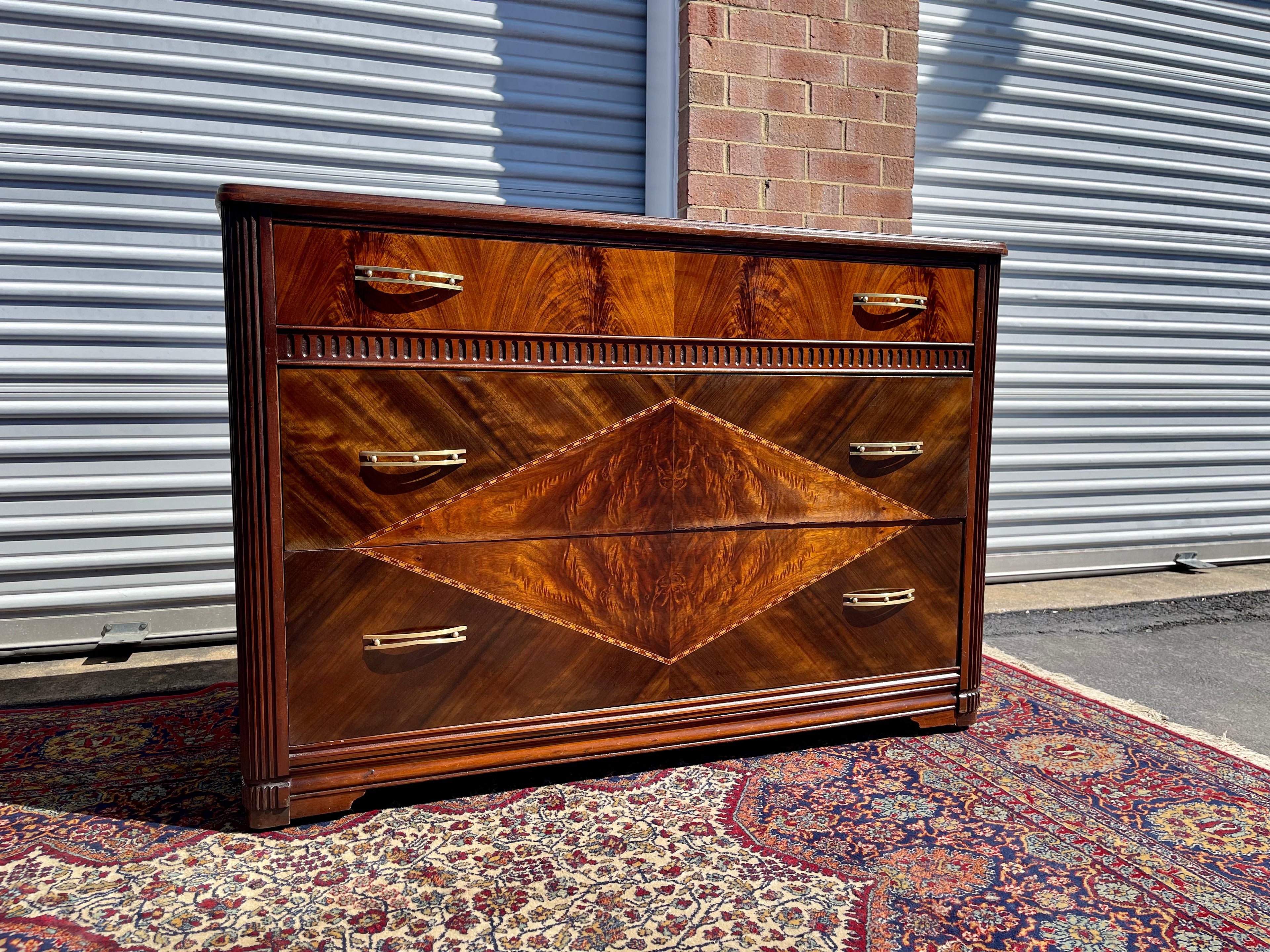 Absolutely jaw dropping Art Deco Lowboy Dresser. This piece of furniture has been completely refinished head to toe and is ready for another 100 years of life! The vibrant and varied wood grain choices on this piece are unparalleled, with burled mahogany and striated walnut making for an extremely eye catching duo. Heavy brass hardware adds the perfect accent. These pieces also boast incredibly spacious and deep drawers. Pair this beauty with the matching tallboy for a beautiful bedroom set you can enjoy for many years to come.