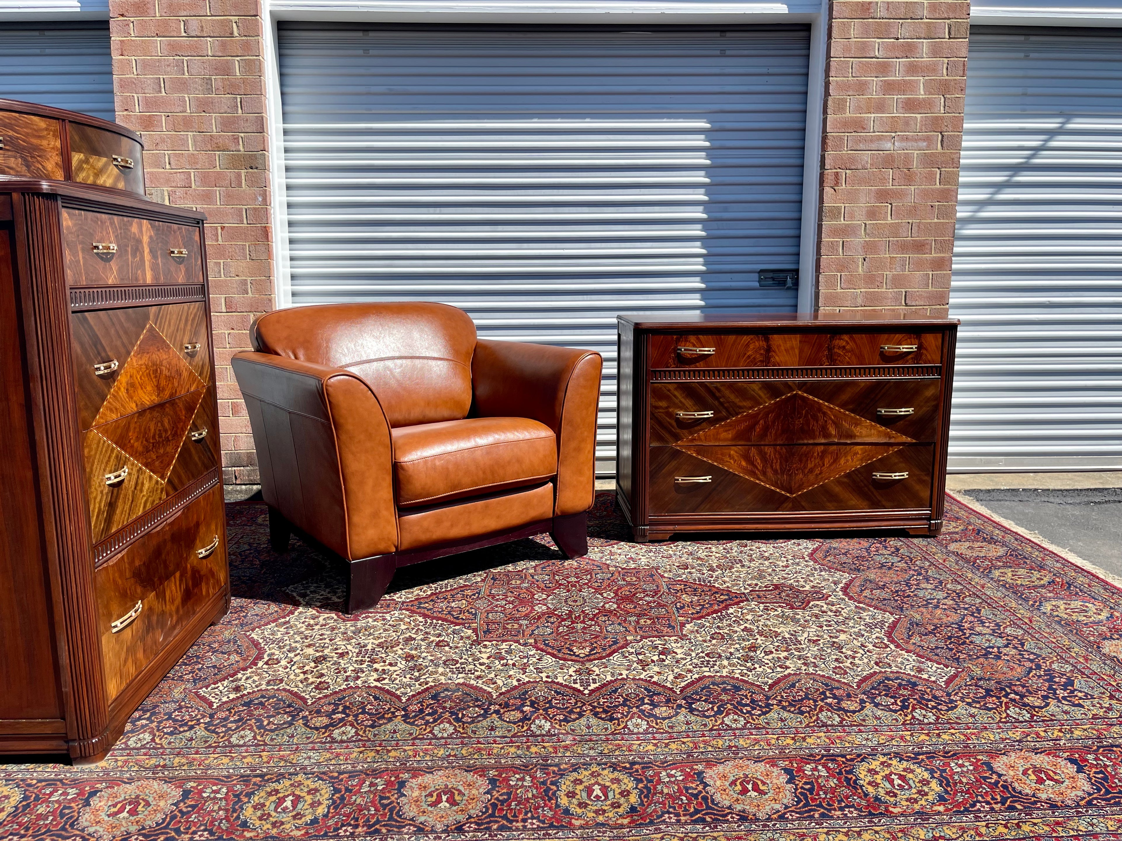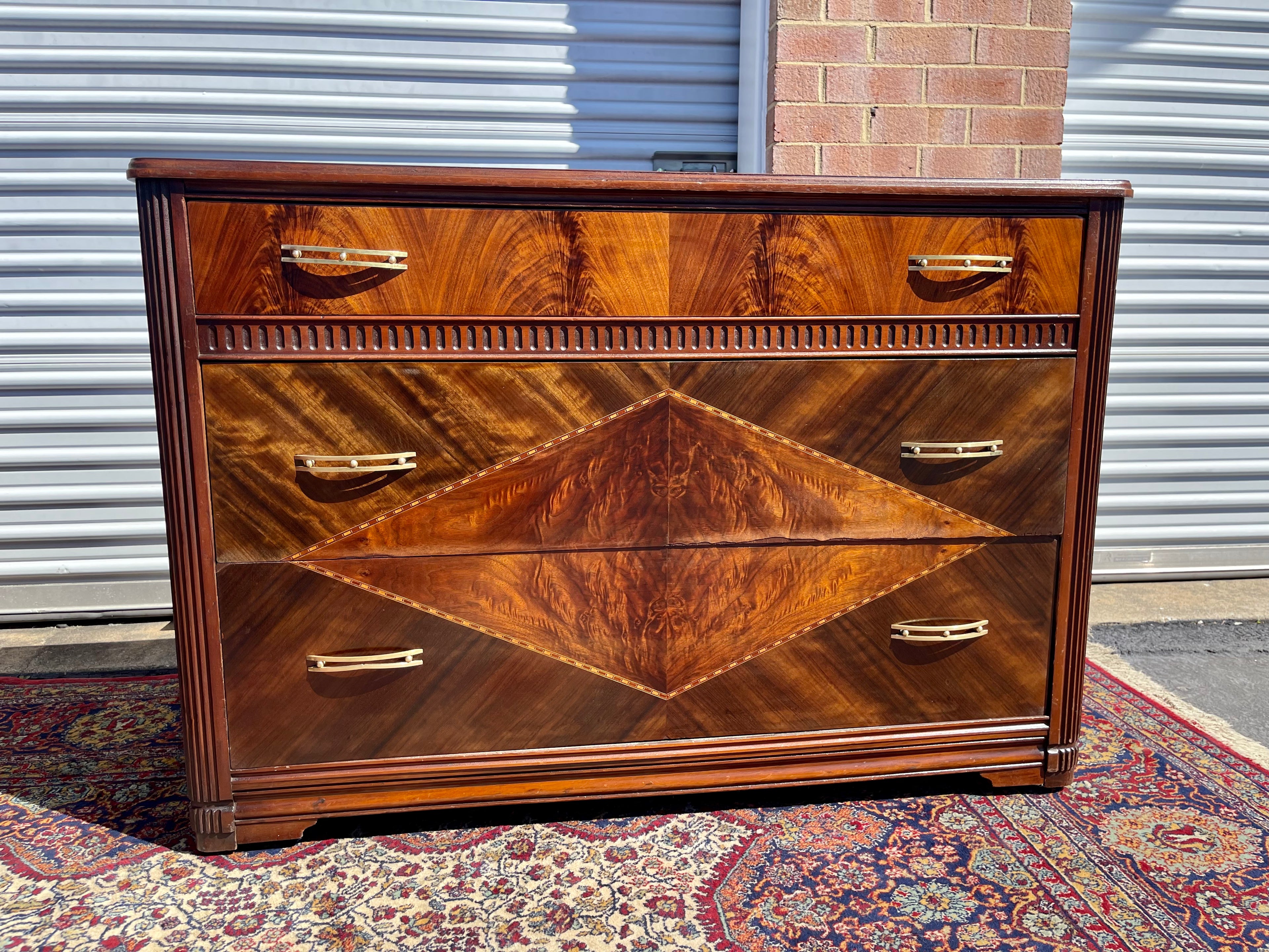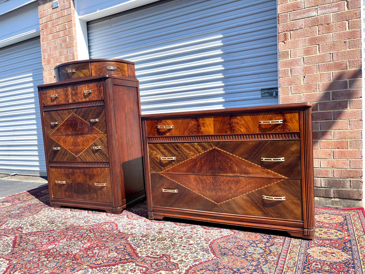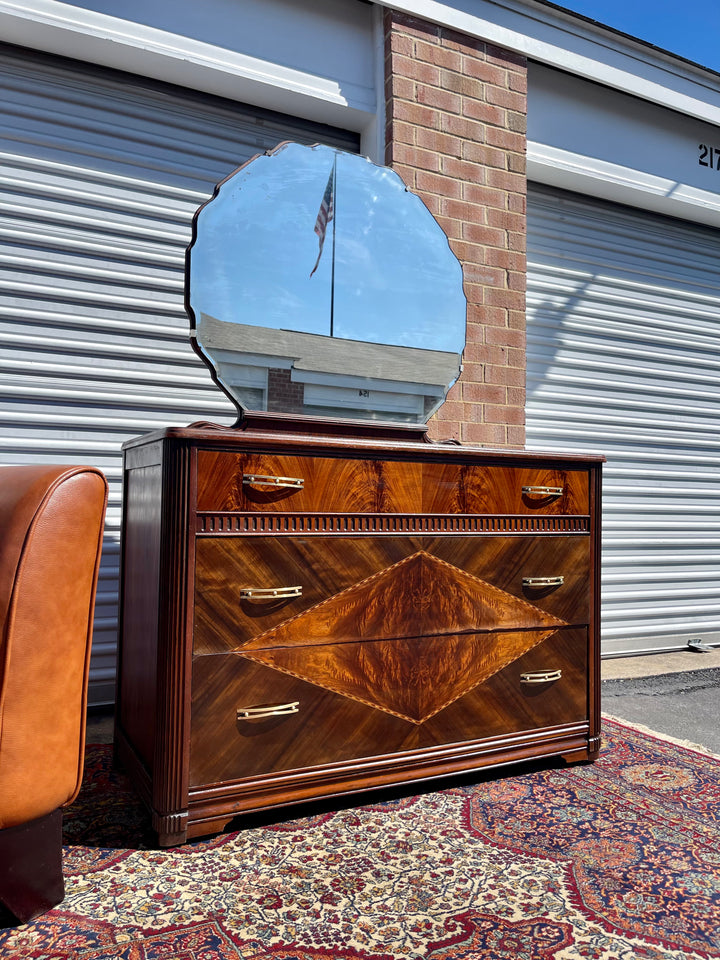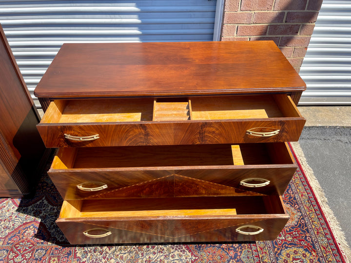 Absolutely jaw dropping Art Deco Lowboy Dresser. This piece of furniture has been completely refinished head to toe and is ready for another 100 years of life! The vibrant and varied wood grain choices on this piece are unparalleled, with burled mahogany and striated walnut making for an extremely eye catching duo. Heavy brass hardware adds the perfect accent. These pieces also boast incredibly spacious and deep drawers. Pair this beauty with the matching tallboy for a beautiful bedroom set you can enjoy for many years to come.