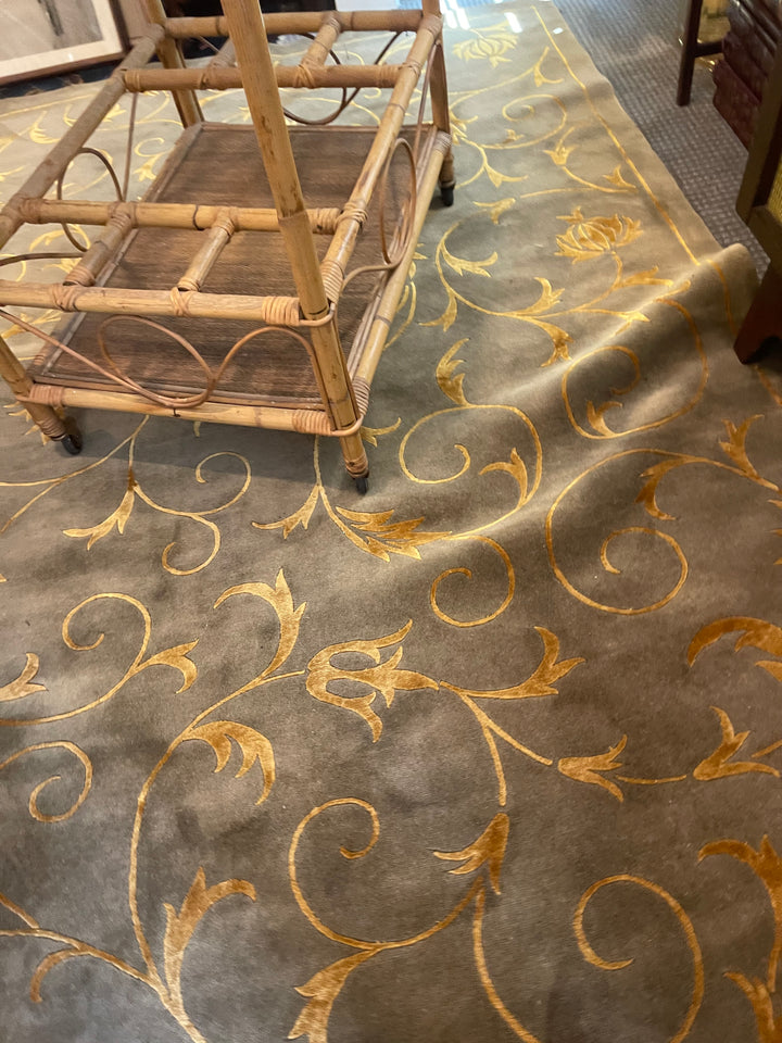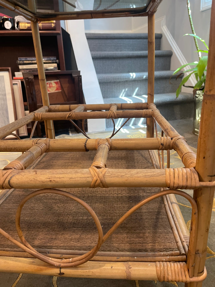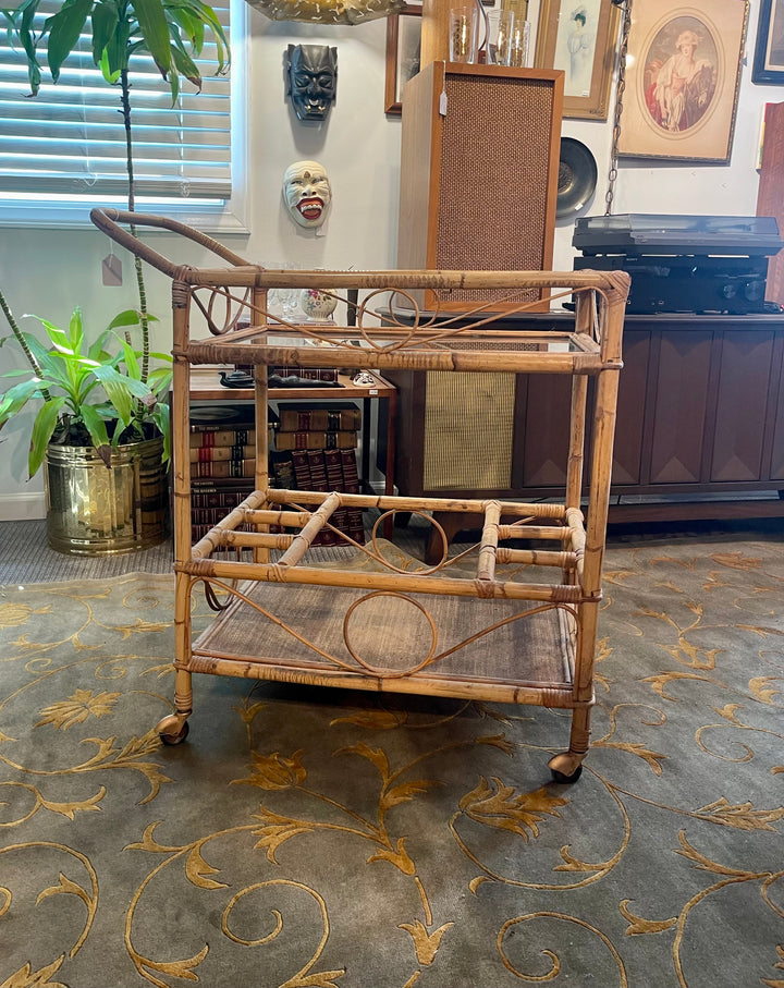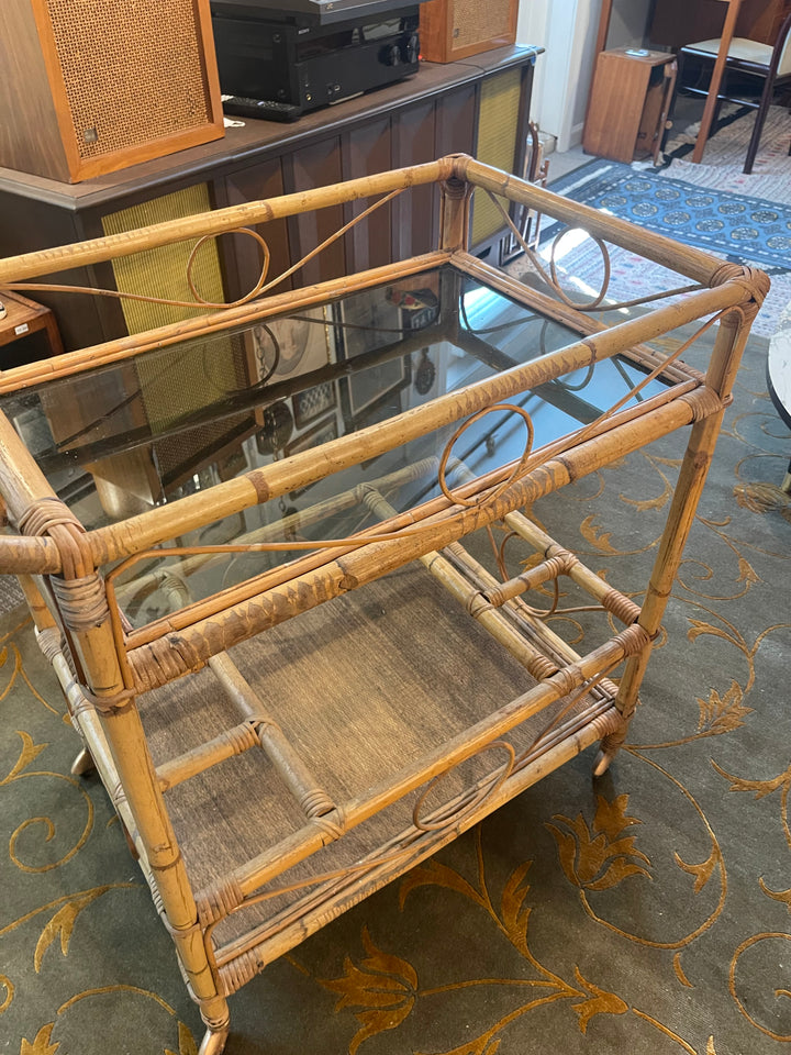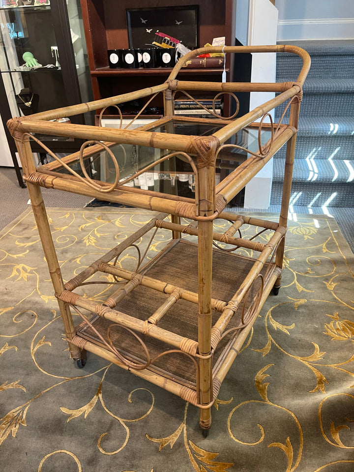 Cute boho bamboo and rattan vintage bar cart! Perfect for a coffee or liquor setup. Bar top height of about 27 inches.