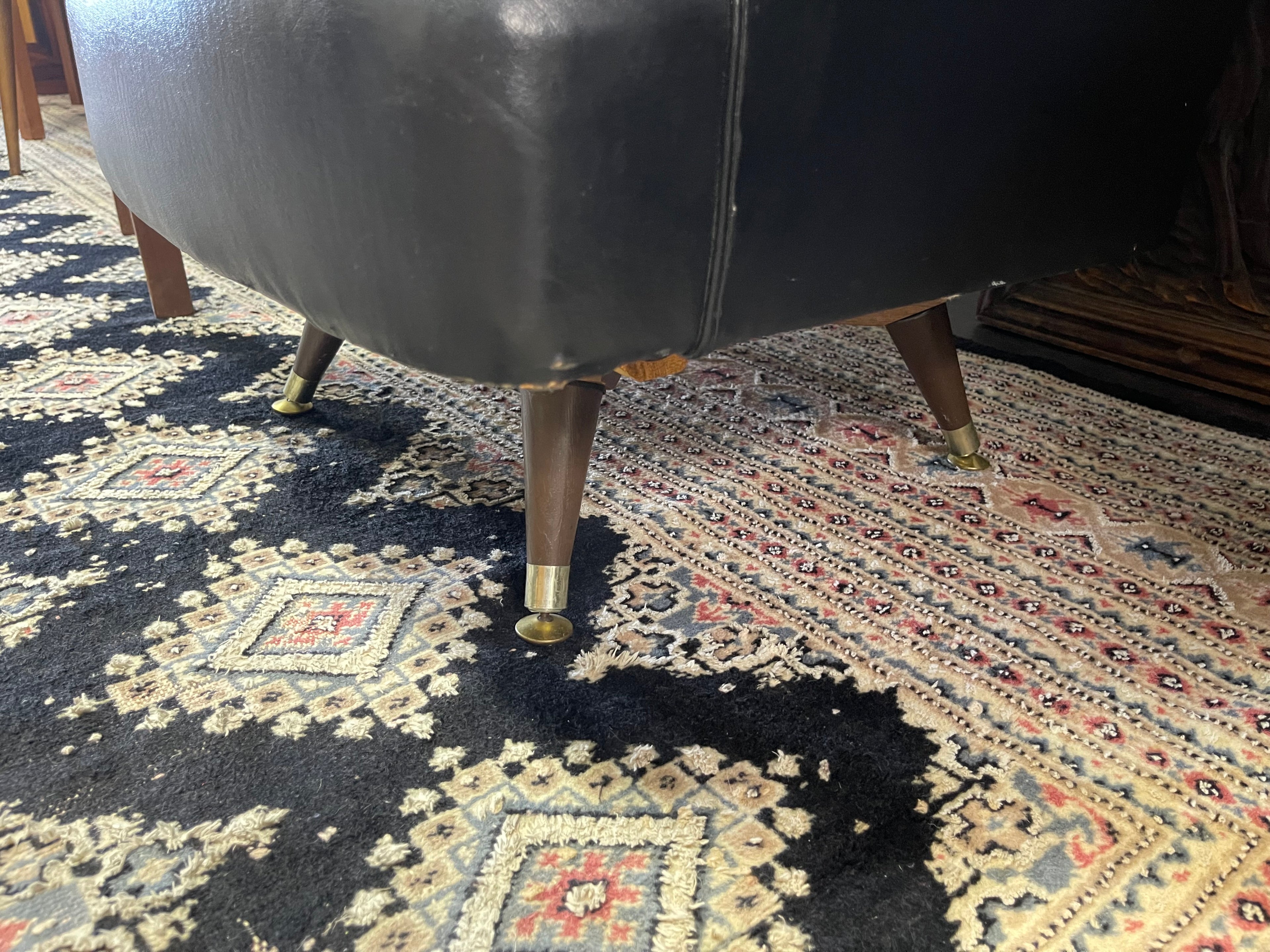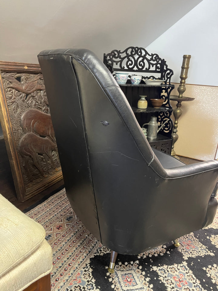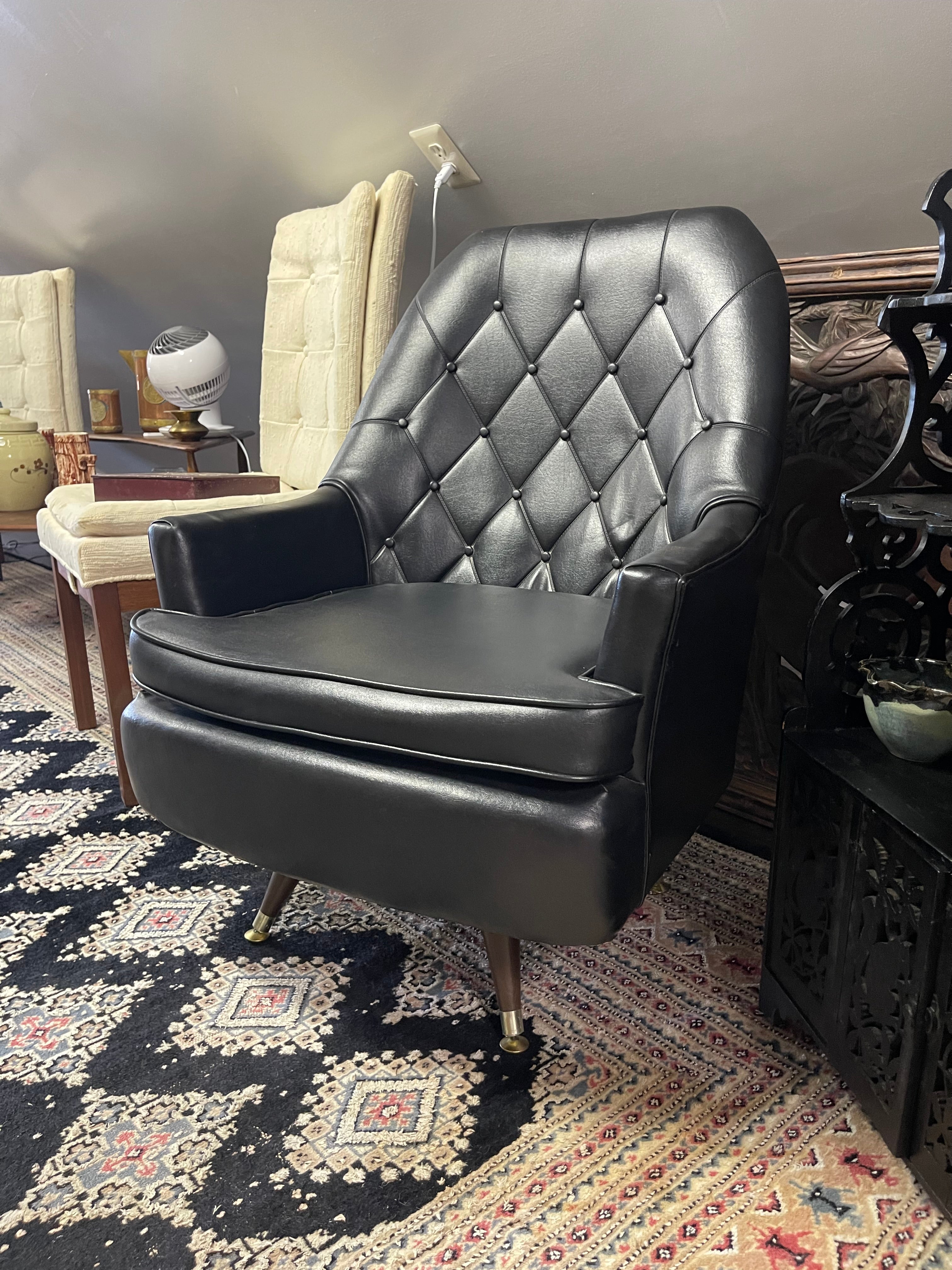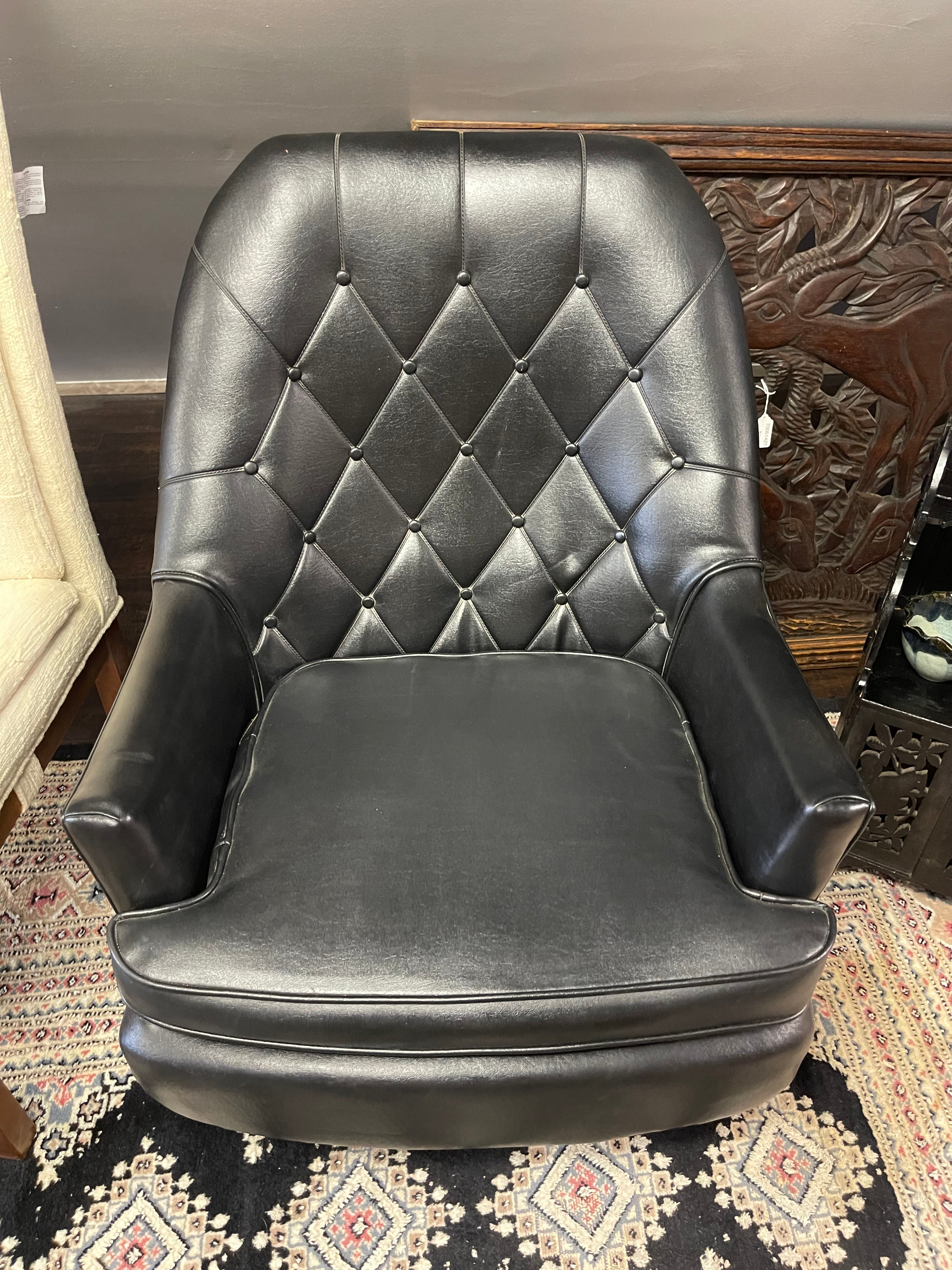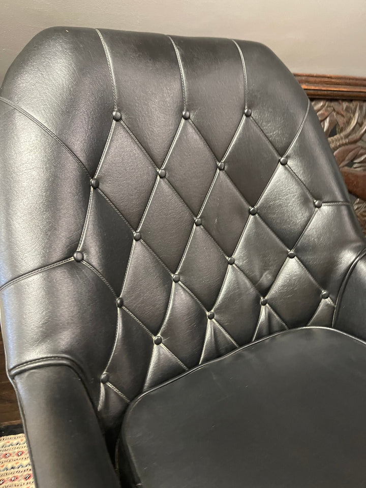 Classic and comfortable, this black vinyl tufted armchair would be great in a living room or office. One small tear in the vinyl on the back left of the chair, priced accordingly. Otherwise in good vintage condition.