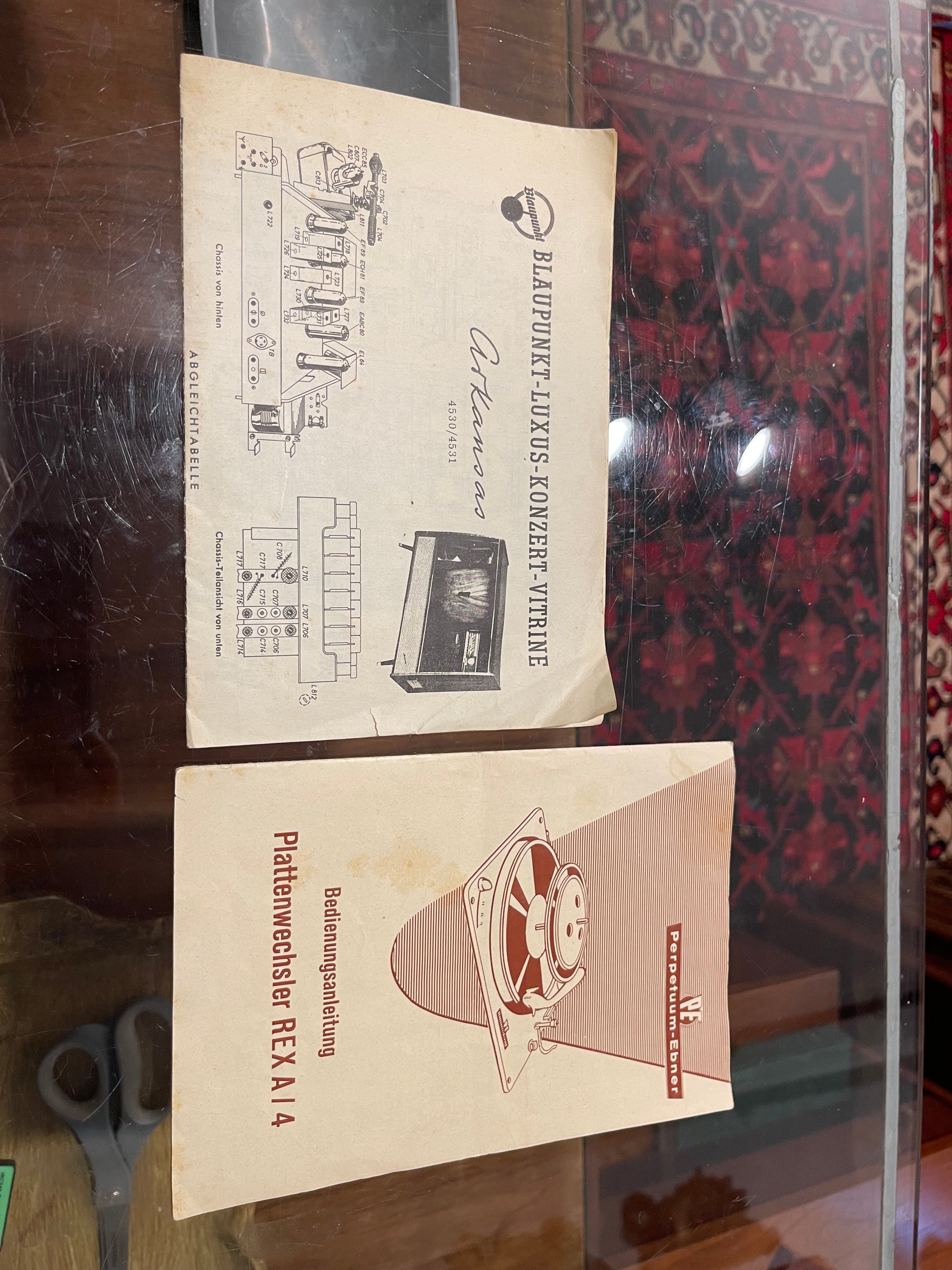 One of our favorite pieces to date, this Blaufunkt Arkansas Radio Cabinet, Record Player & Bar combo is the epitome of Midcentury modern style. The music equipment is all in excellent working order and the speakers sounds fantastic! The cabinet itself is in excellent condition as well. One wood and one glass shelf slide to reveal the various components. Only one owner, this historical piece was purchased in 1958 in Germany. Comes with original receipt and paperwork. You’re not going to want to miss out on this one!