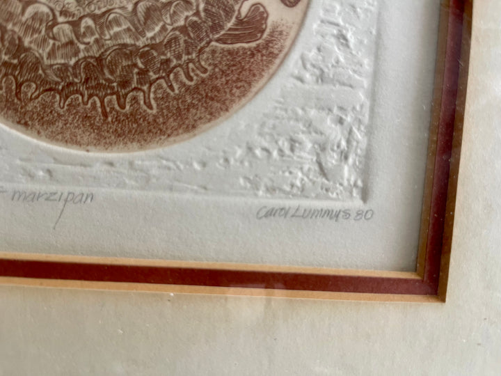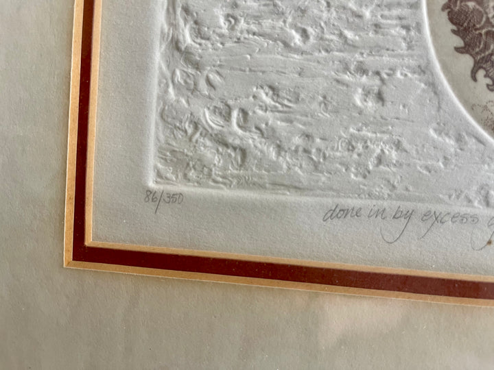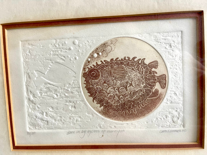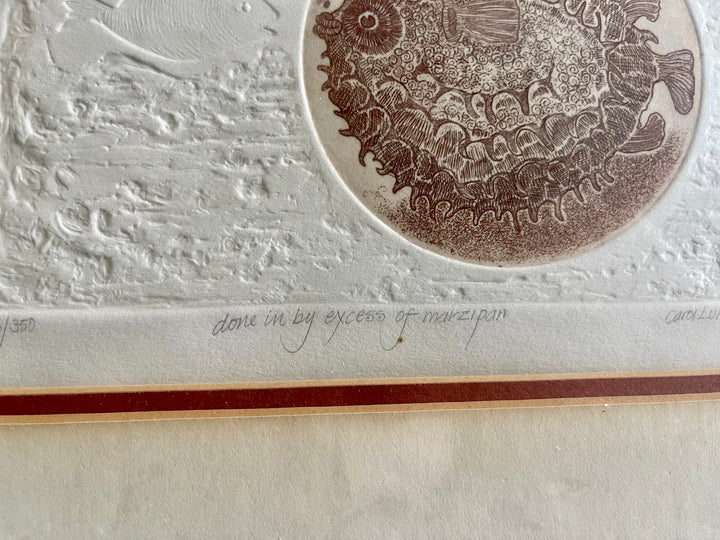 Each piece is numbered and signed by the artist. This piece is titled “Done in by an Excess of Marzipan”