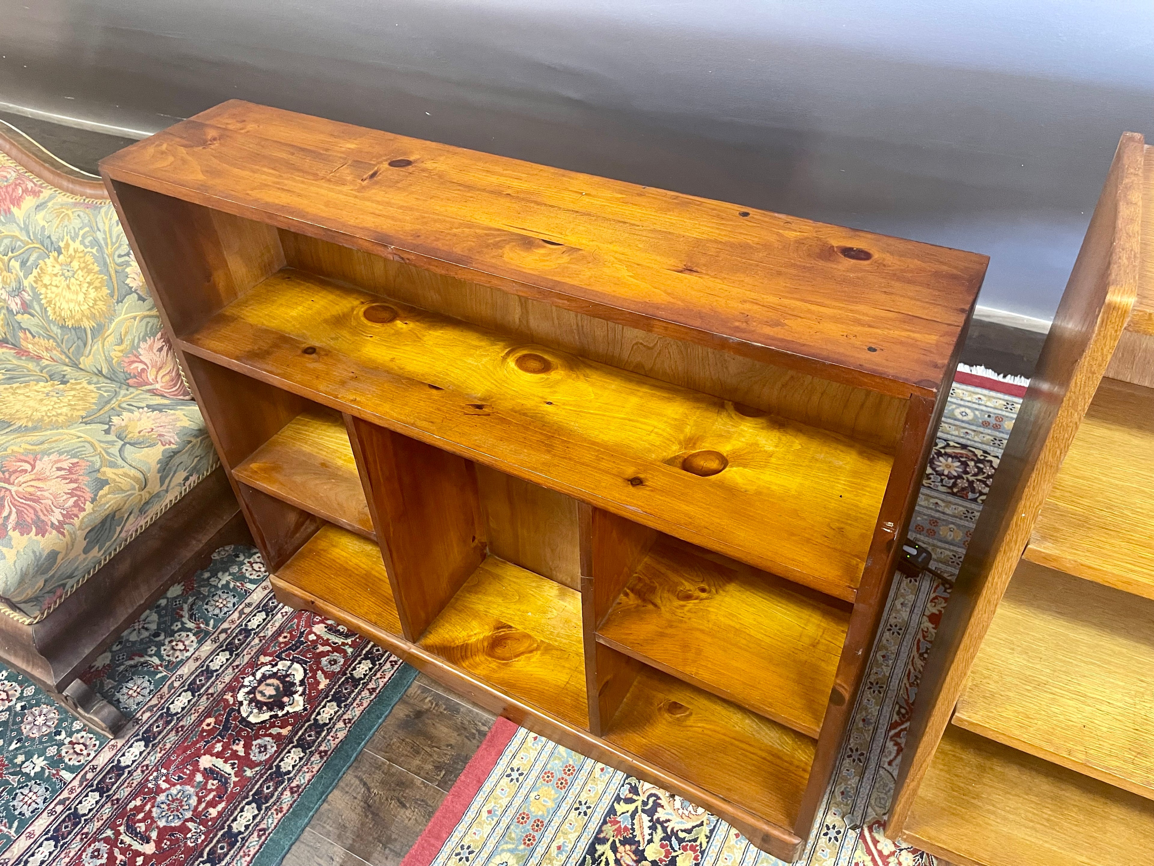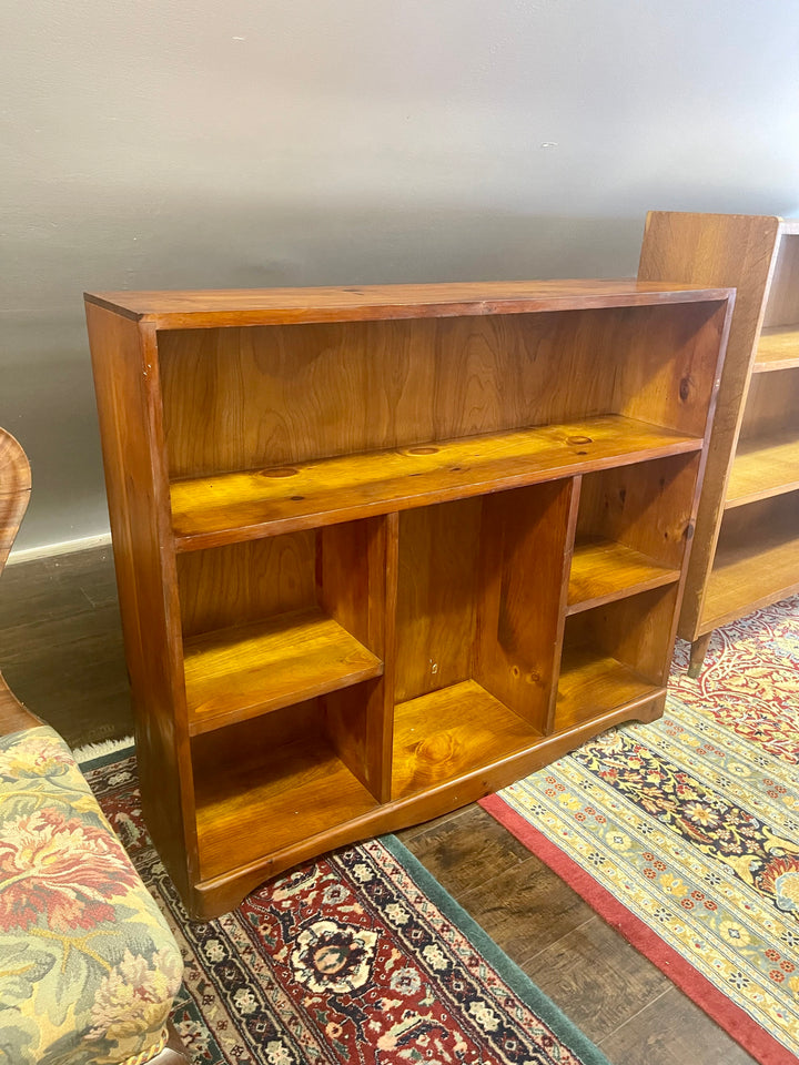Sturdy, handsome, and functional petite bookcase handmade from solid cedar wood. Large top shelf, four smaller lower shelves and a larger center shelf provides a unique look and feel. Perfect to load up your home library or create a unique display.