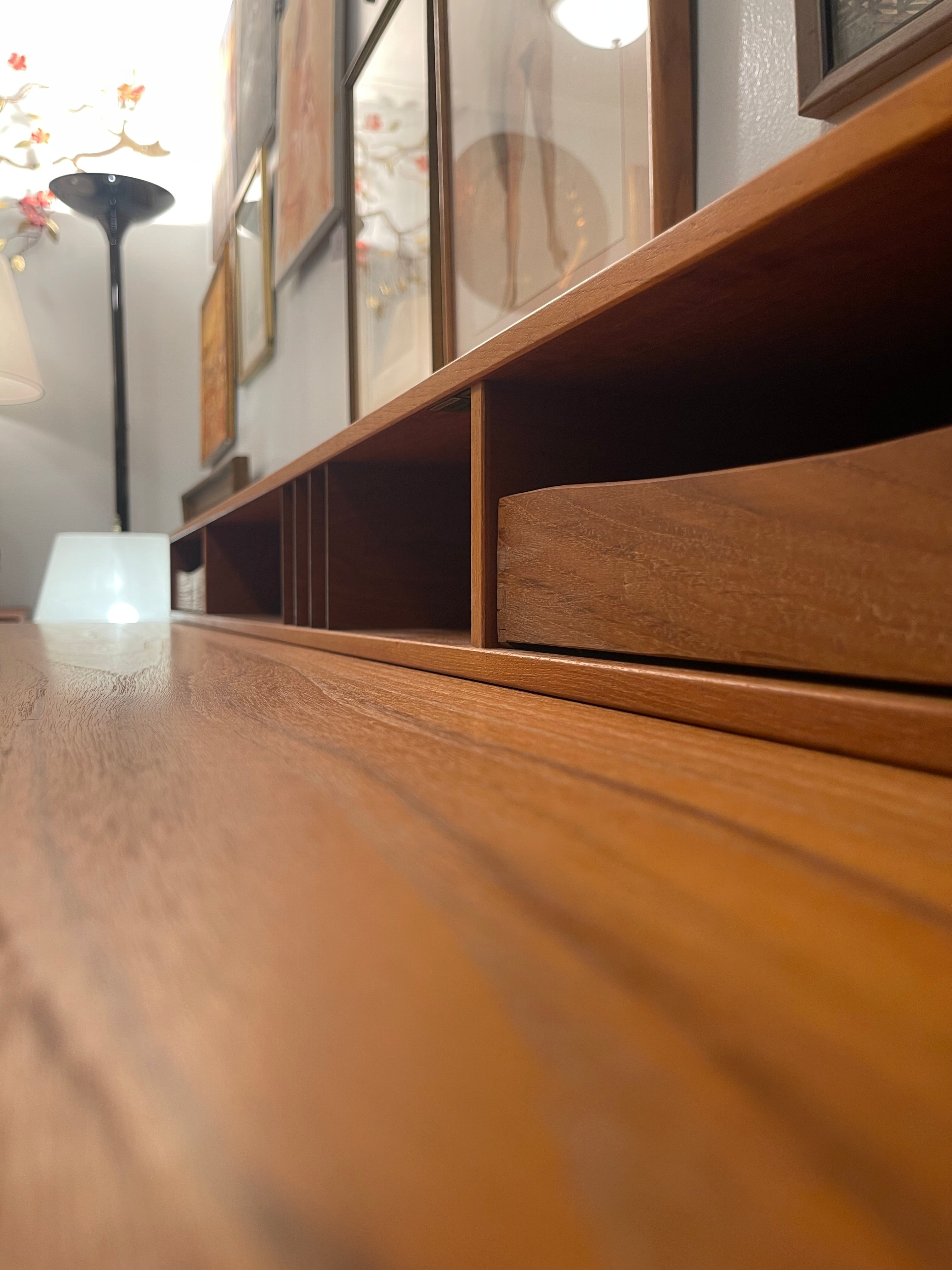 Spectacular team desk designed and crafted by Peter Løvig Nielsen in Denmark circa 1970's. Its ingenious design makes it versatile in accommodating two persons on each side by simply flipping the top shelf down, or leaving it with the leaf up for a two tiered workspace. Every detail and design element ensure this is one of the most sought after vintage desks on the market.