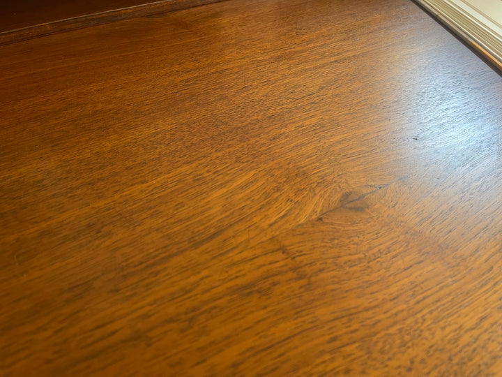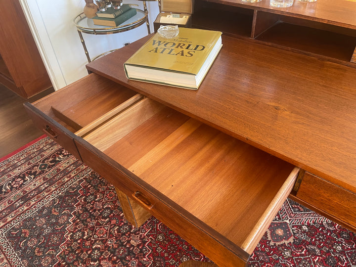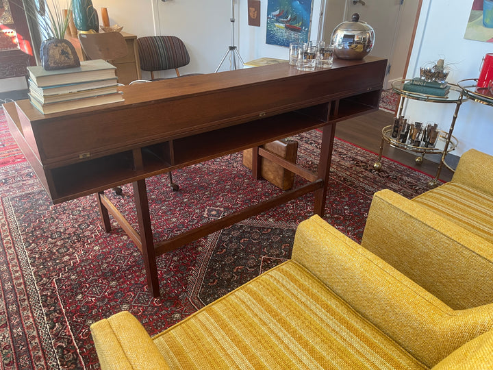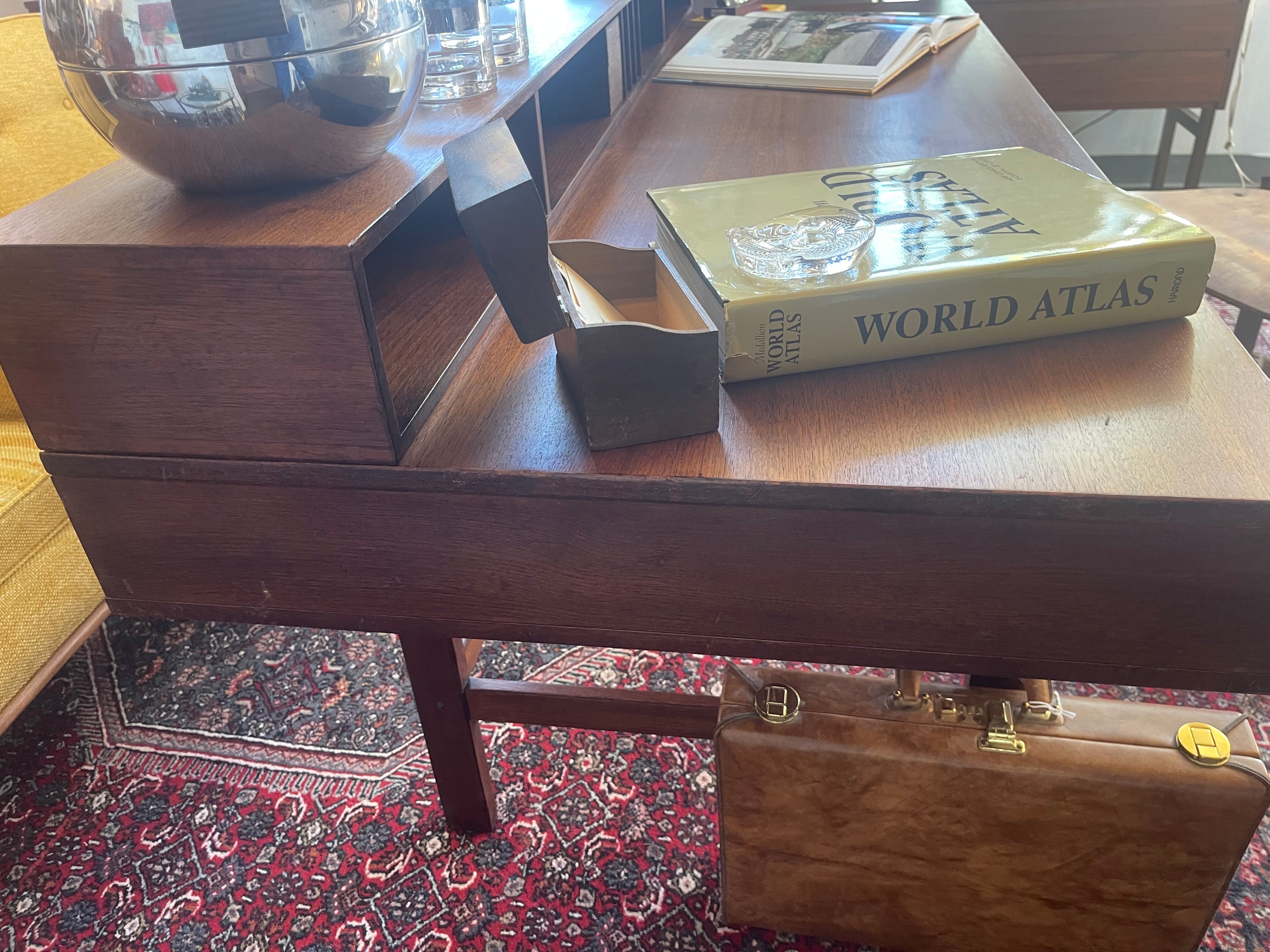 Spectacular walnut desk designed and crafted by Peter Løvig Nielsen in Denmark circa 1970's. This particular Walnut example was made in 1973. Its ingenious design makes it versatile in accommodating two persons on each side by simply flipping the top shelf down, or leaving it with the lead up for a two tiered workspace. The desk has been fully restored and shows beautifully. Walnut examples of this desk are extremely rare.