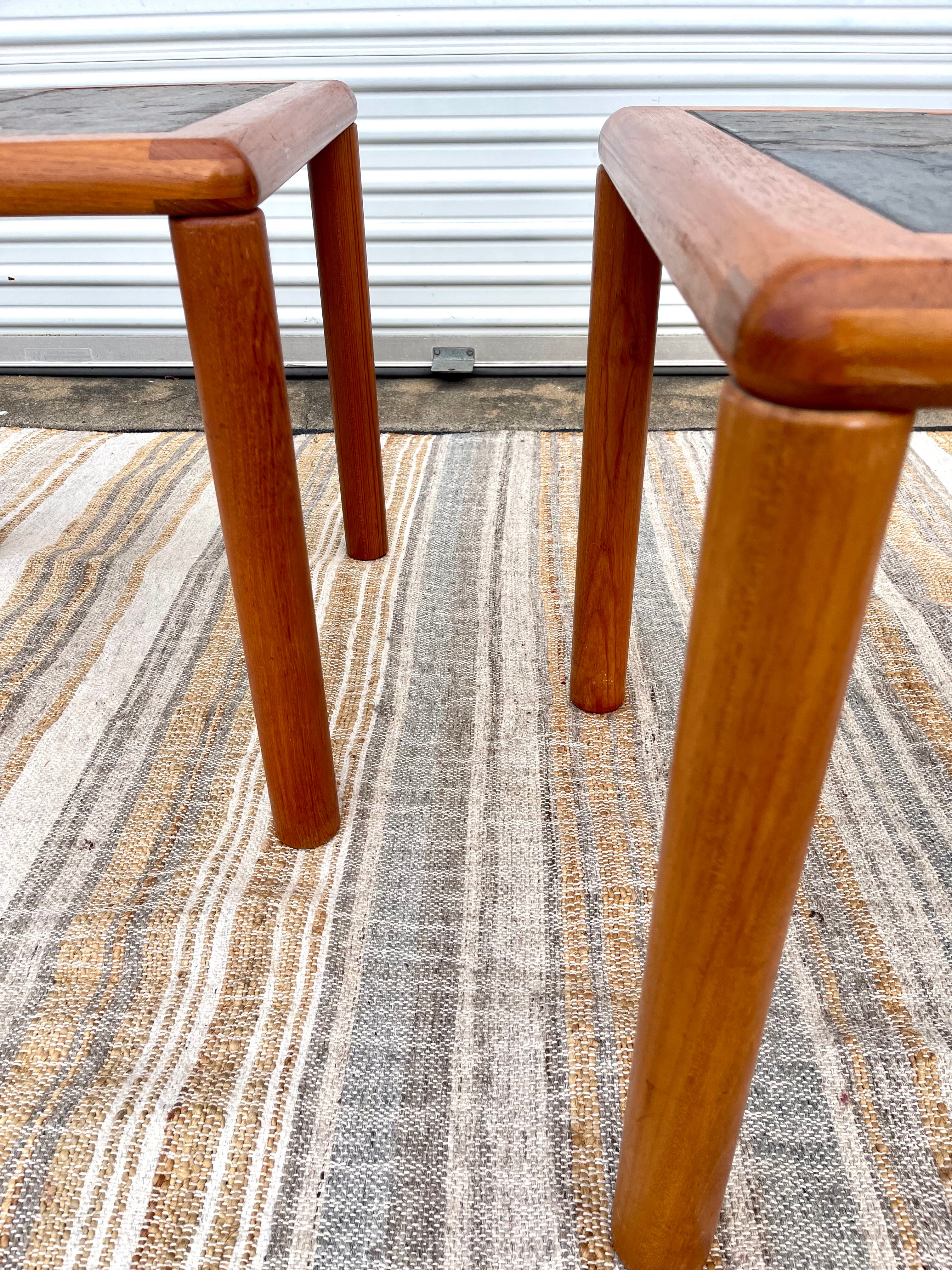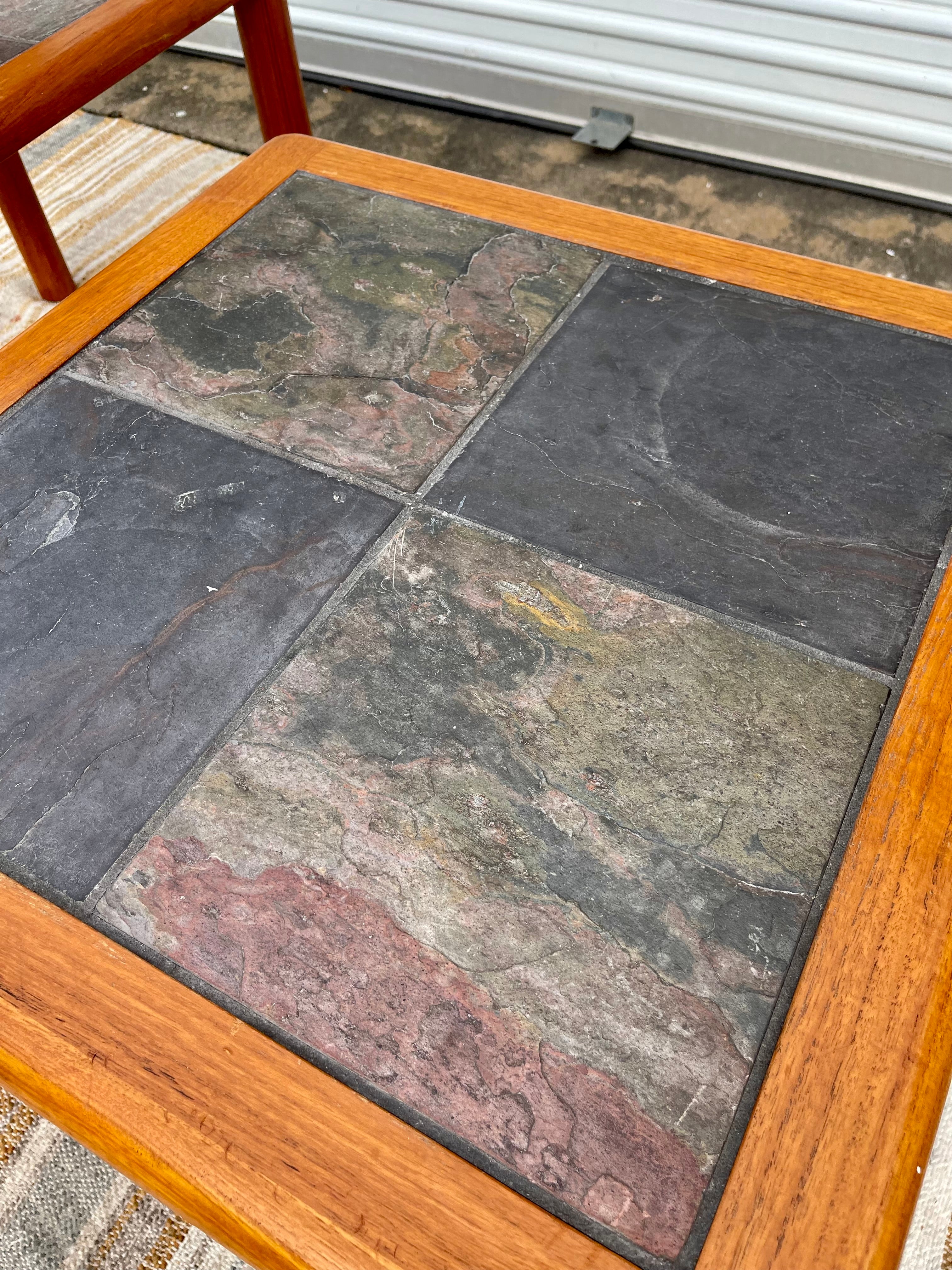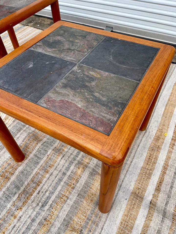 Danish made modern teak and slate tables by Haslev. Nice scale, with practical height for most purposes. Well-constructed and stylish, 1980s. The slate is ideal as an incredibly durable and stylish surface; never worry about those ring marks again. Priced individually, makers mark present.