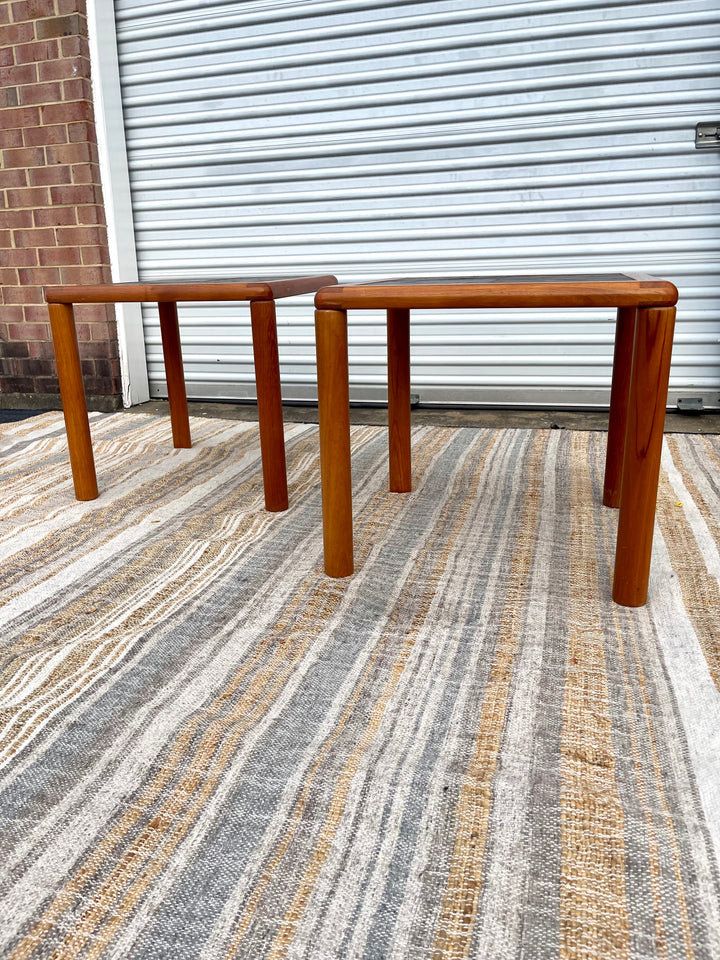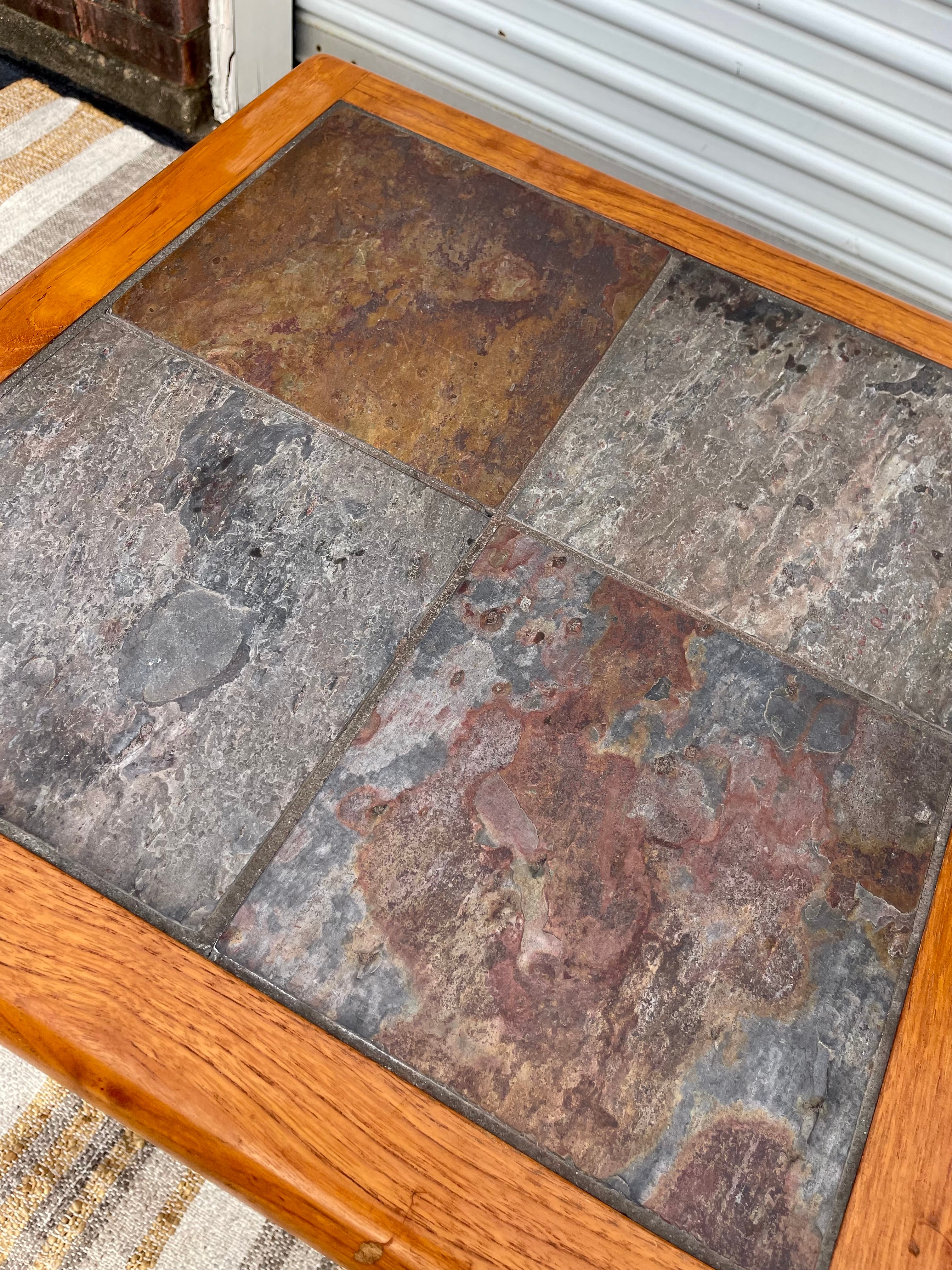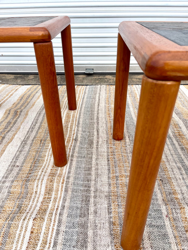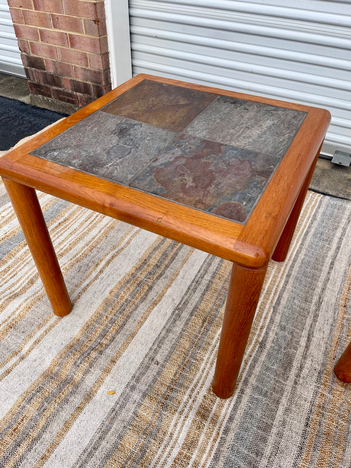 Danish made modern teak and slate tables by Haslev. Nice scale, with practical height for most purposes. Well-constructed and stylish, 1980s. The slate is ideal as an incredibly durable and stylish surface; never worry about those ring marks again. Priced individually, makers mark present.
