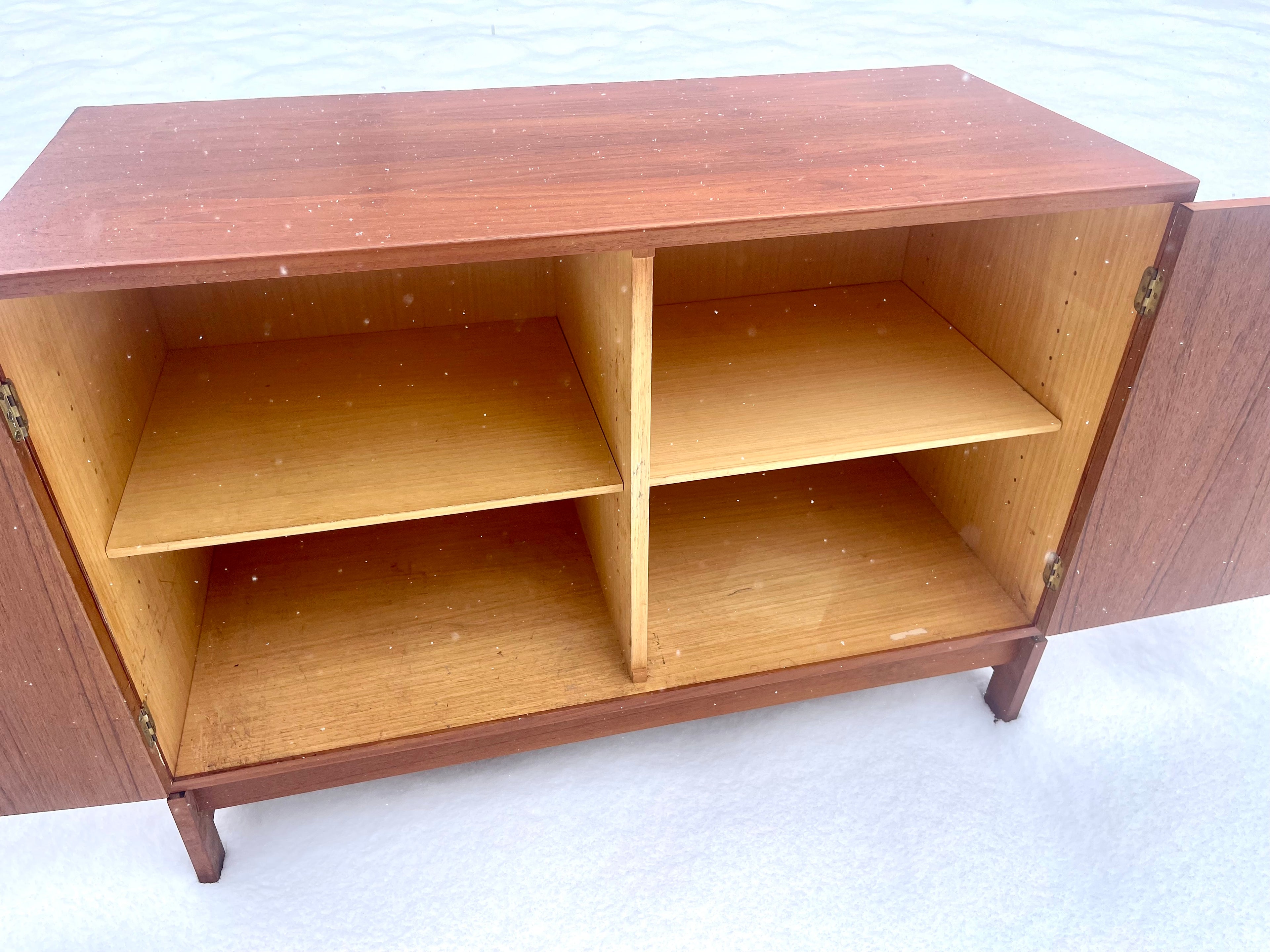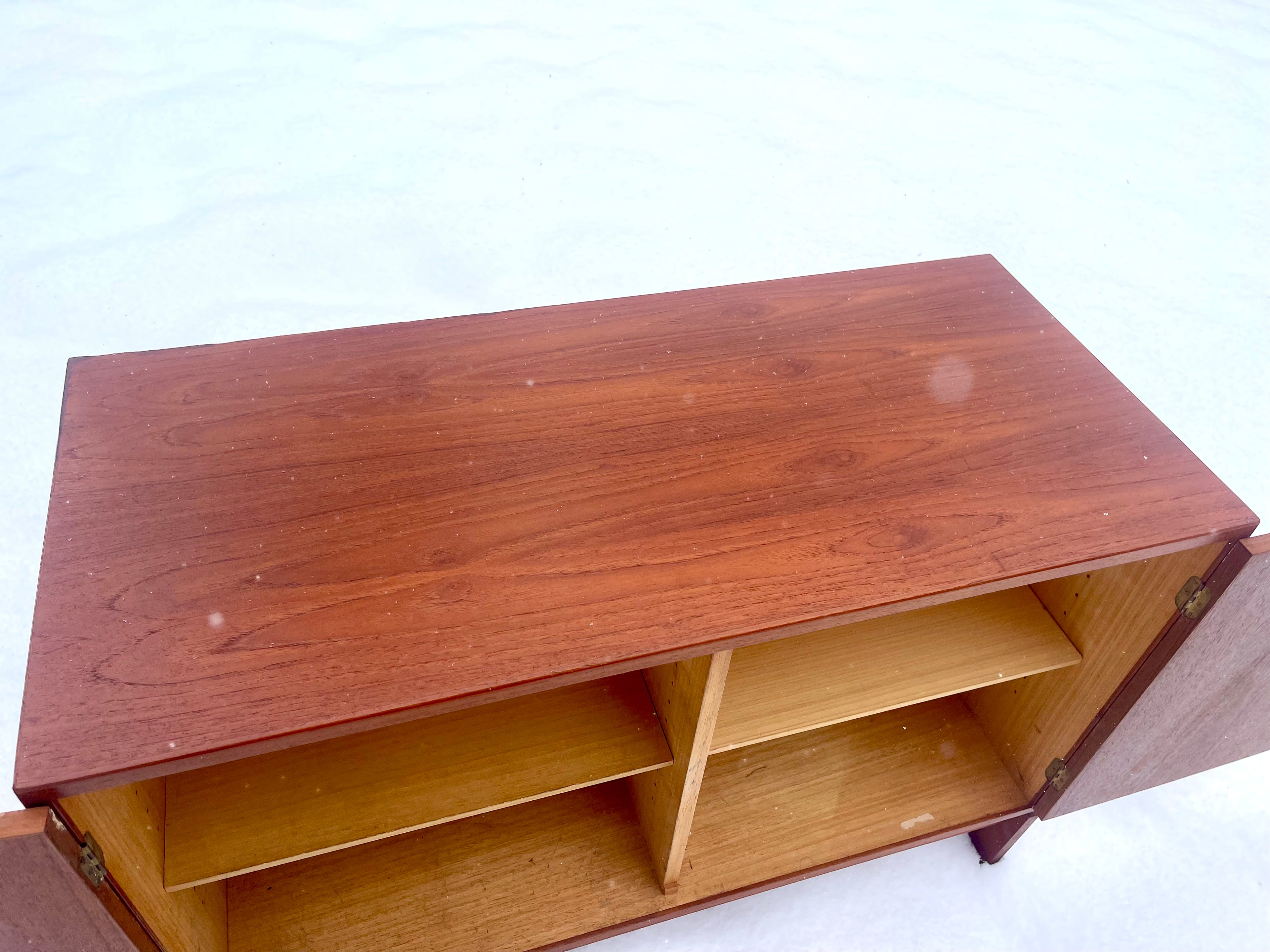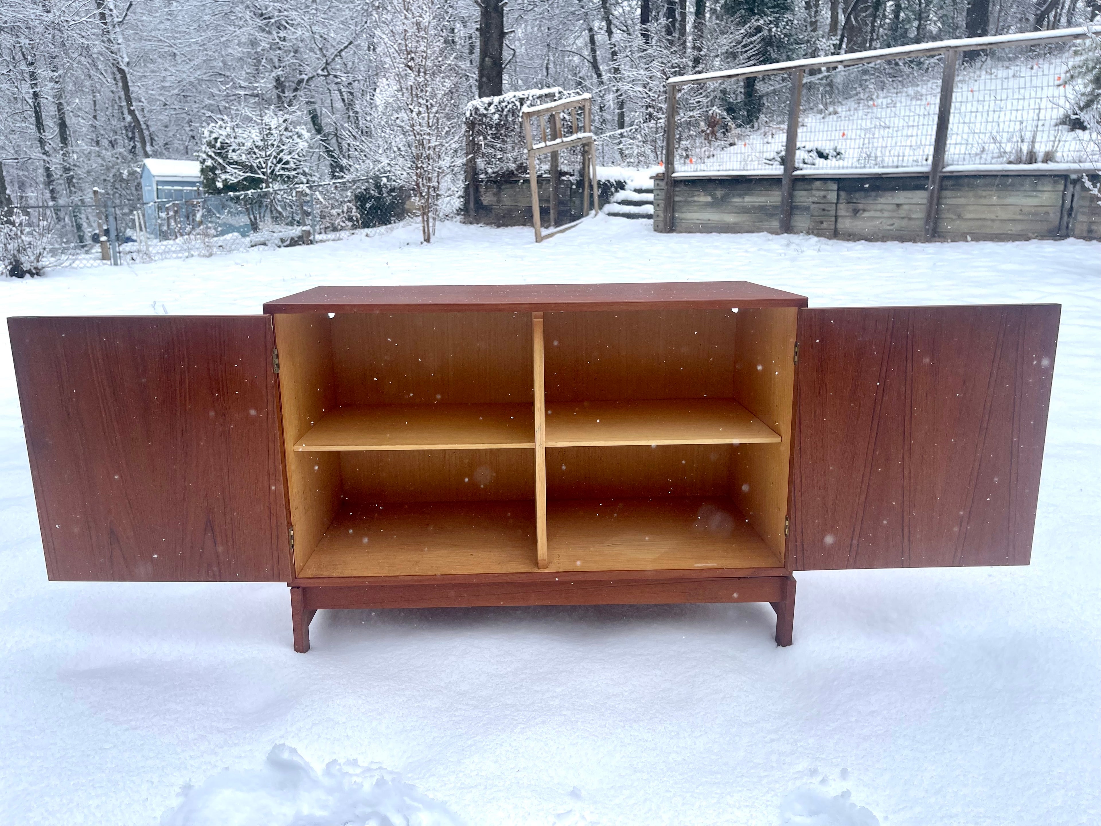 This cabinet, designed by H.G. Mobler, has been retrofitted to add a teak frame not original to the piece. However, the overall effect is quite functional. The cabinet has been fully refinished. The cabinet features four fully adjustable shelves. This piece would make a great record storage piece, small bar, or nightstand.