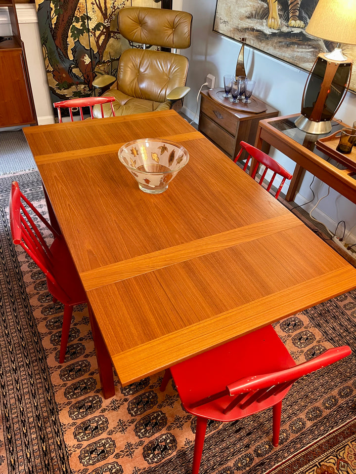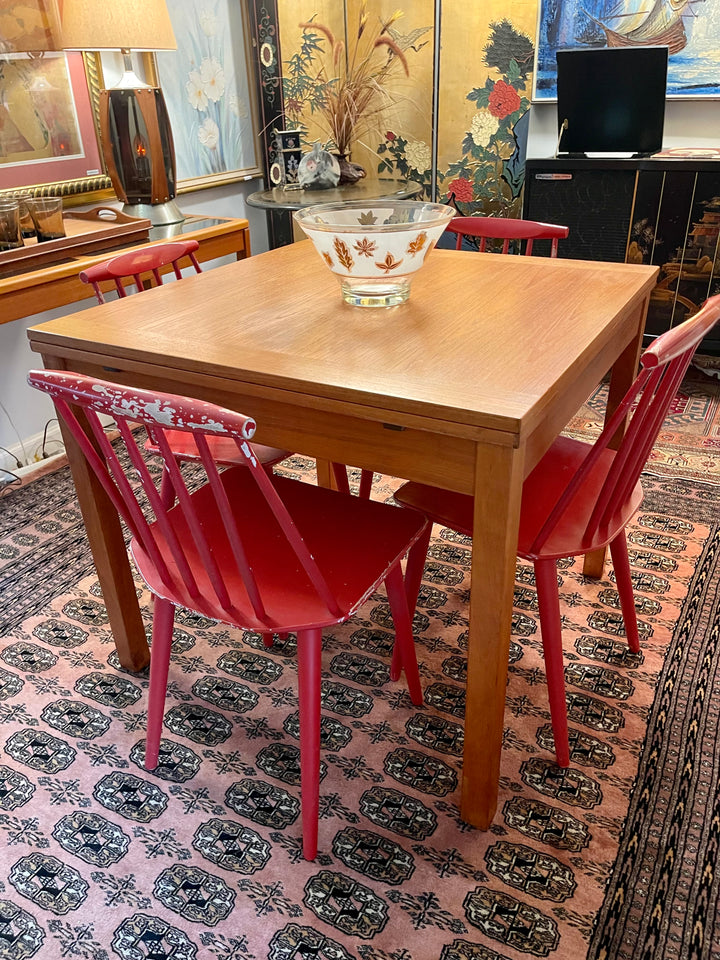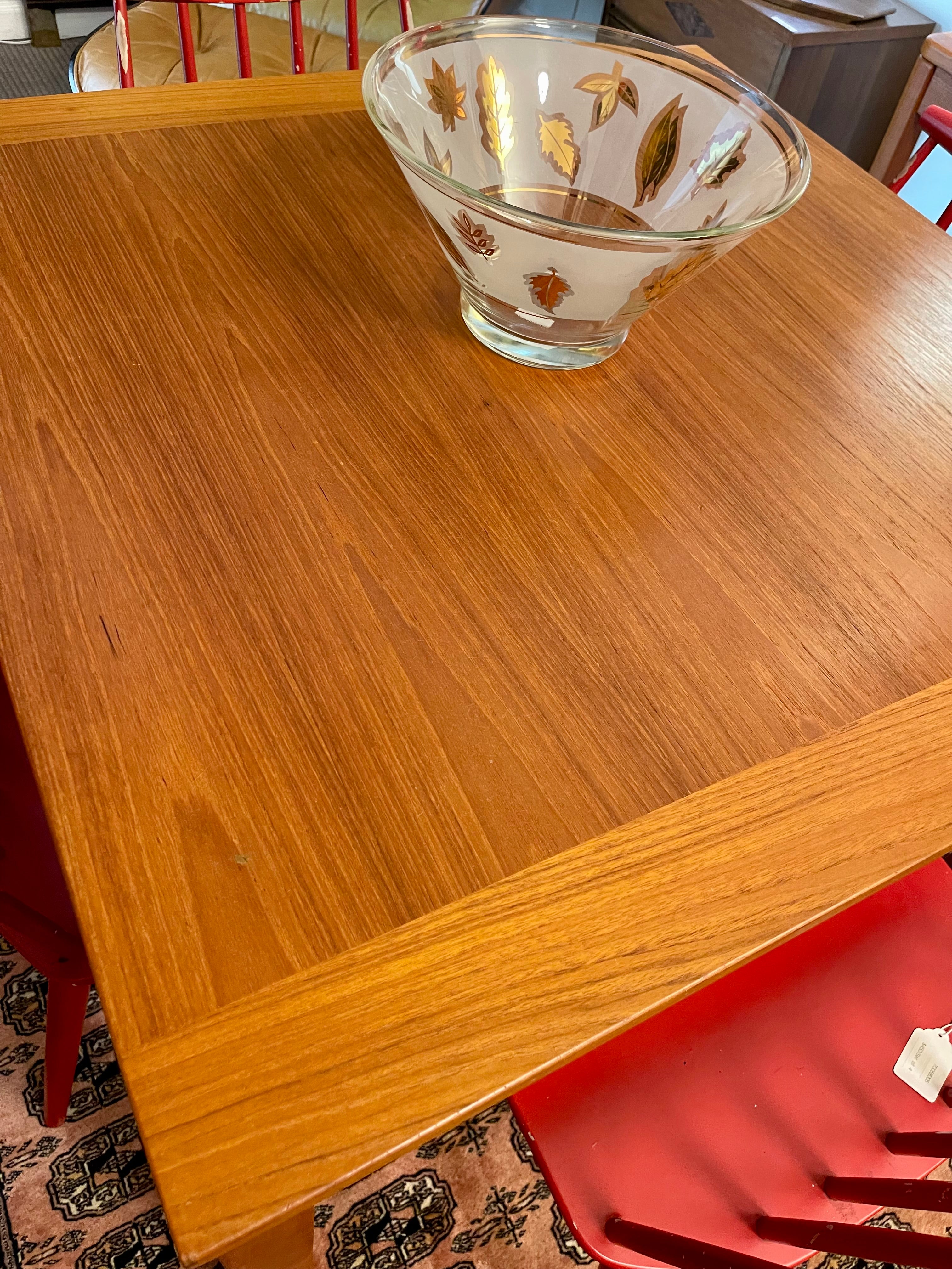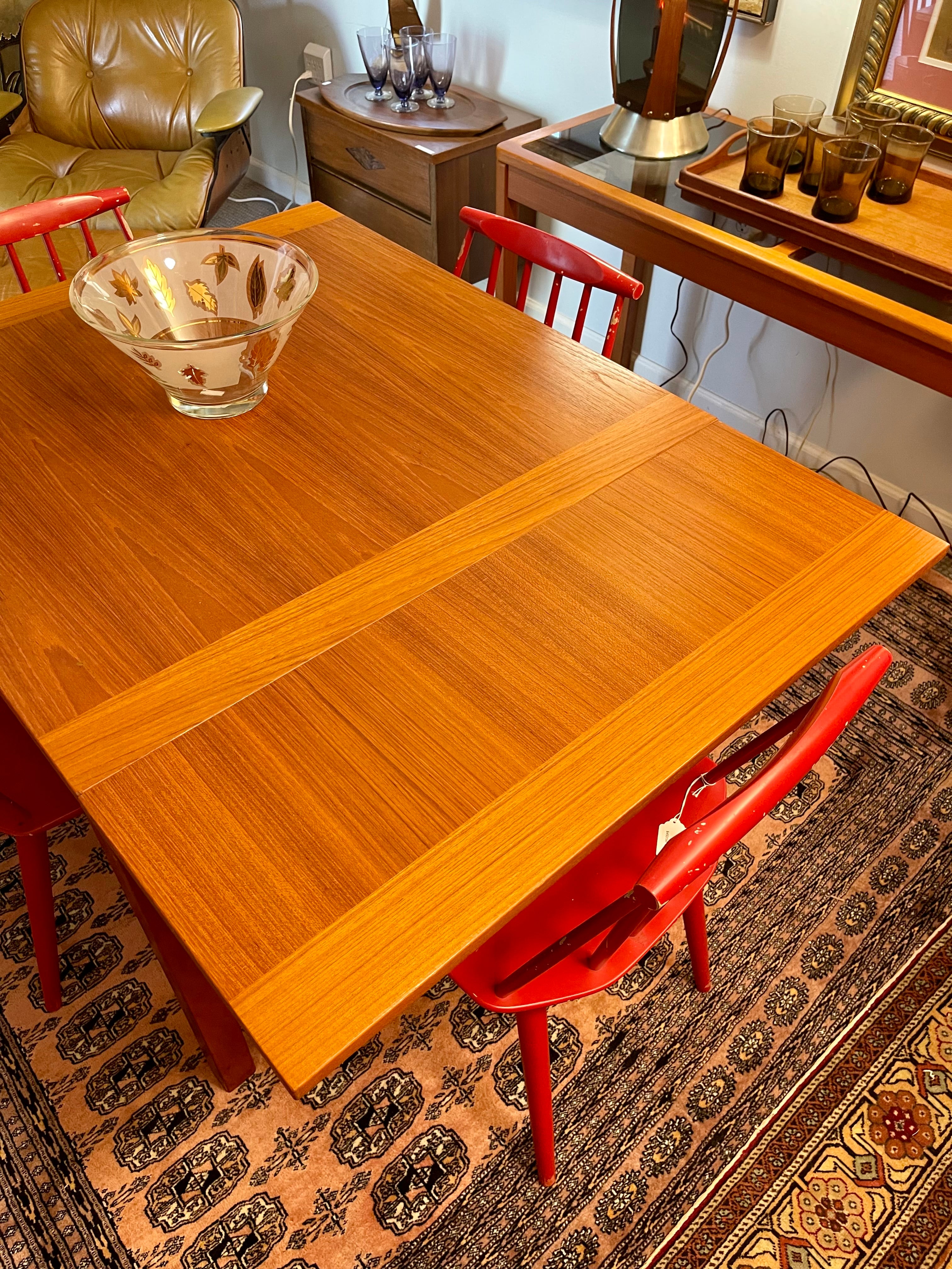Petite teak dining table perfect for apartment or condo living. This piece comfortably seats four, with two leaves stored inside the table. Each leaf adds 12 inches of length to the table, making it 57.25 inches long when fully open. Ideal for saving space!