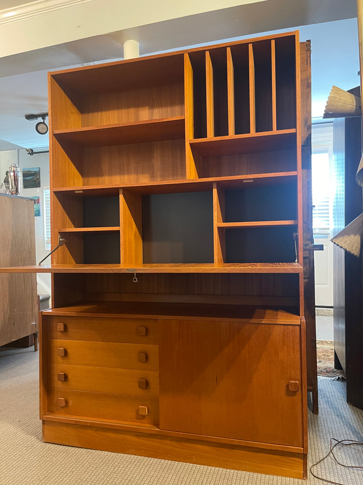 Large teak bookcase/secretary combo from Domino Mobler (Denmark). Lower cabinet has four drawers and cabinet space for storage. The middle section opens to reveal a large desk/workspace. The top section has both book and record storage. Incredibly cool and functional.