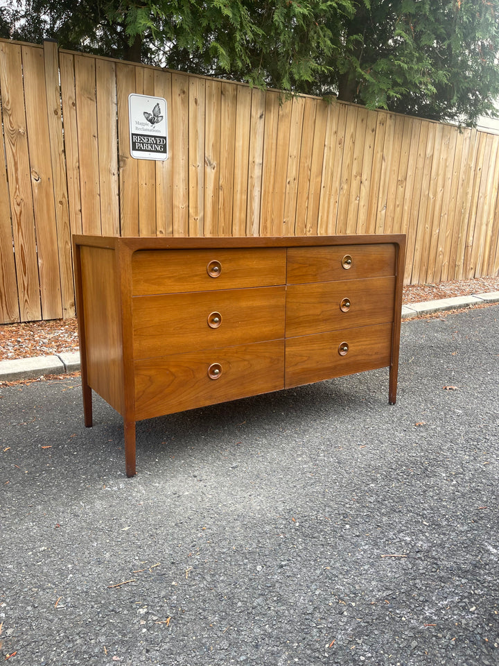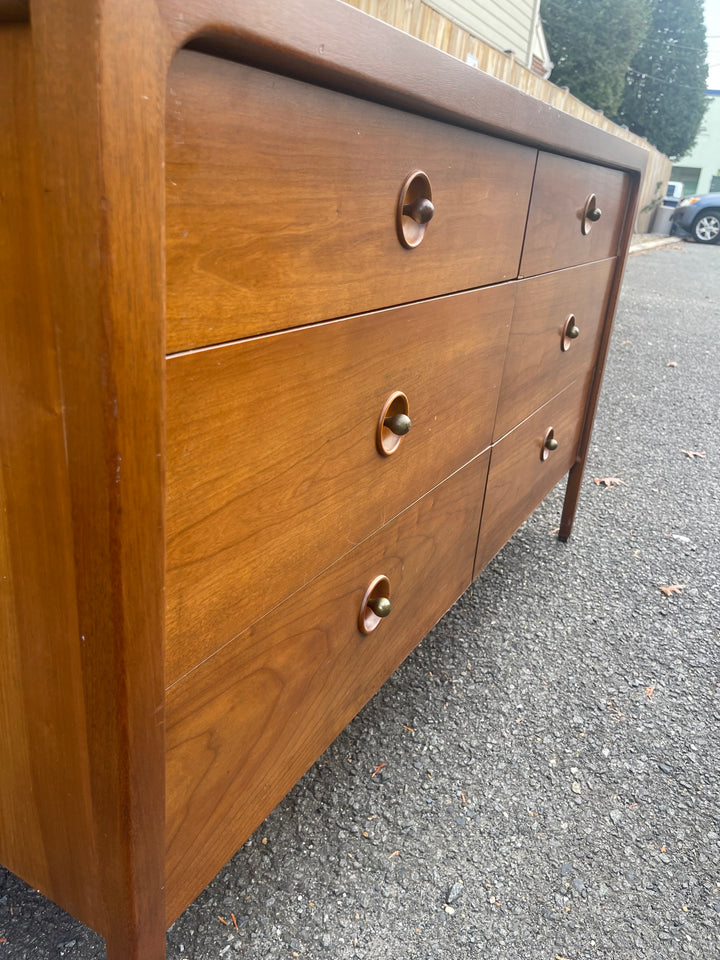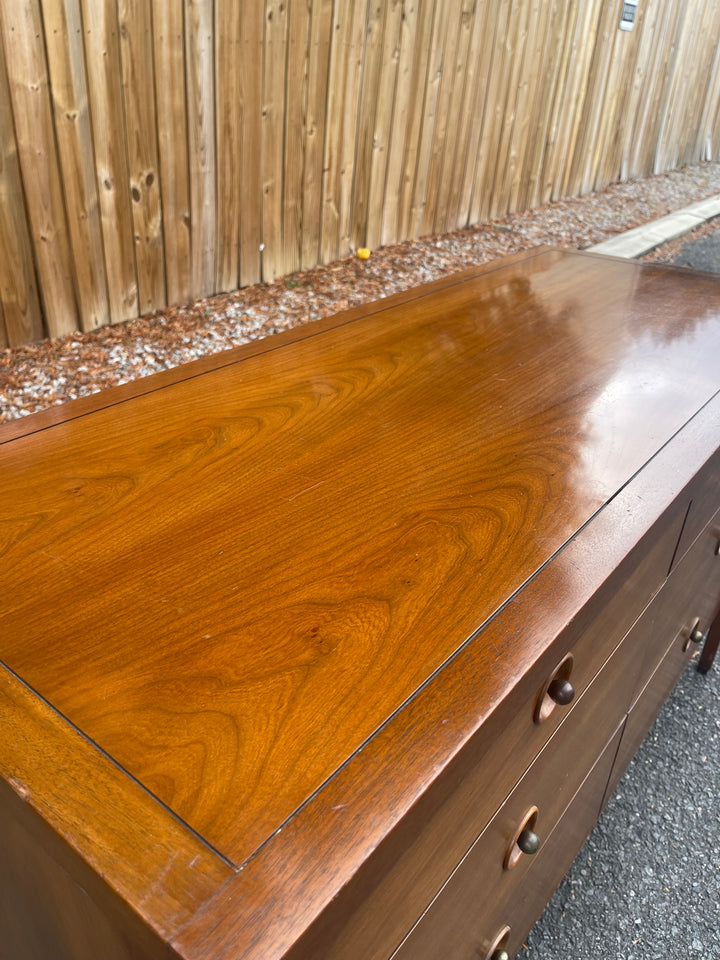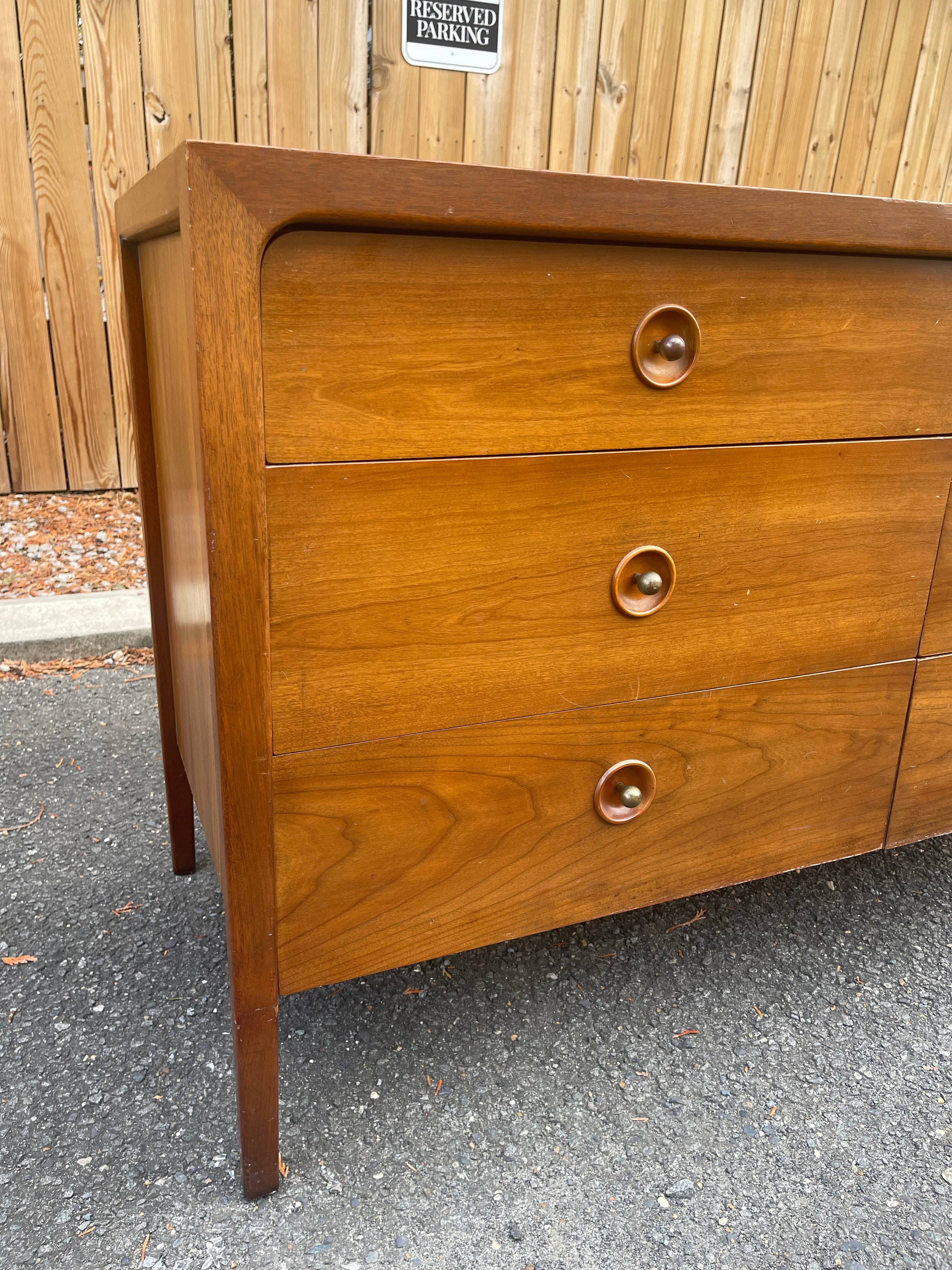 Beautiful walnut case piece from John Van Koert for Drexel Furniture. “Counterpoint” series. Unique frame suspends the case to give this piece a distinct Midcentury modern look. Brass pulls with a walnut backing. Matching set available .