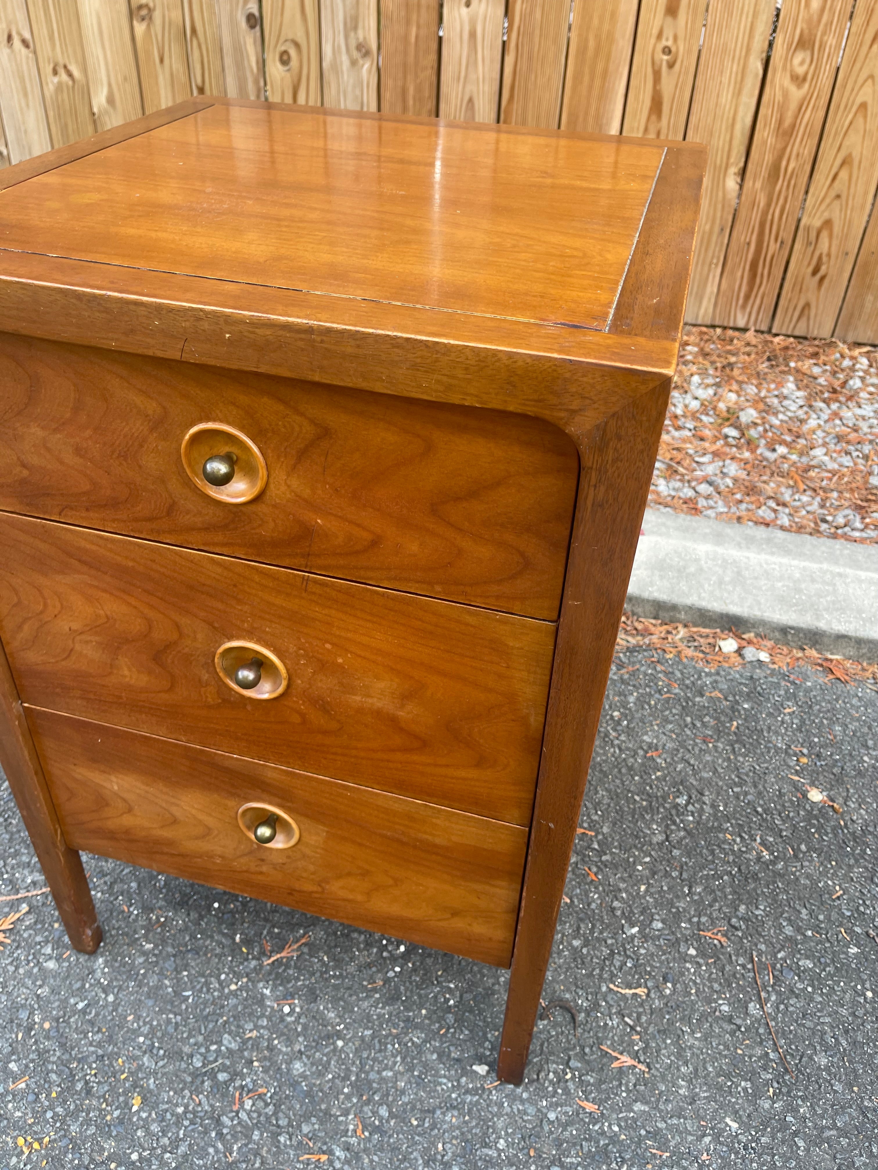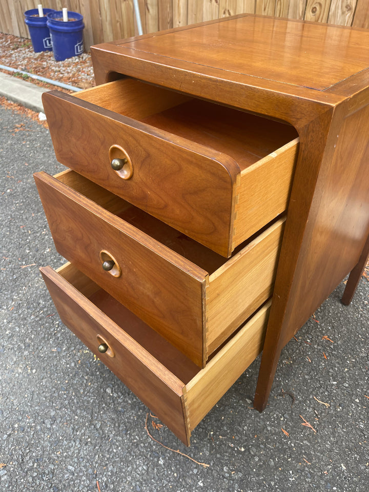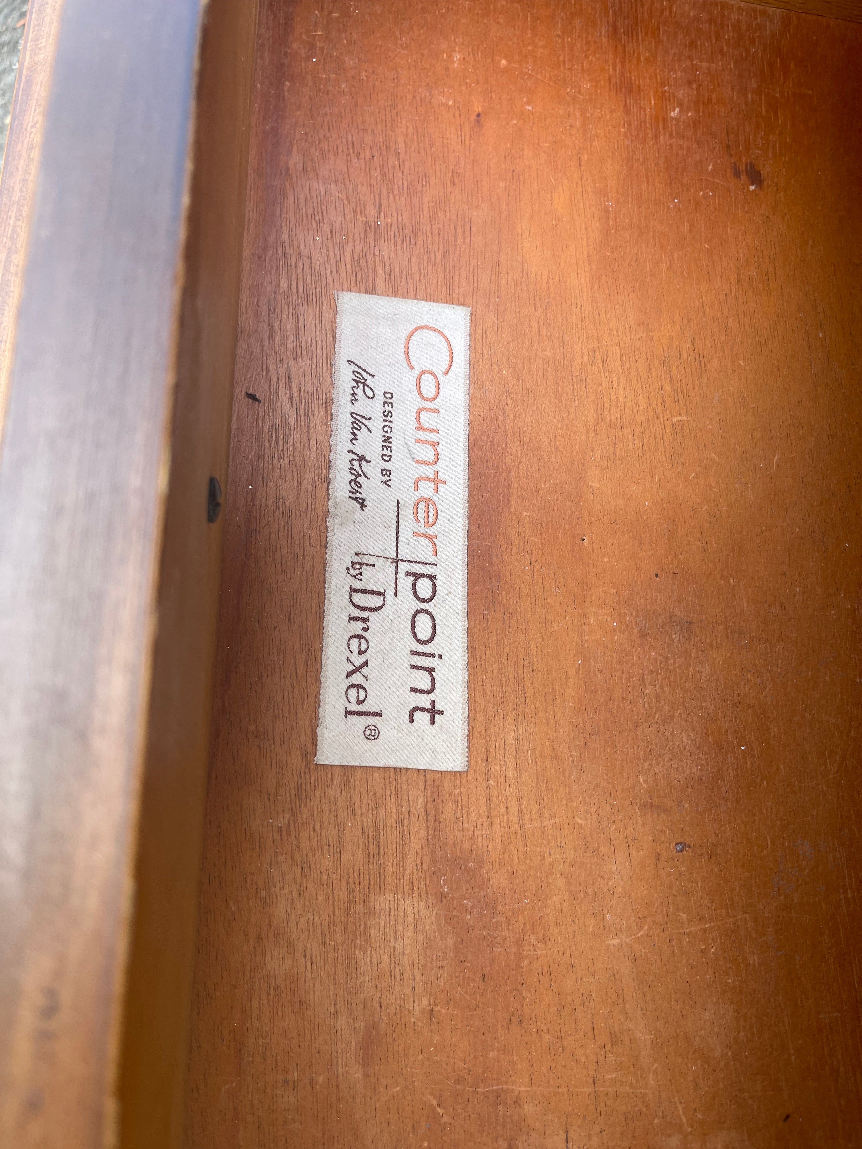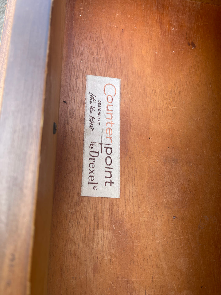 Beautiful walnut case piece from John Van Koert for Drexel Furniture. “Counterpoint” series. Unique frame extendsbeyond the case to give this piece a distinct Midcentury modern look. Three drawers. Matching set available.