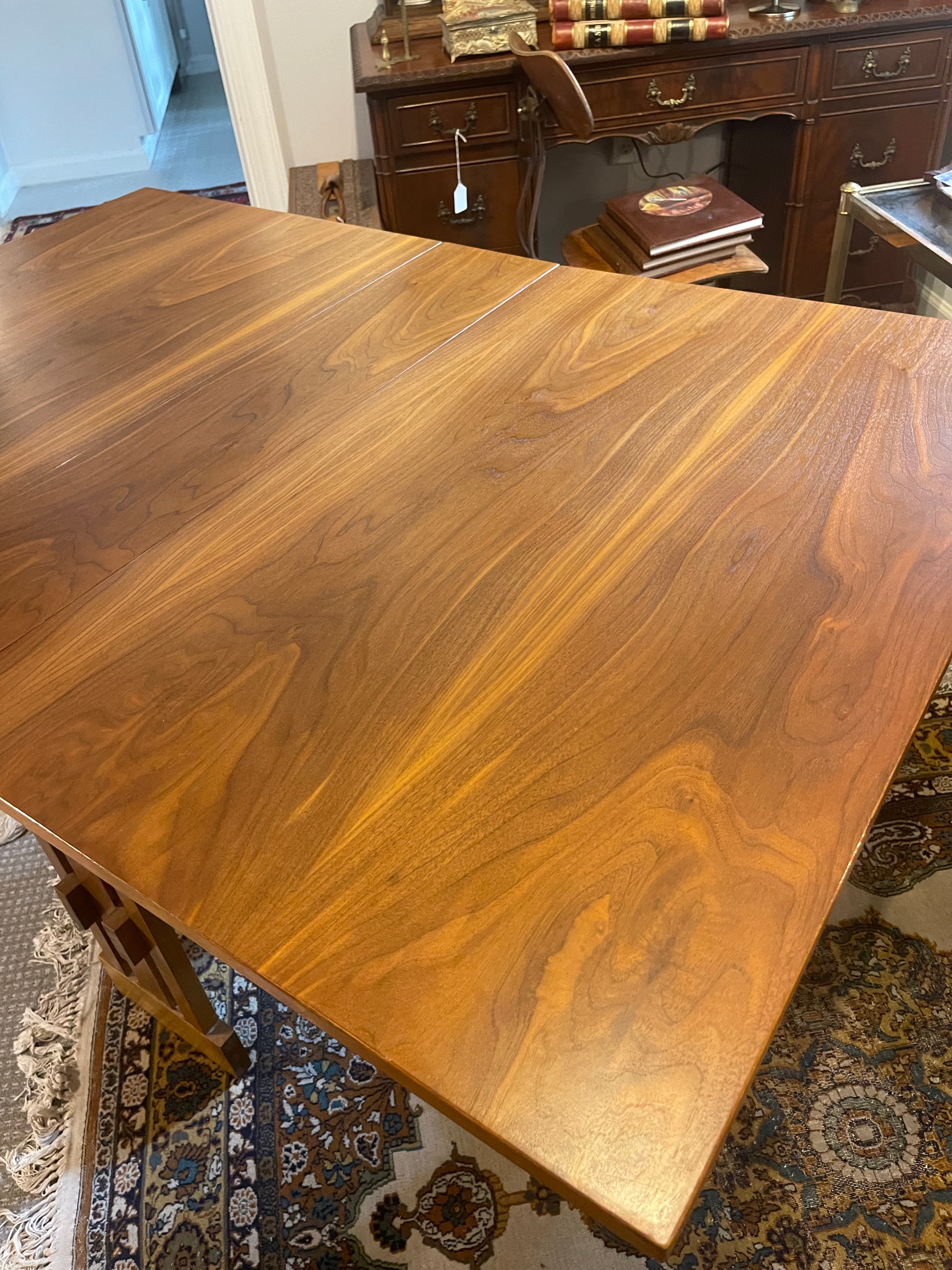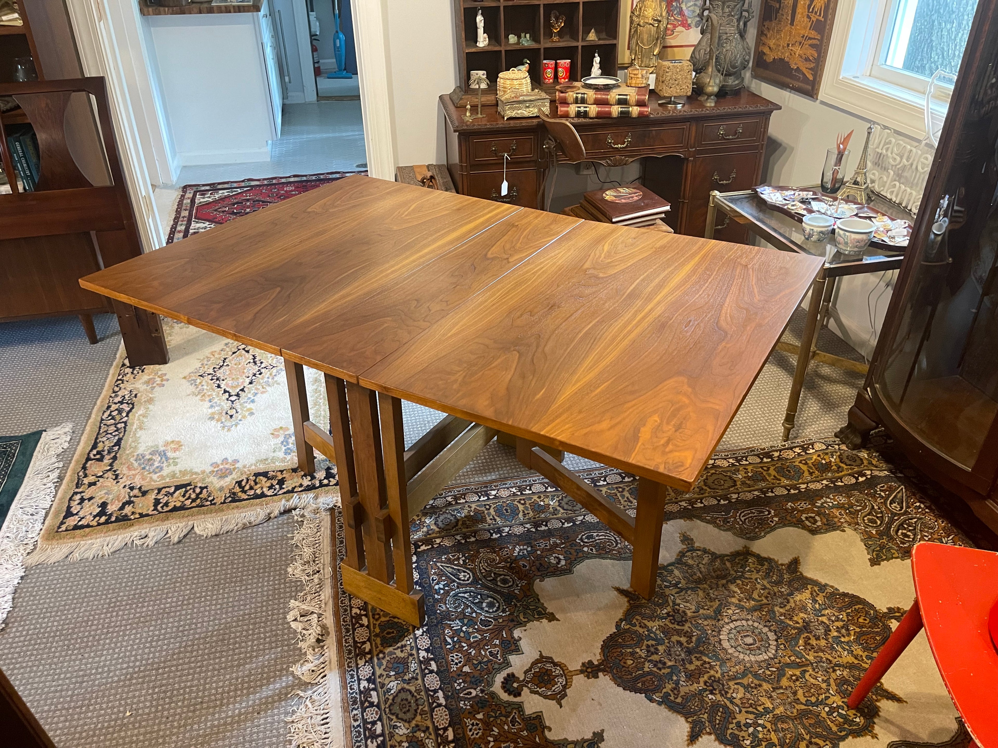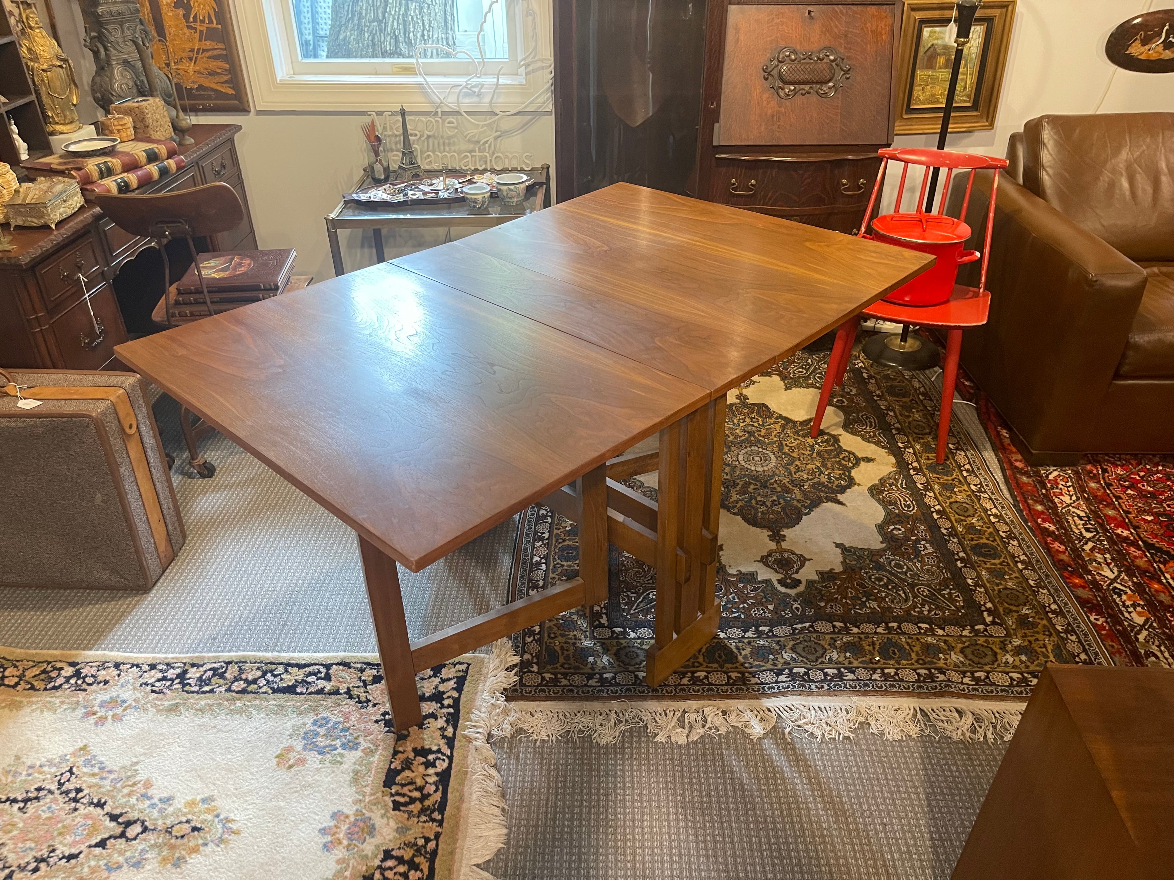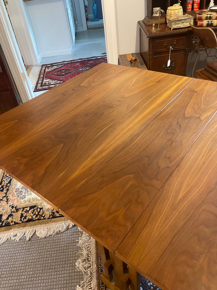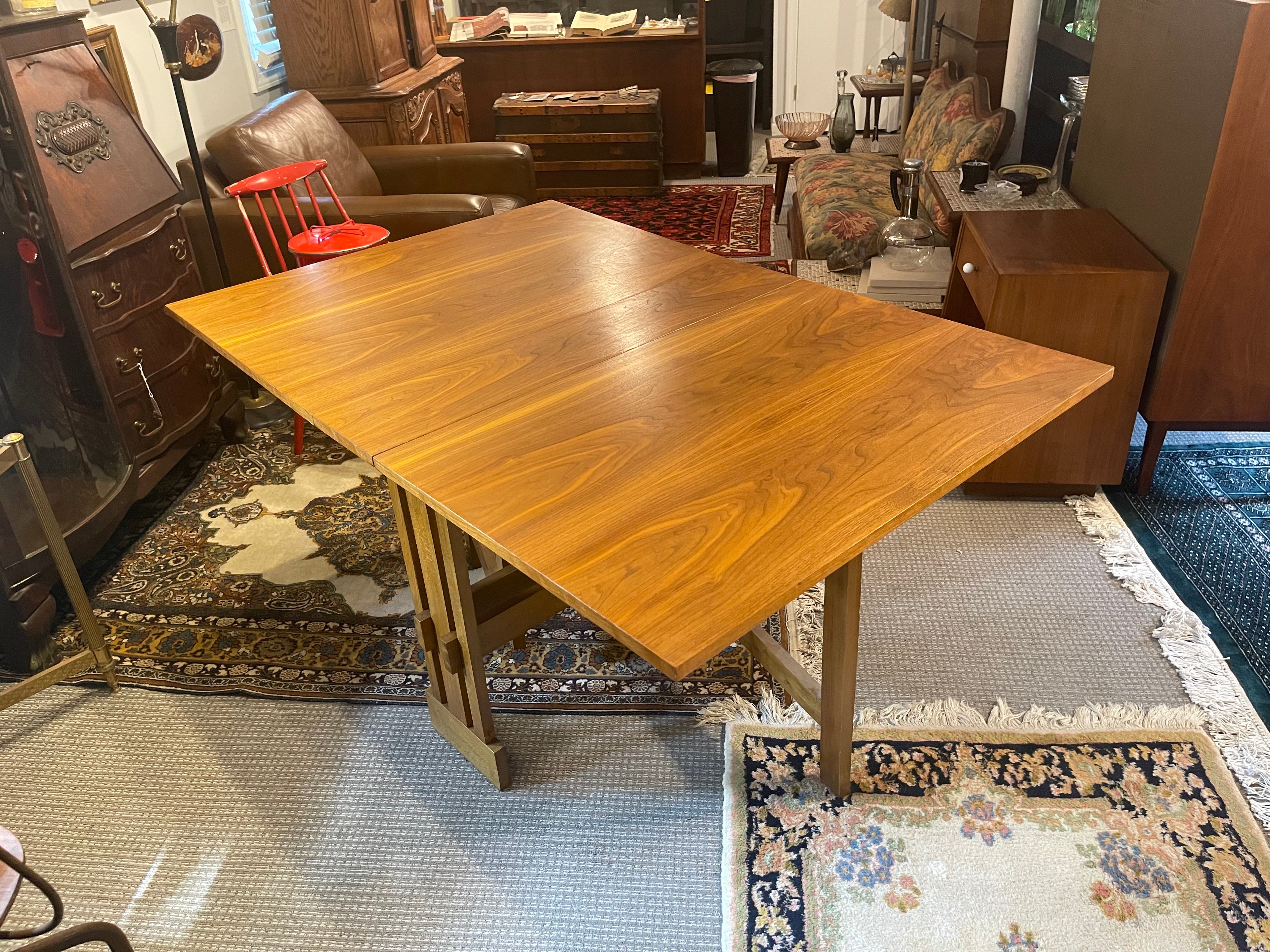 Versatile Midcentury modern walnut dining table. This piece has two extending leaves which collapse easily for convenient storage. Perfect as a bistro table in a kitchen area that can be easily repurposed for a larger setting. The walnut grain on this piece is striking and in excellent vintage condition.