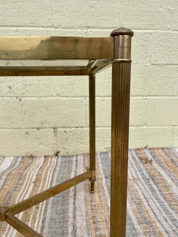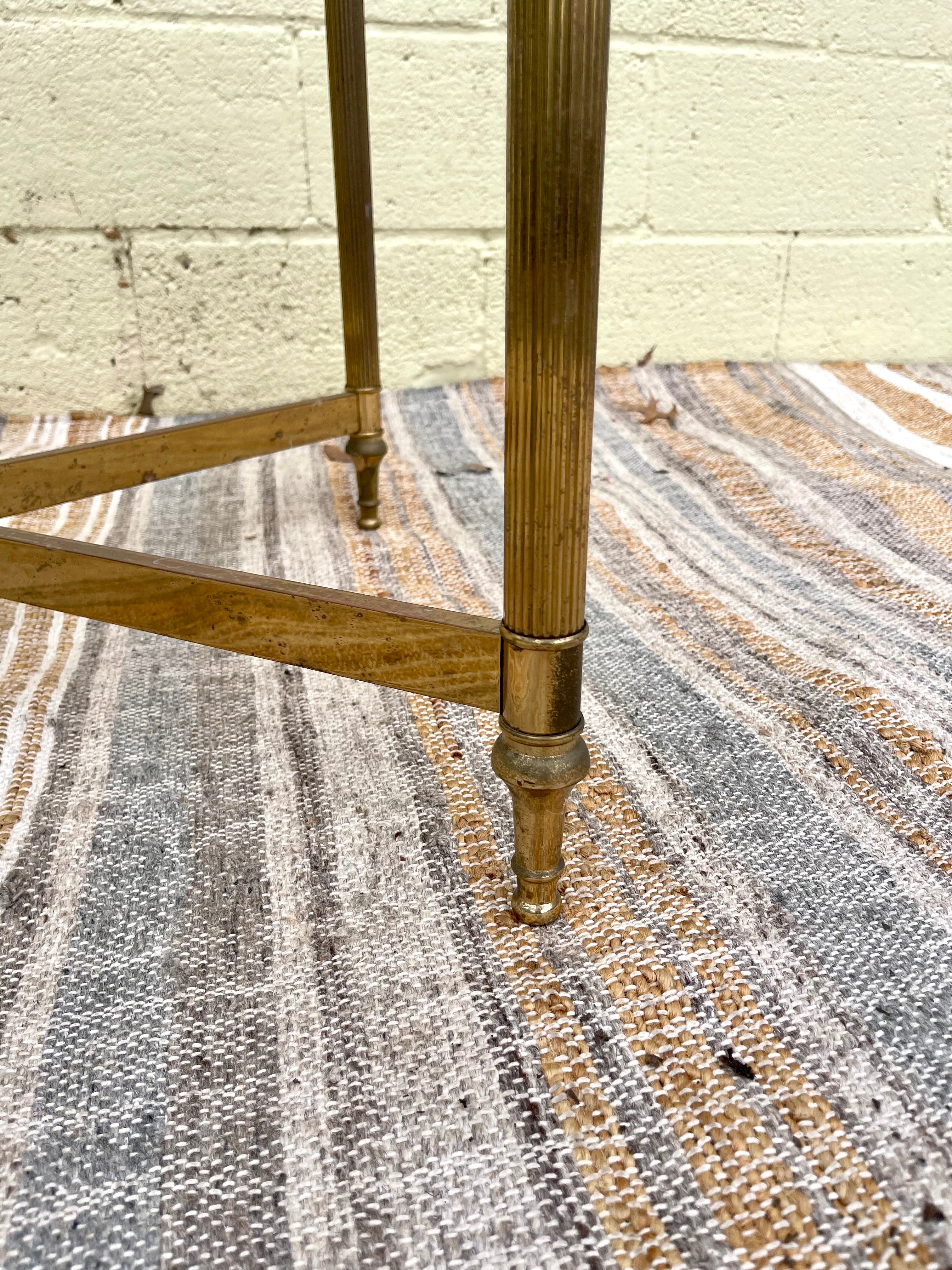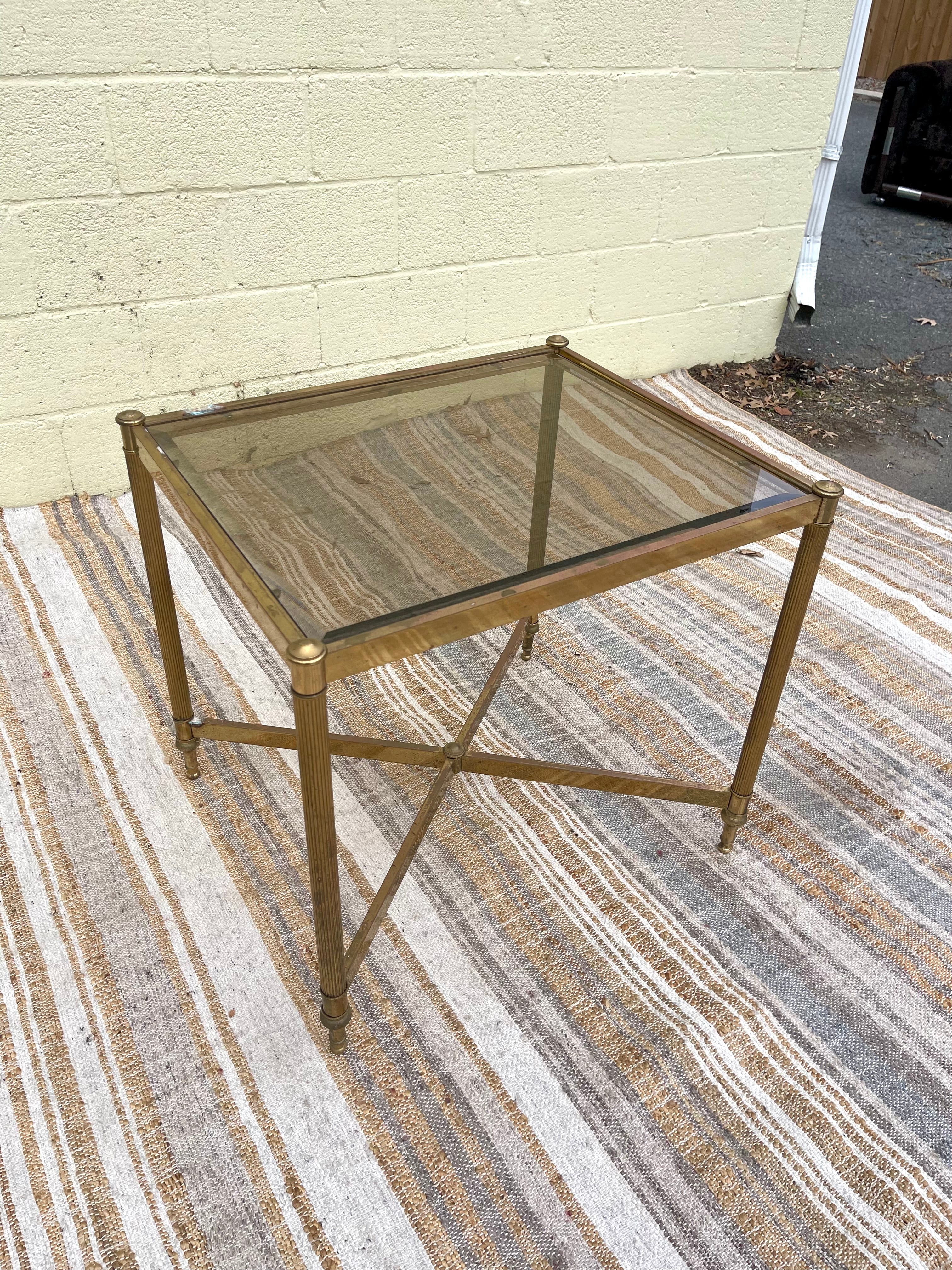Heavy brass side table with a smoked glass insert. Good vintage condition with a few spots of discoloration on the brass. Classic construction and lines make this a useful piece in just about any space.
