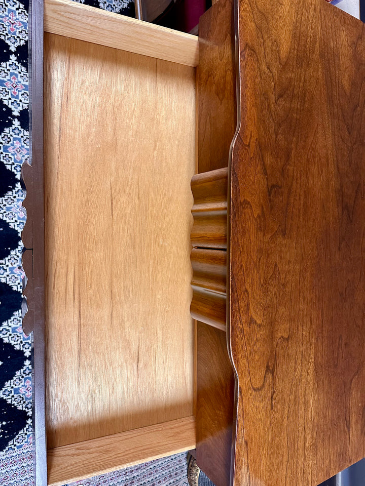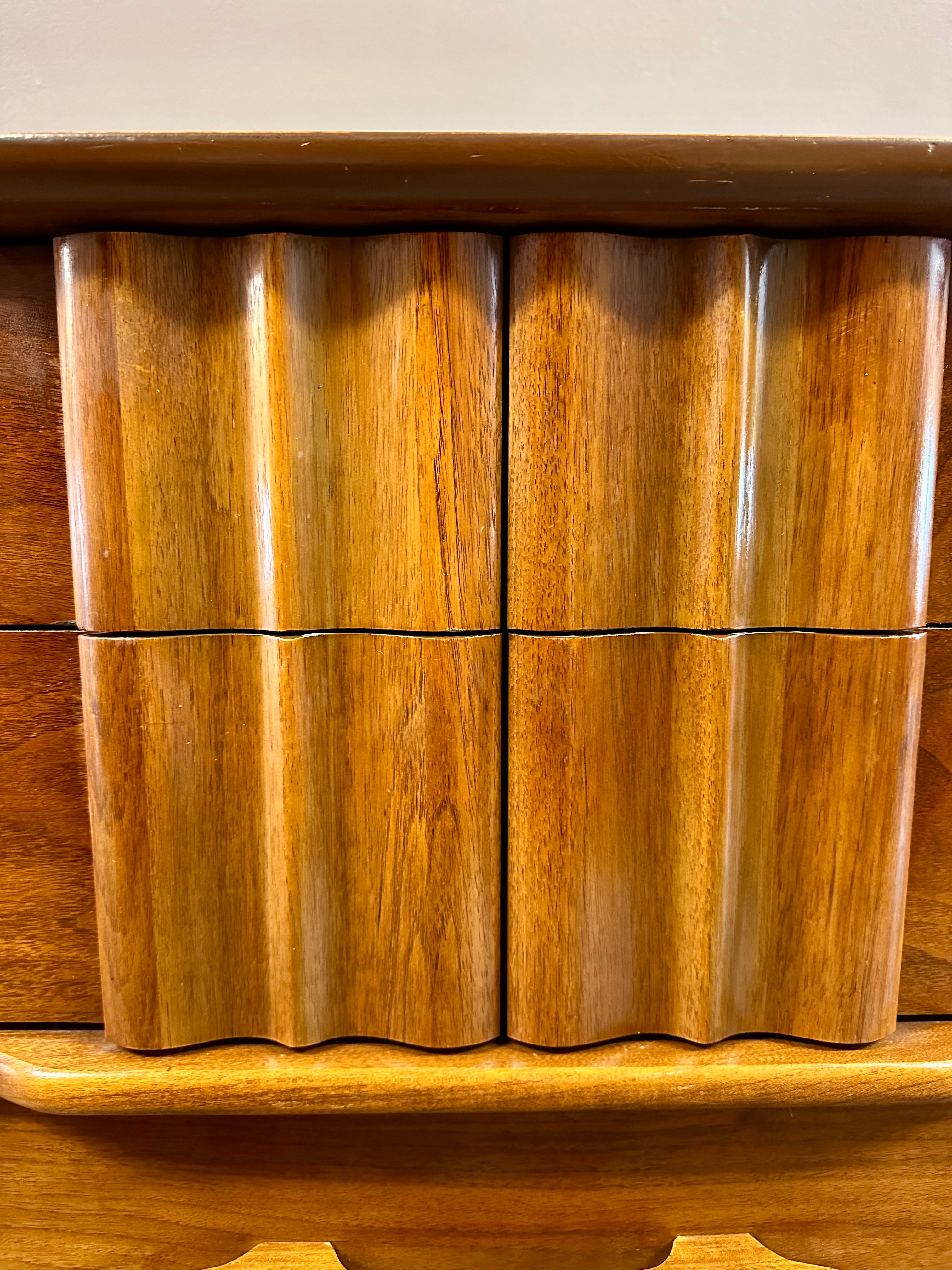 Large drawers with unique wood pulls and plenty of storage space. Walnut in good vintage condition condition, refinish available upon request.