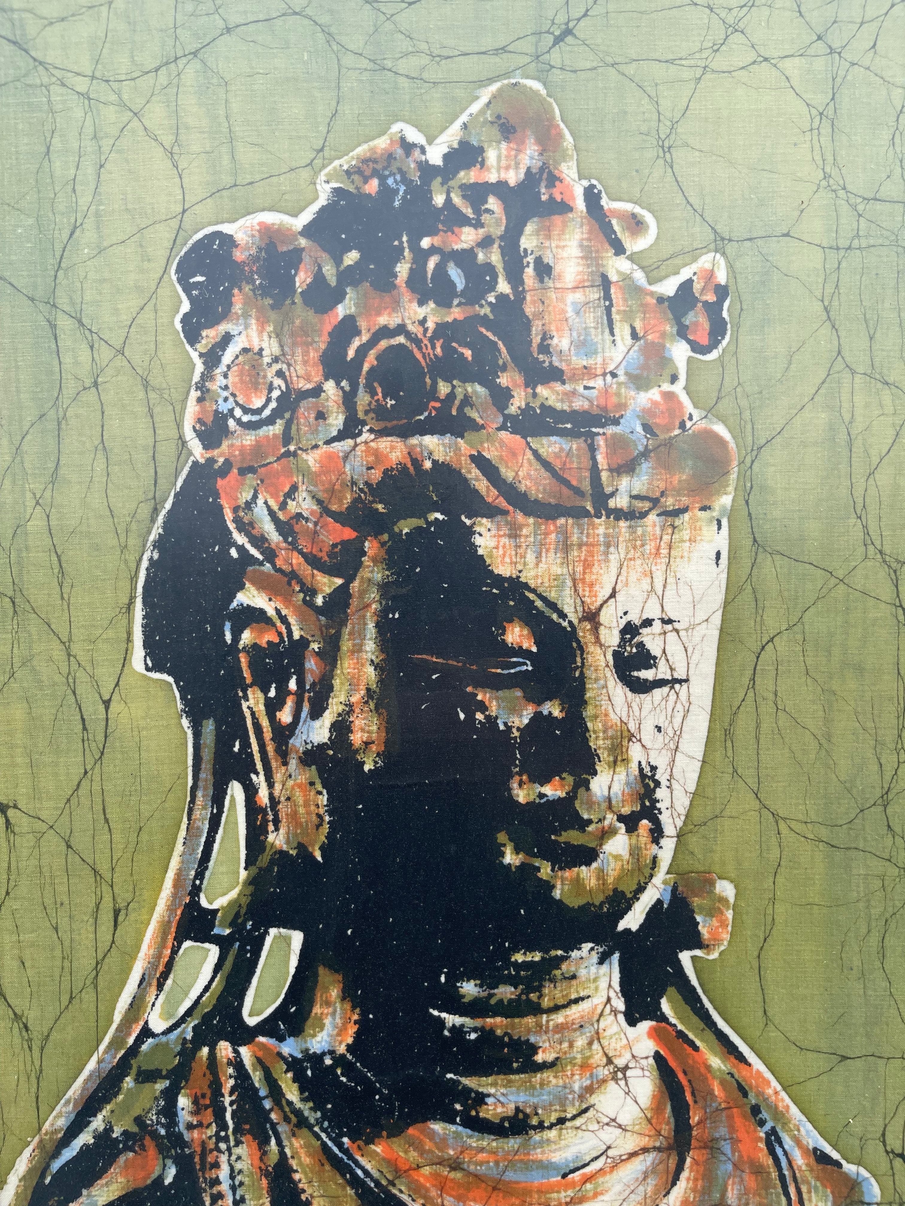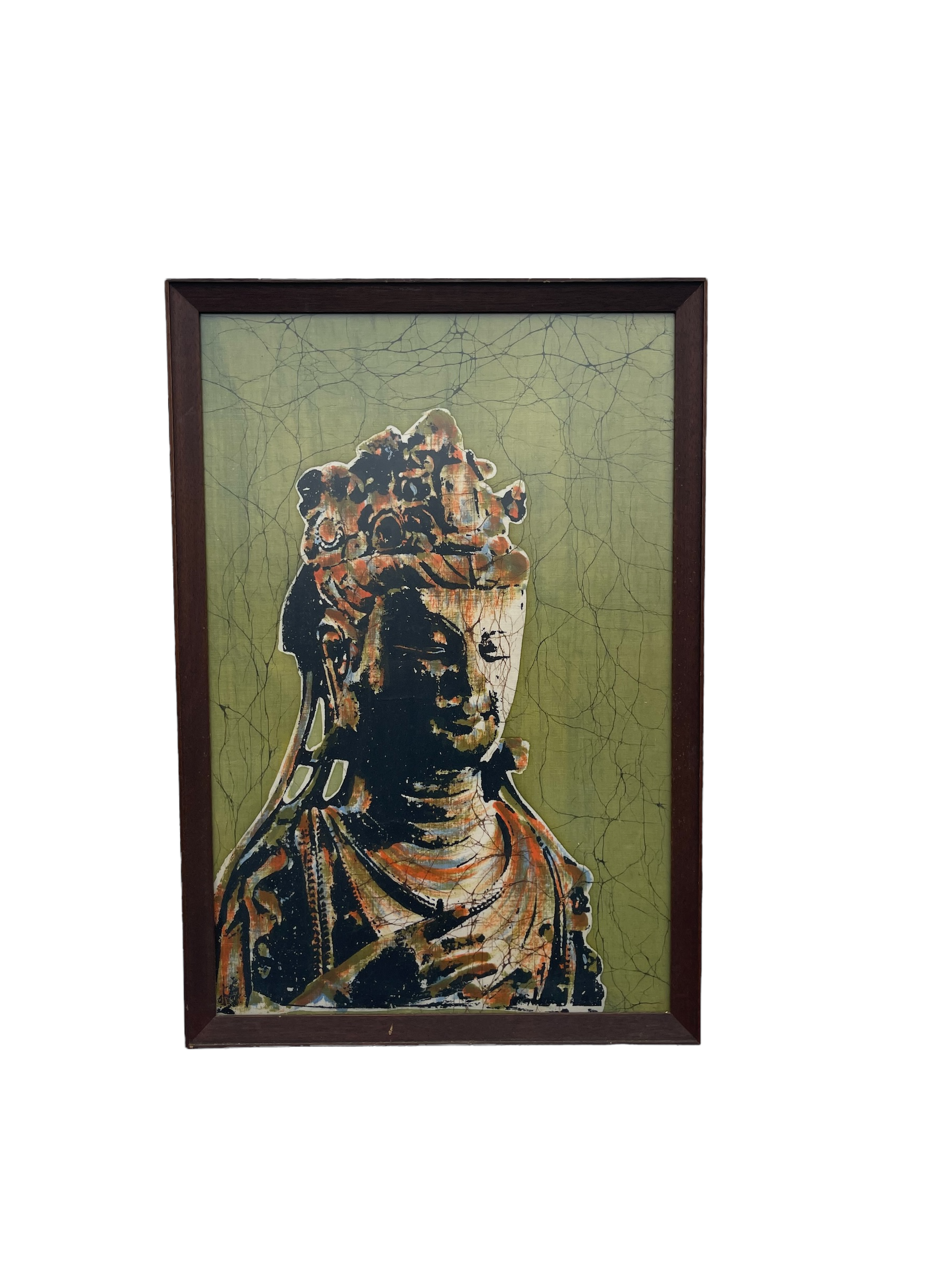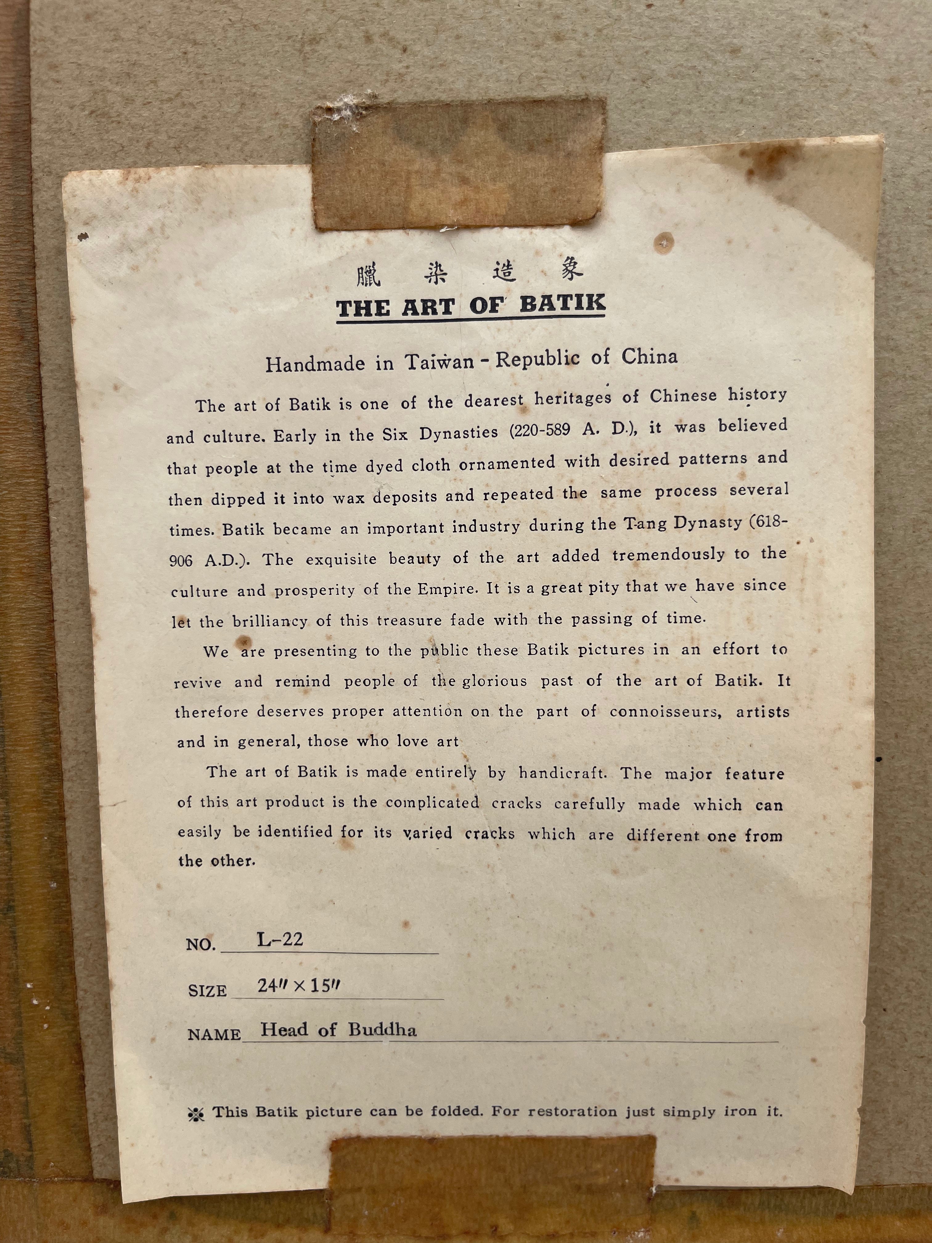 Large vintage Buddha batik handmade in Taiwan. Still in its original vintage frame with interesting facts about batik making and Chinese culture on the back.