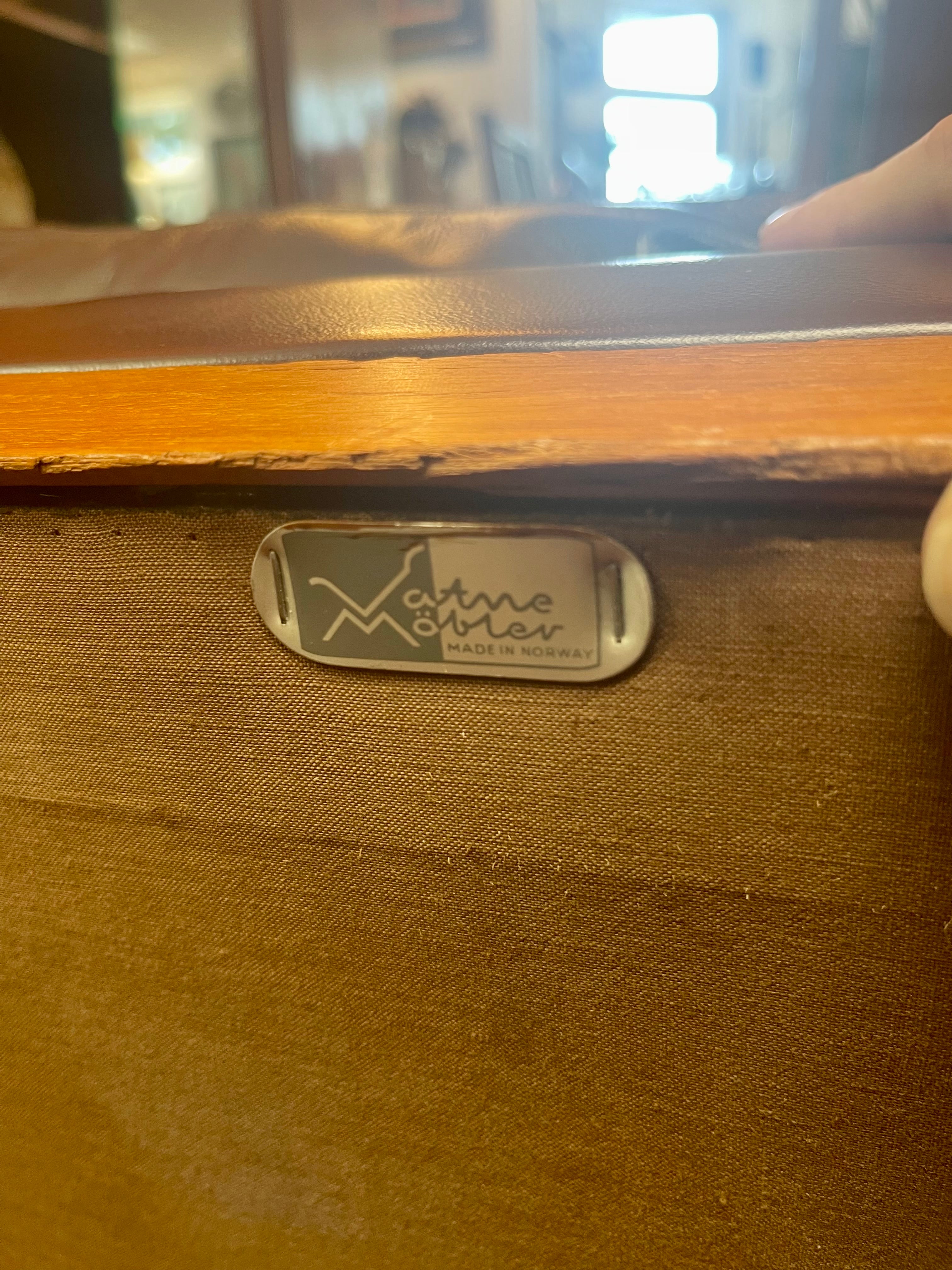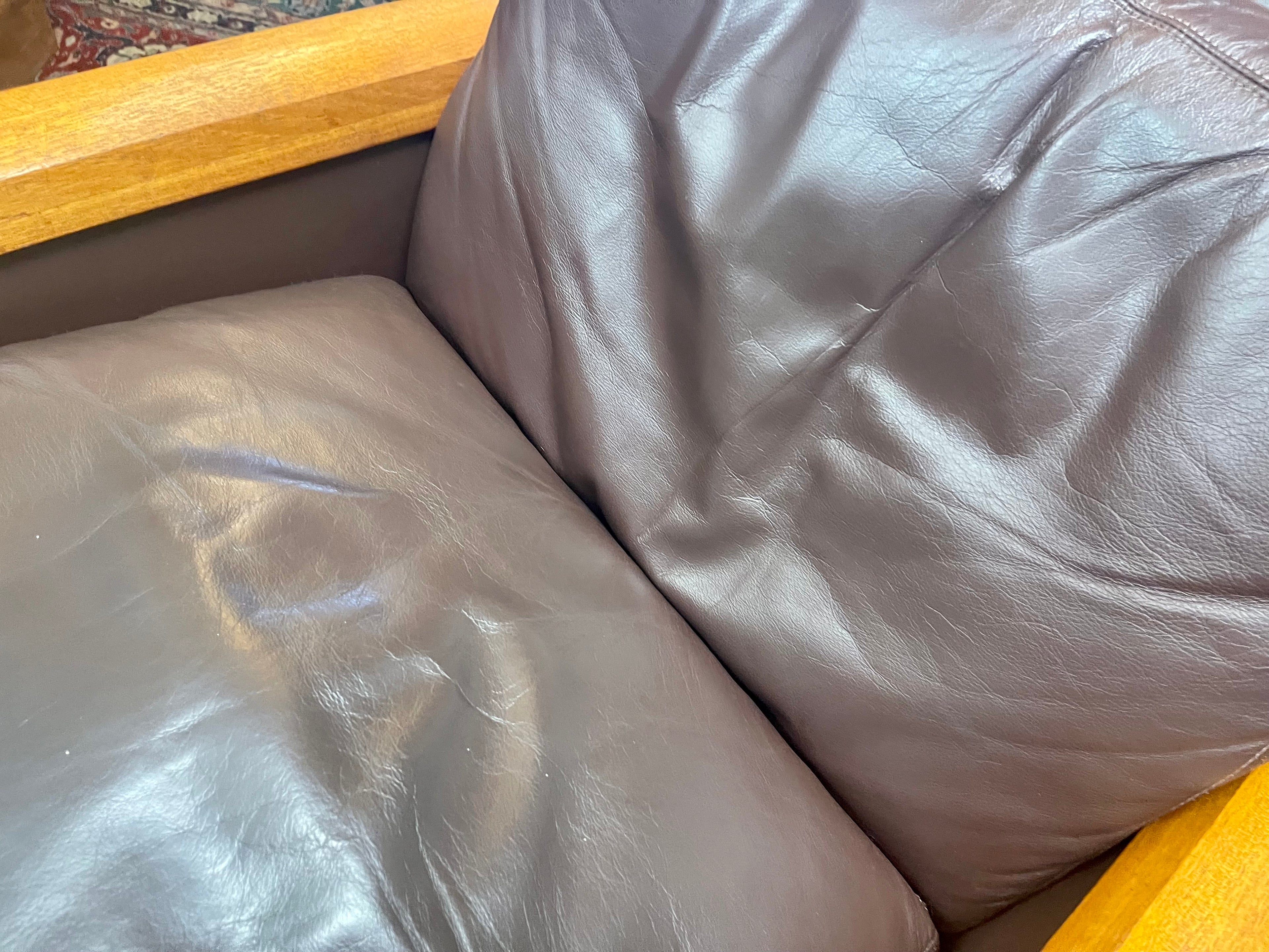 Knut Sæter in collaboration with Fredrik Kayser designed this handsome teak lounge chair for Norwegian manufacturer Vatne Møbler. The chair features striking rolled edges and is comfortably upholstered in brown leather. Down-stuffed pillows make this incredibly comfortable.