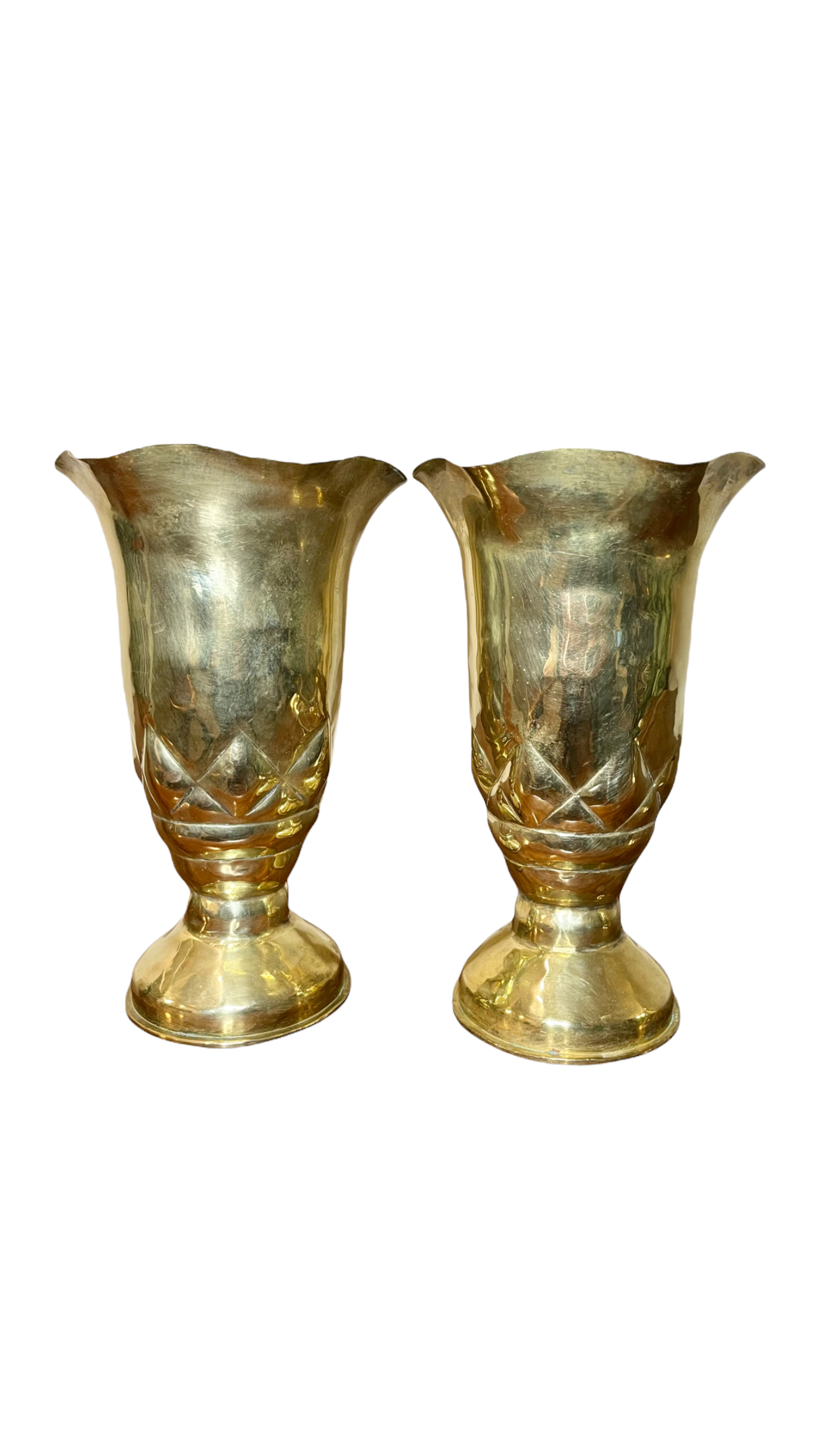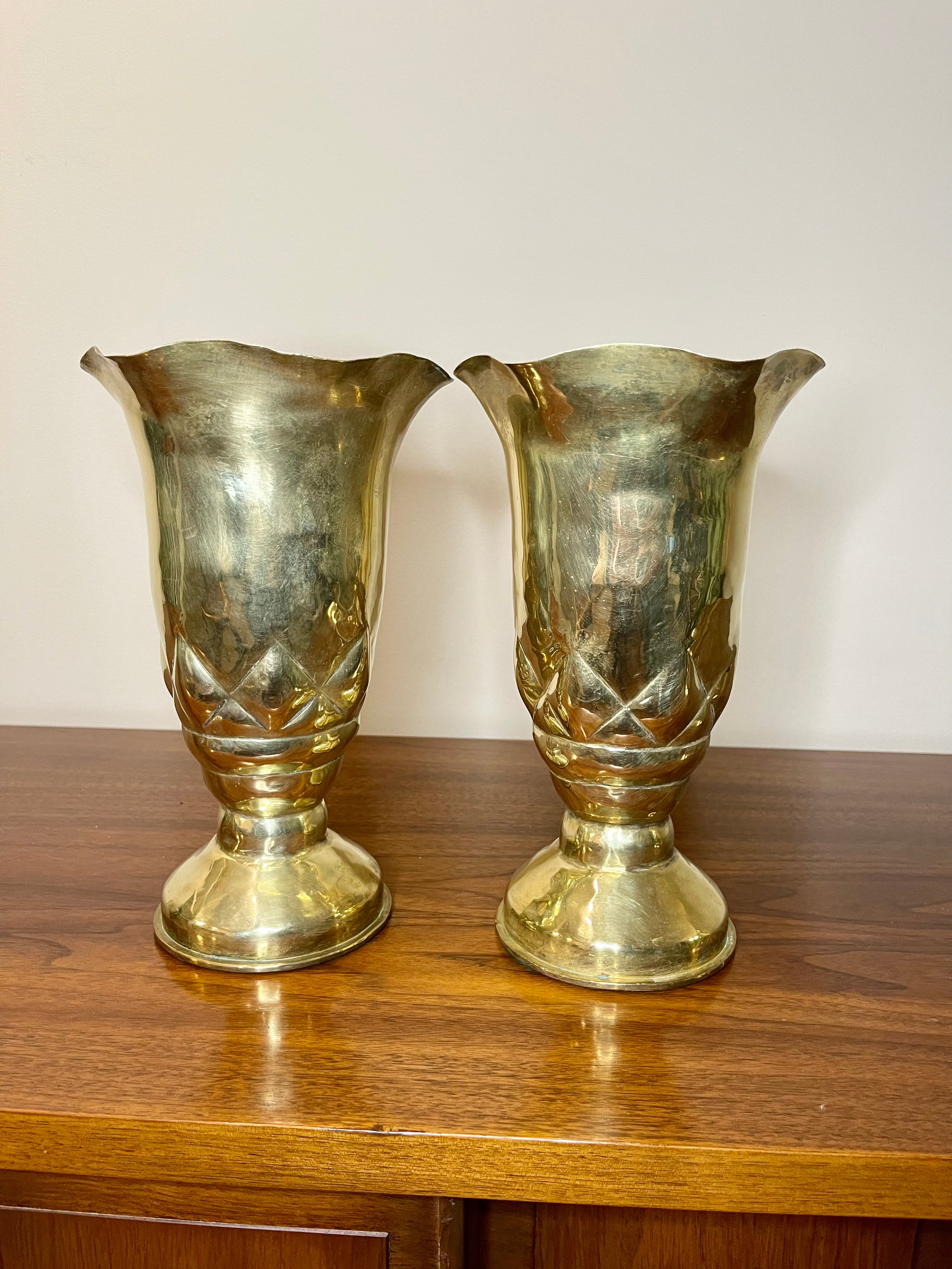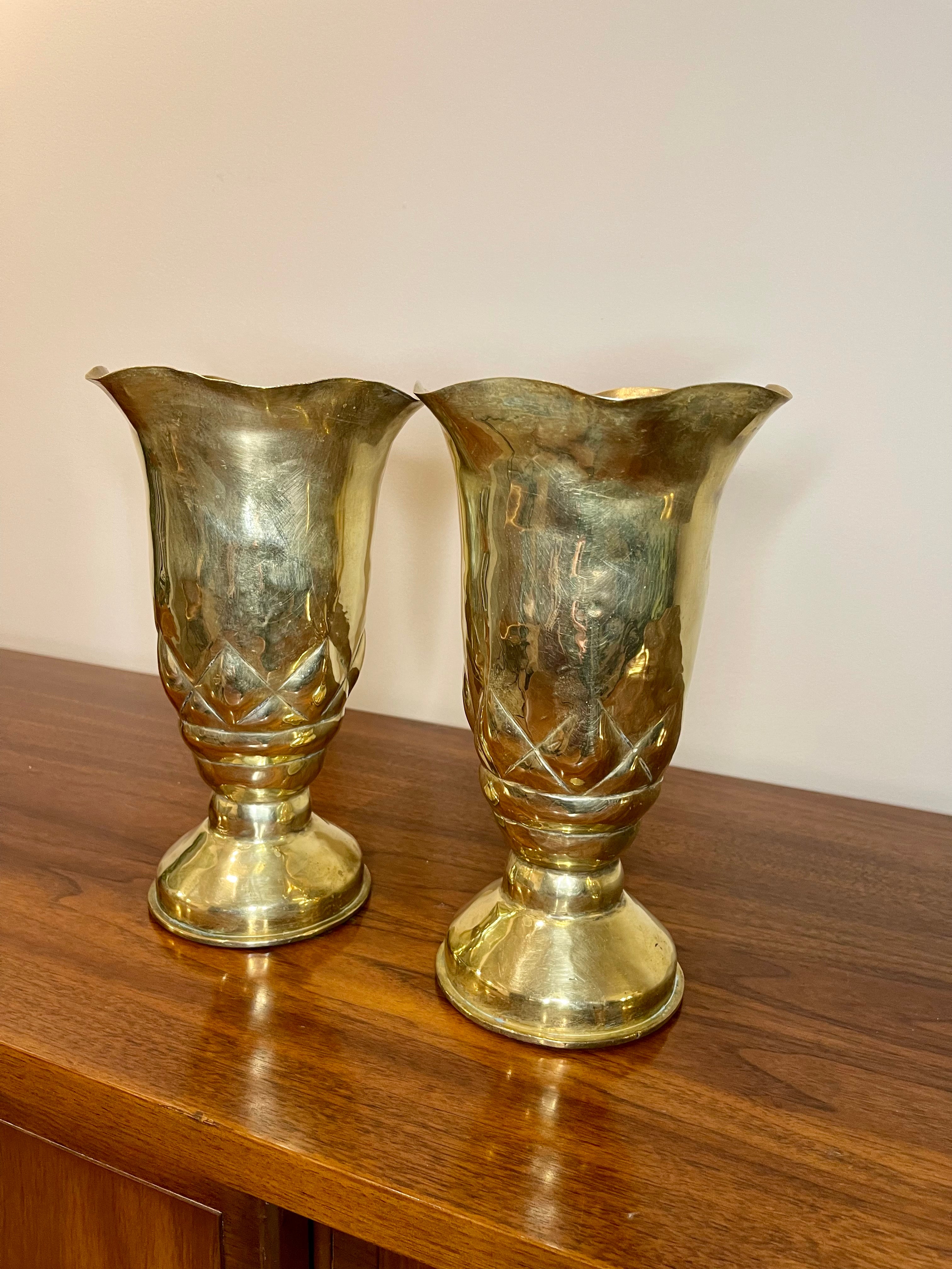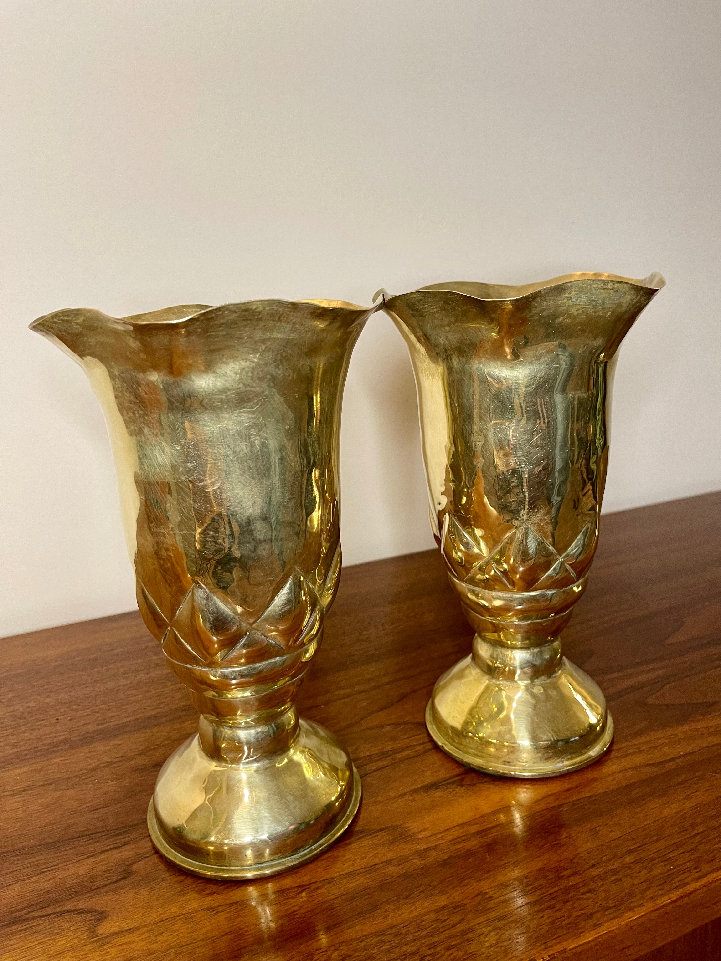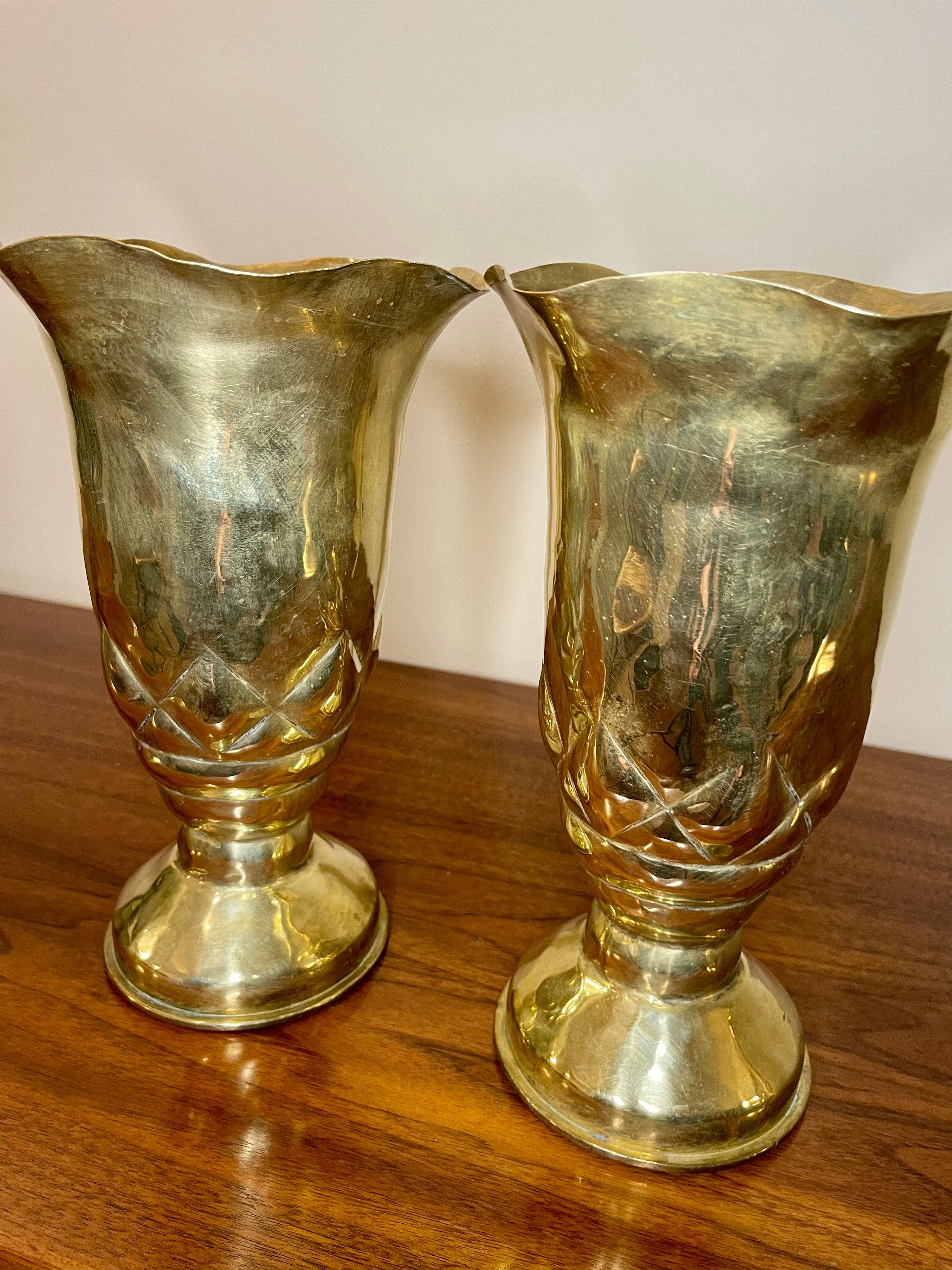 Hollywood regency brass vase pair. Hand made details and heavily weighted base with protective felt on the bottom. Be auto fully patinaed and shows signs of age on the interior.