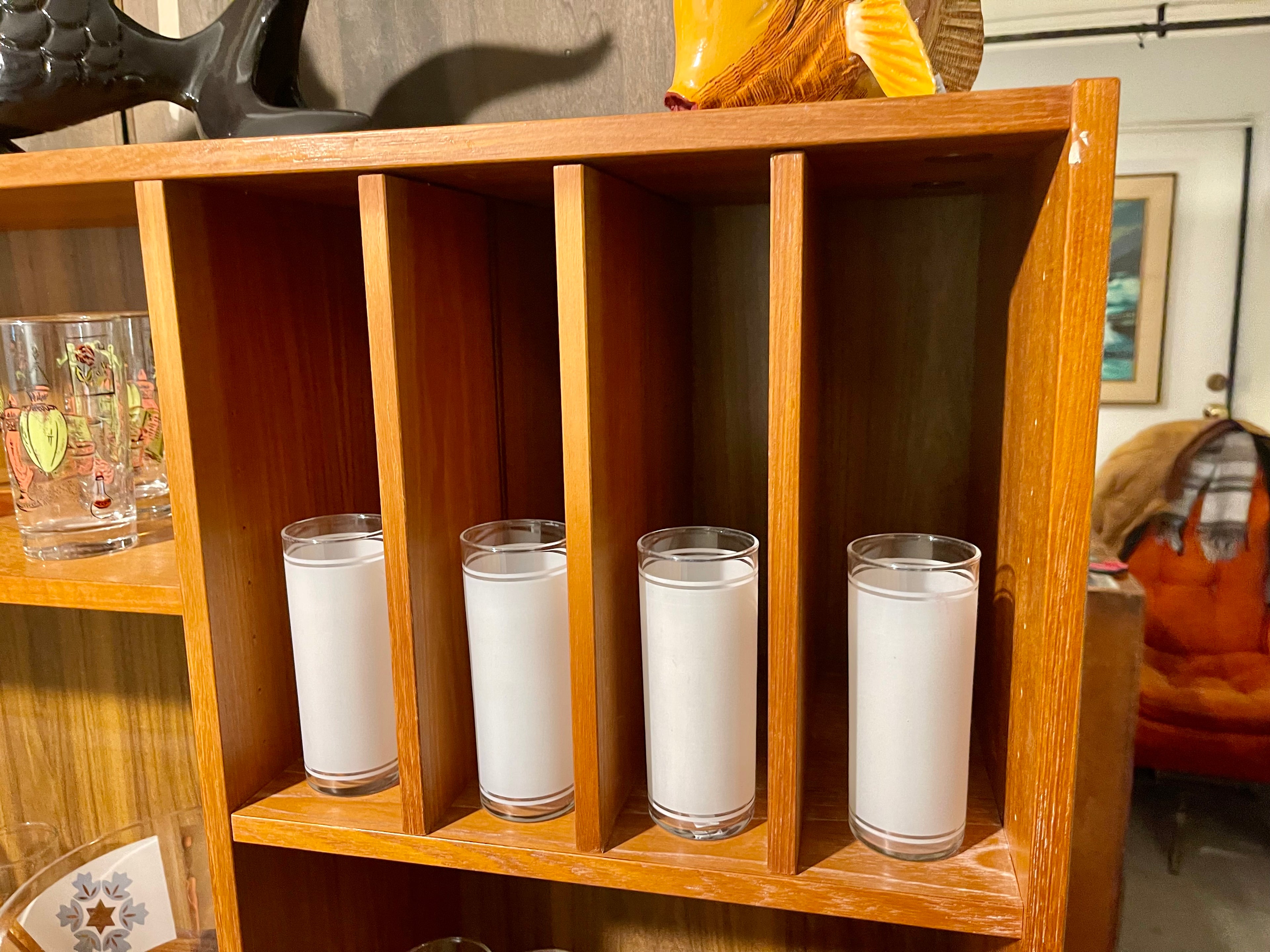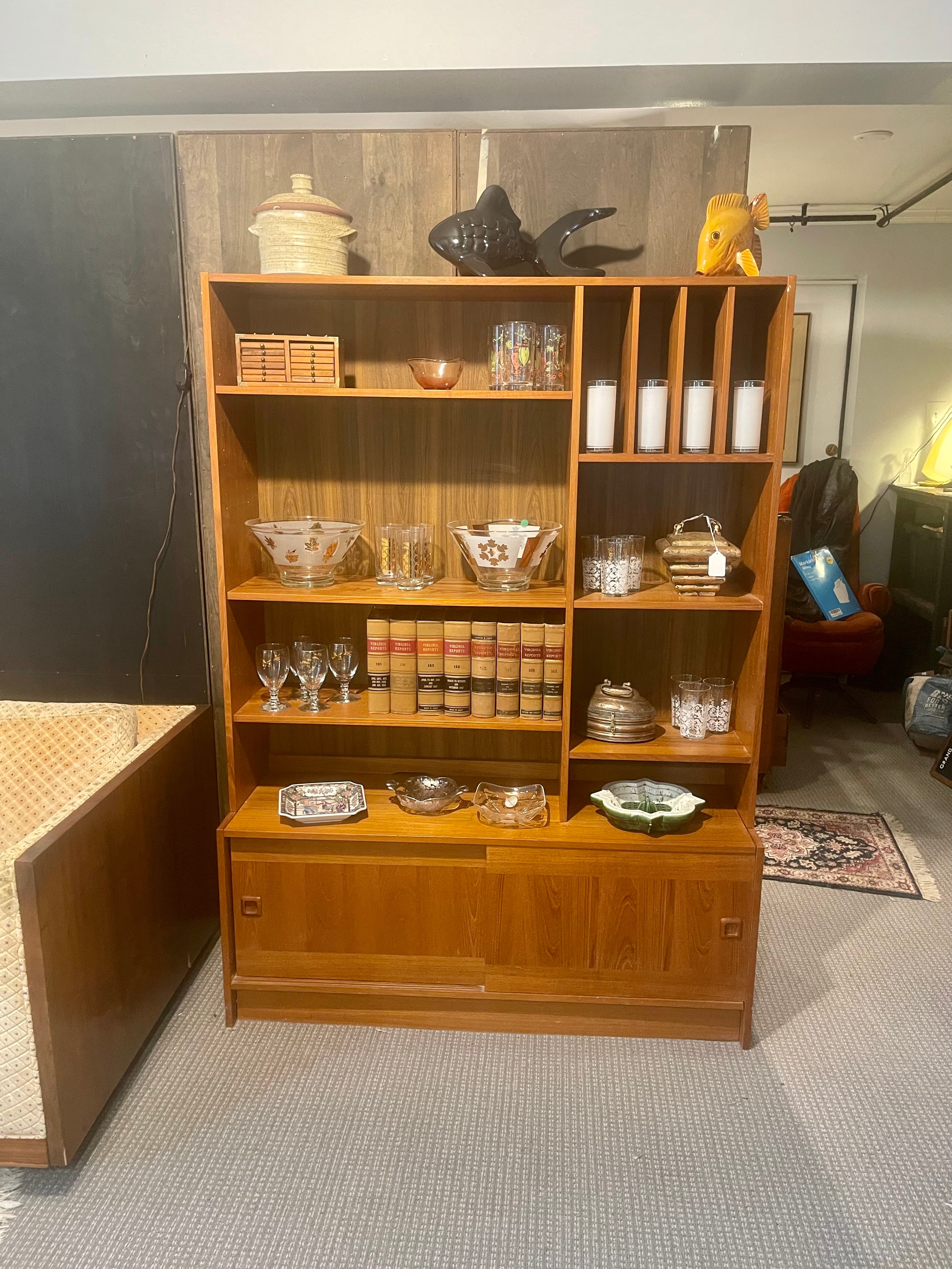 We always love to get teak bookcases/cabinets at Magpie because they are such versatile pieces of furniture good for most any room in a home. Excellent as a bookcase in an office or Living room, you can even find a use for these in a bedroom. Tons of adjustable shelving; this unit features adjustable record storage on the upper right (easily removable if you just want a regular shelf).