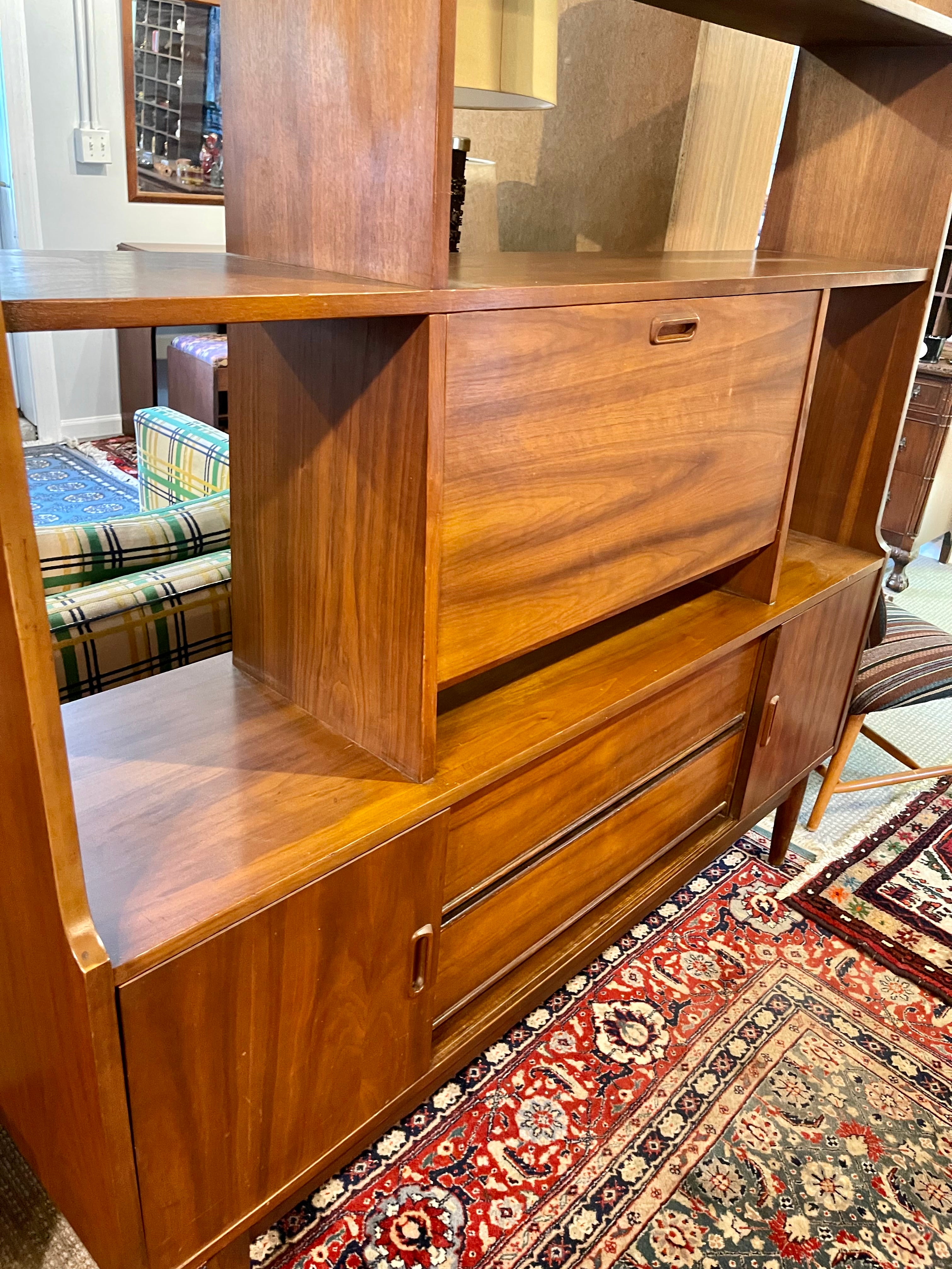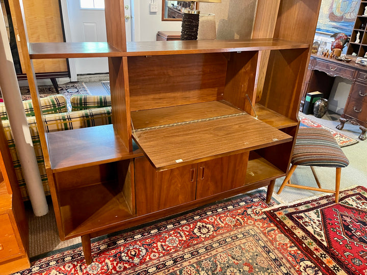 Rare Midcentury modern walnut room divider. This piece is finished on both sides and is designed to be a true room divider floating in a space, or could easily be placed against a wall. Tons of functional storage and display space with an intentionally uneven shelving design. The center cabinet opens to serve as a petite desk or luxe home bar storage.