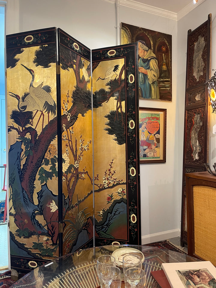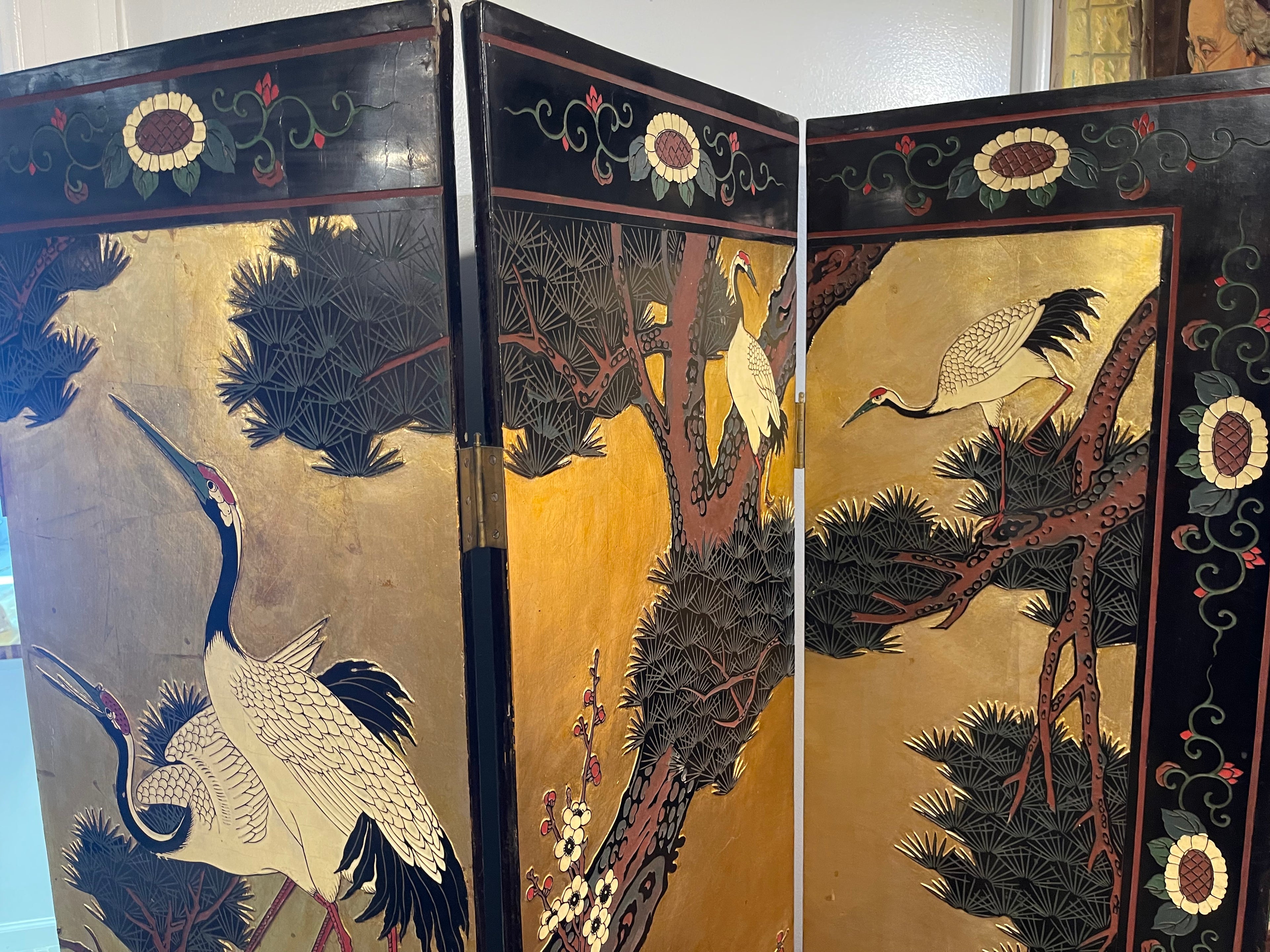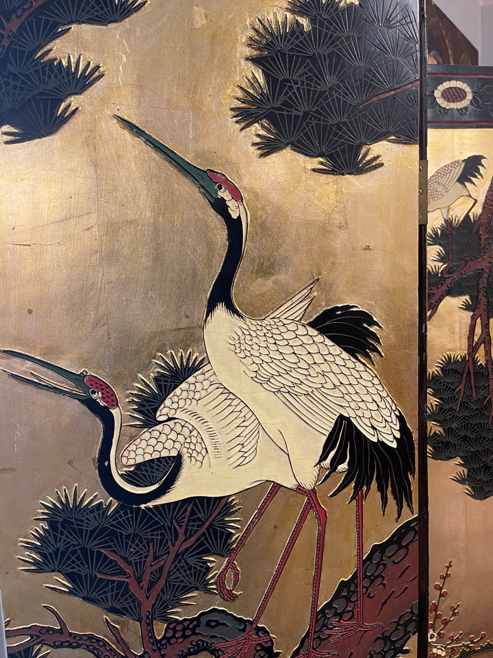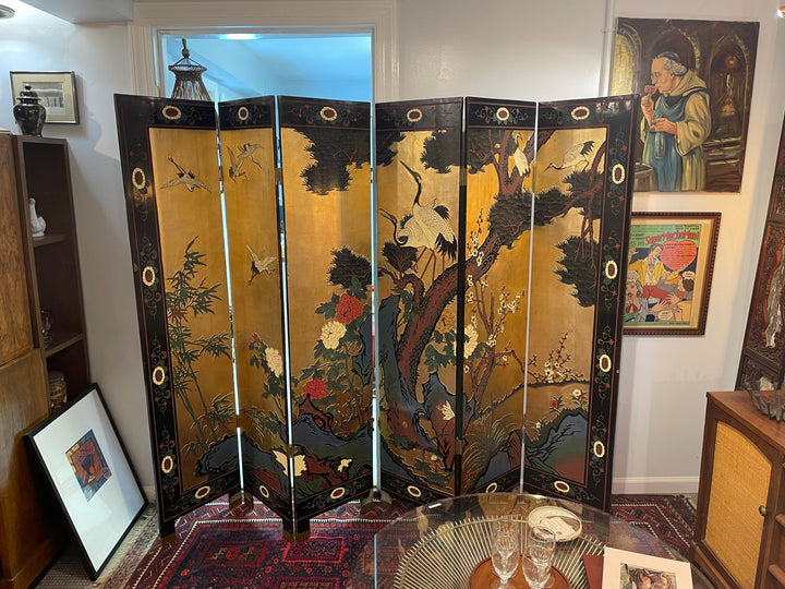 Beautiful antique Asian screens made out of a black lacquer. Traditional painted crane and mountain motif. Two sections of three panels each forms a larger six planet mural. Can be displayed with the gold painted side out or the black painted side. Panels such as these are a great way to add a maximalist and artistic flair to a room.