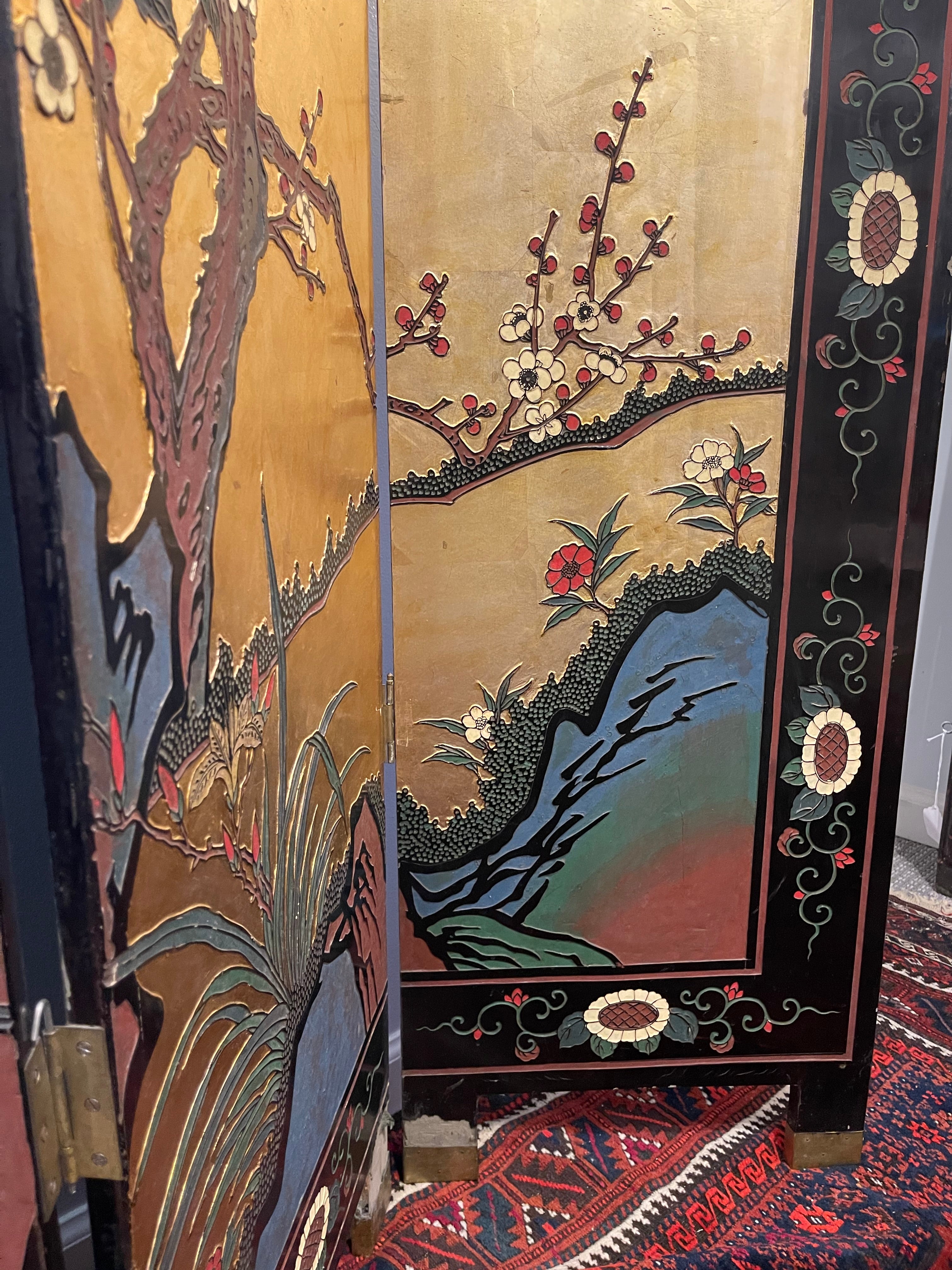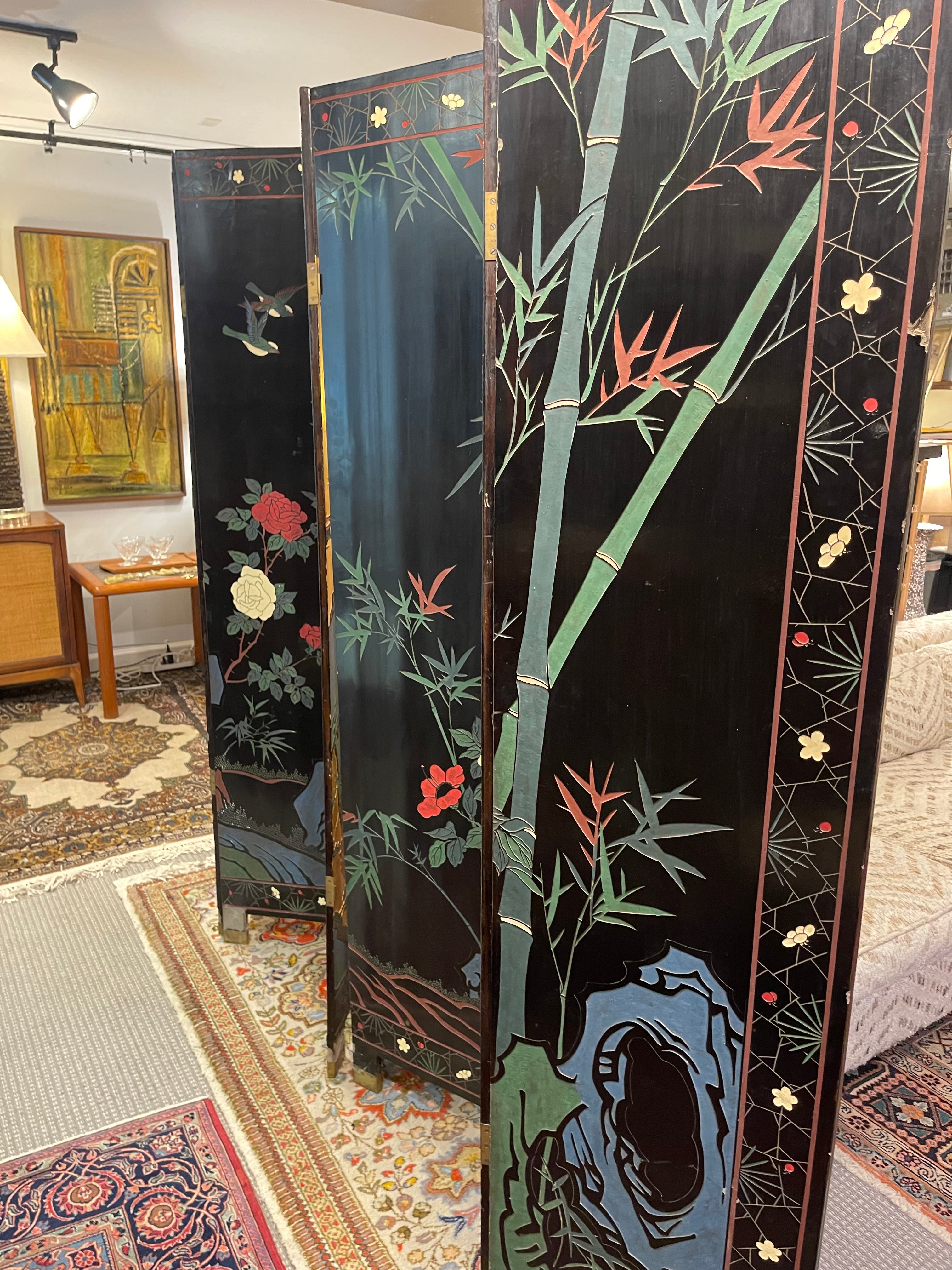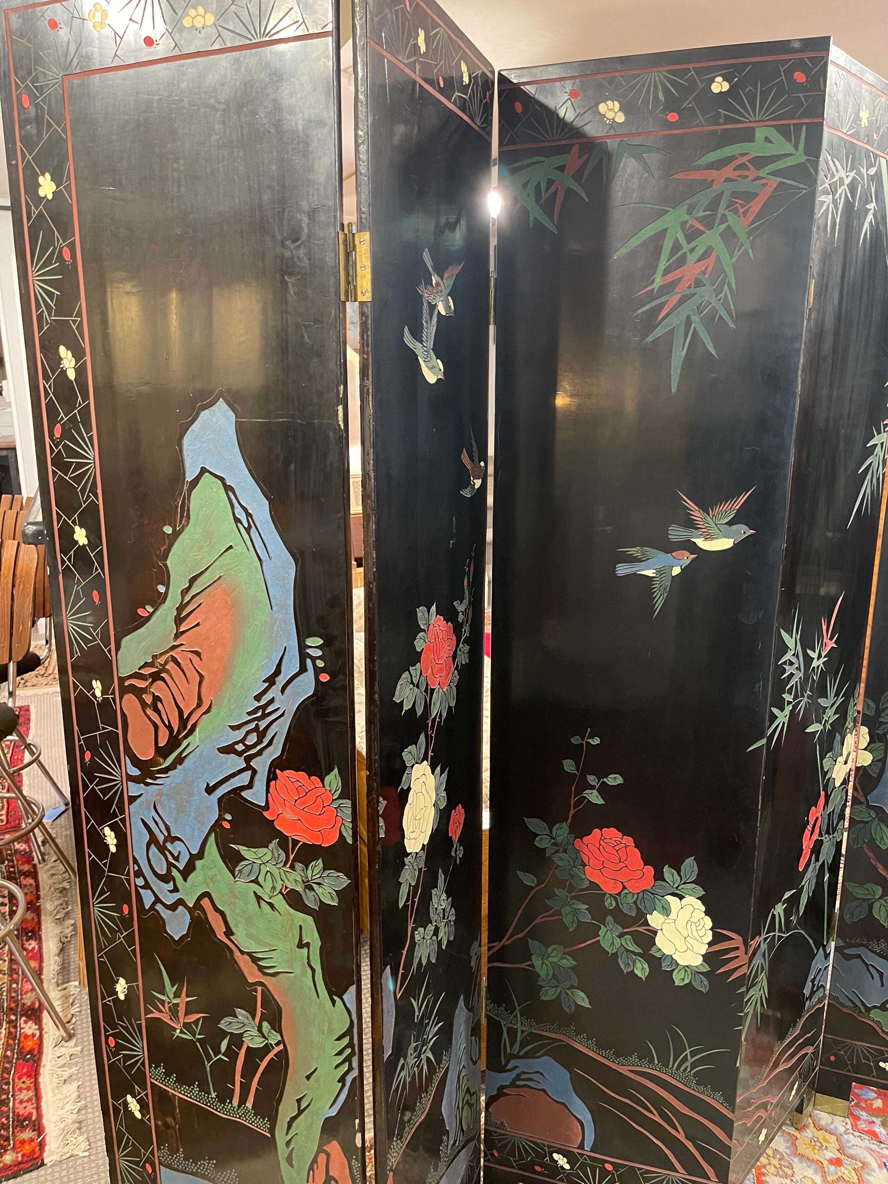 Beautiful antique Asian screens made out of a black lacquer. Traditional painted crane and mountain motif. Two sections of three panels each forms a larger six planet mural. Can be displayed with the gold painted side out or the black painted side. Panels such as these are a great way to add a maximalist and artistic flair to a room.
