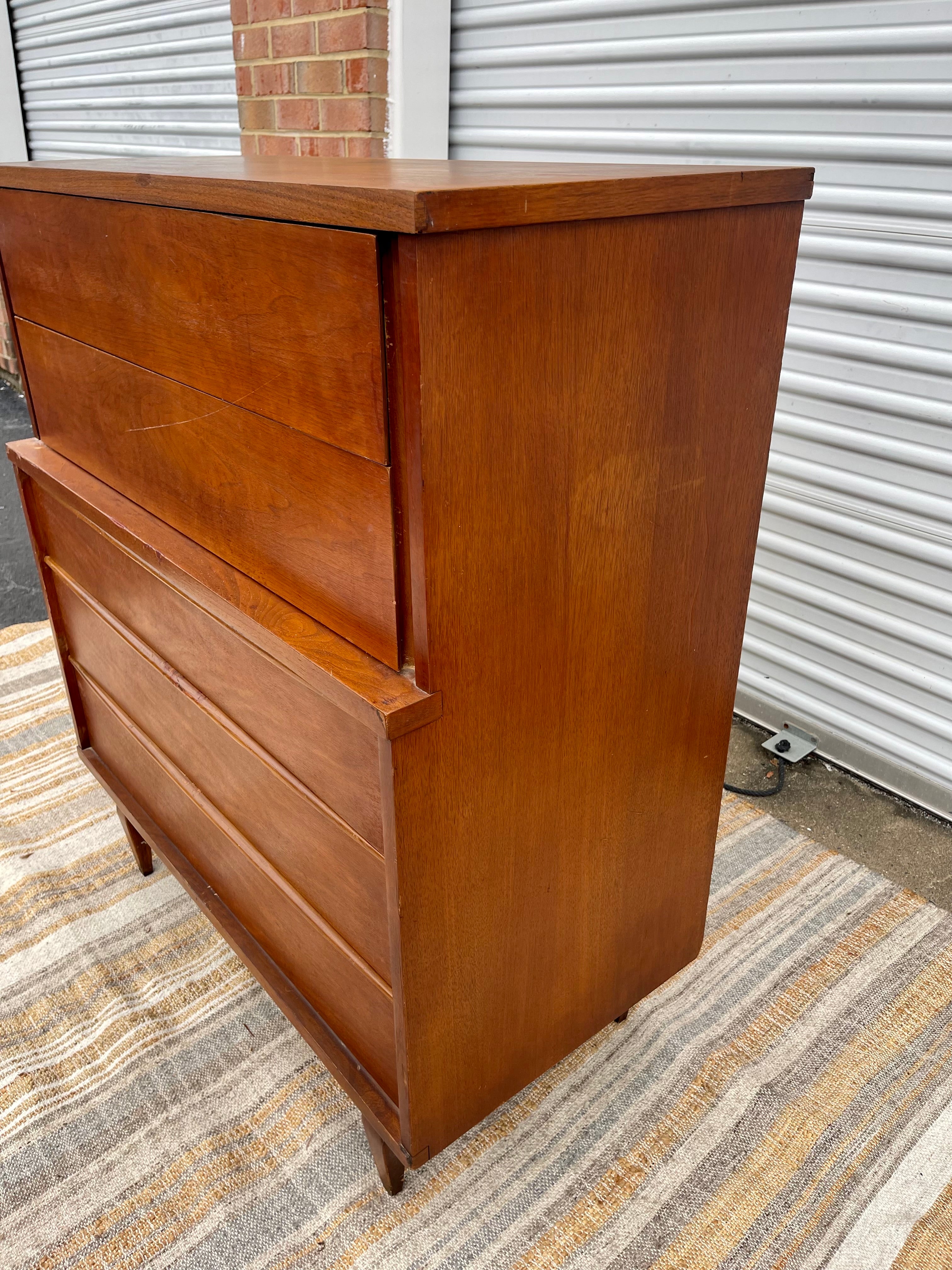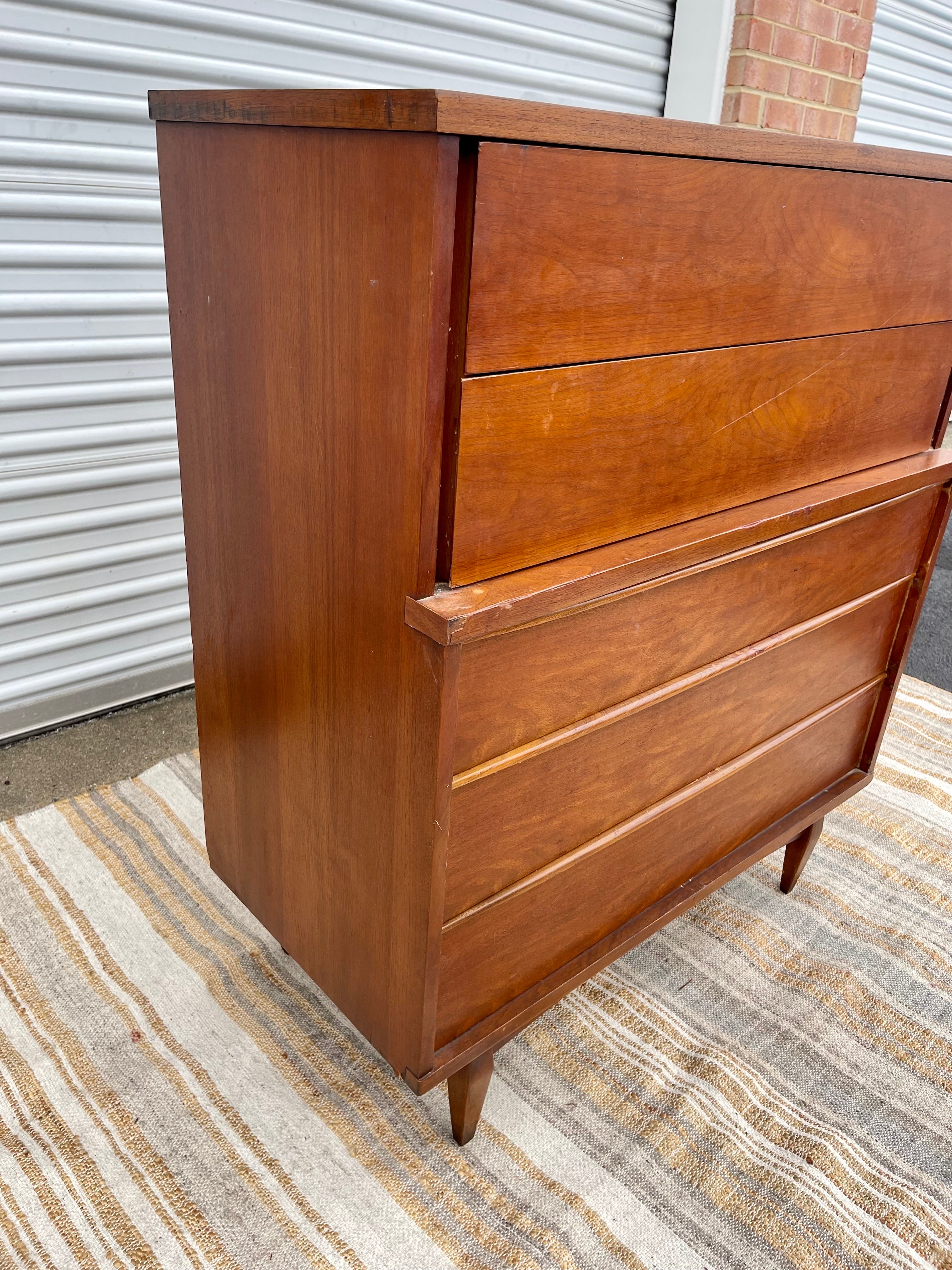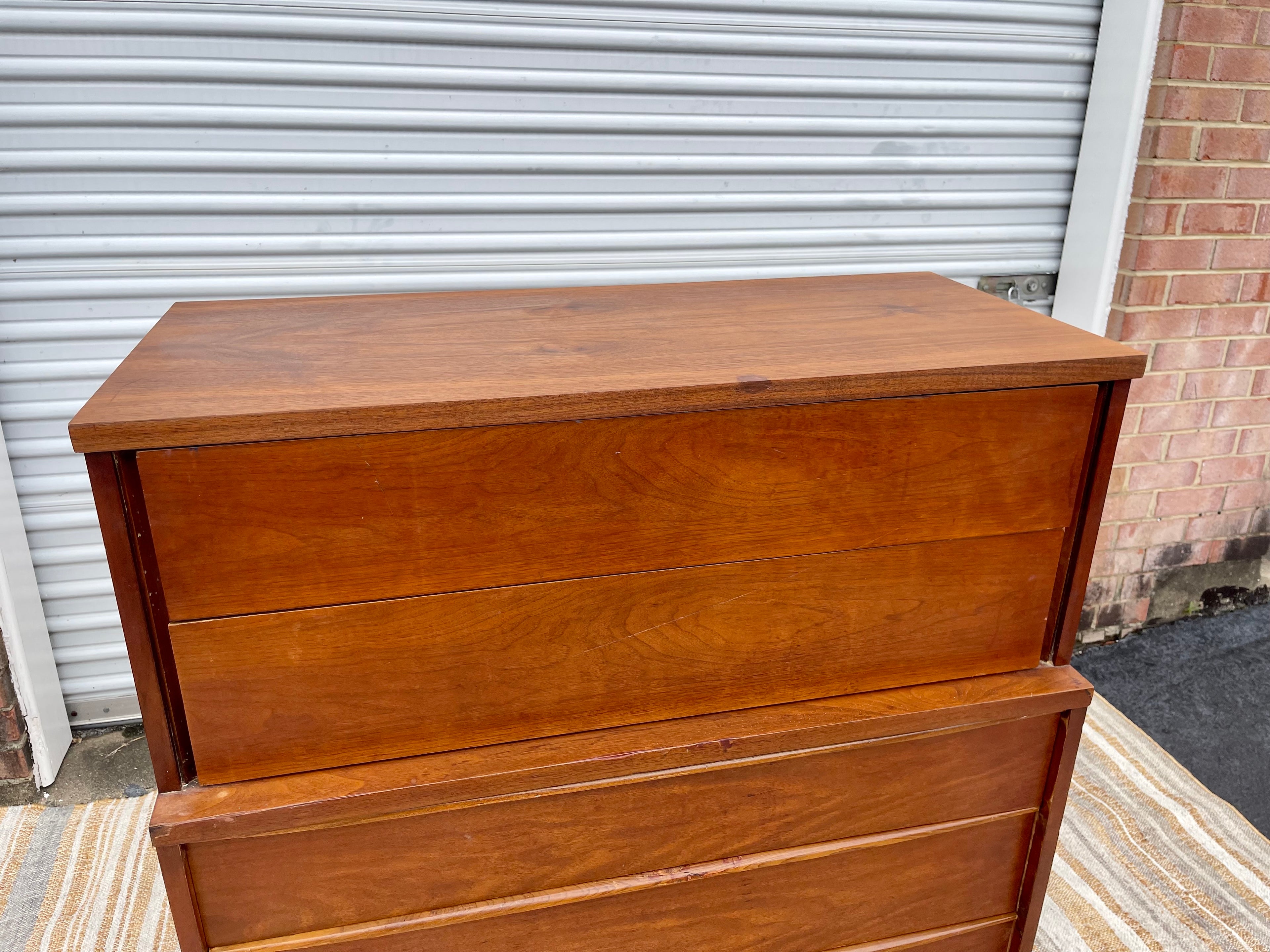 Midcentury modern Kent Coffey Tallboy dresser. Walnut finish and tapered MCM lines make this a handsome bedroom piece. Five spacious drawers; really holds a lot of clothes. In fair vintage condition; the top has been refinished but there are still some blemishes present. Overall a solid MCM dresser from a desirable designer.
