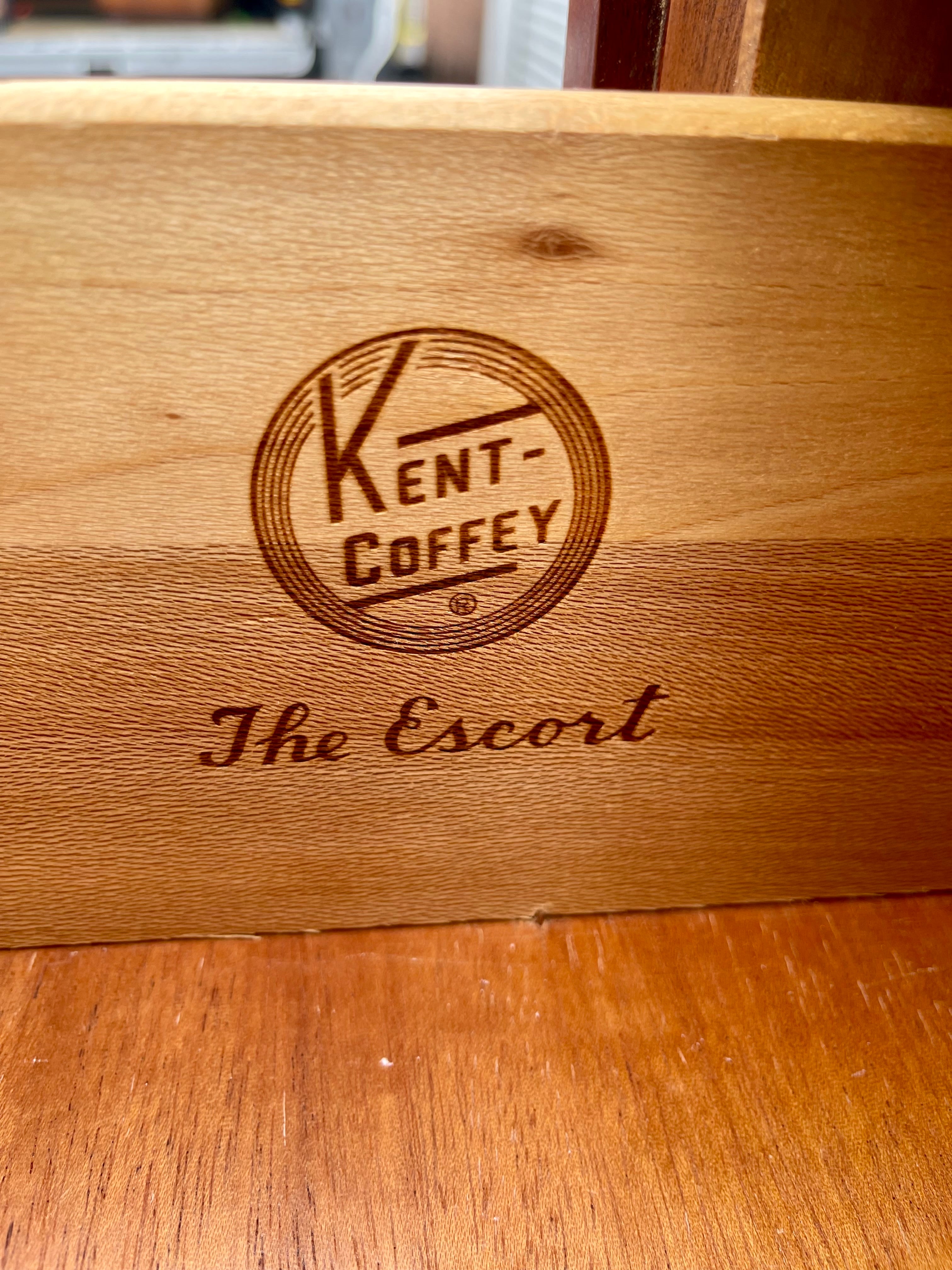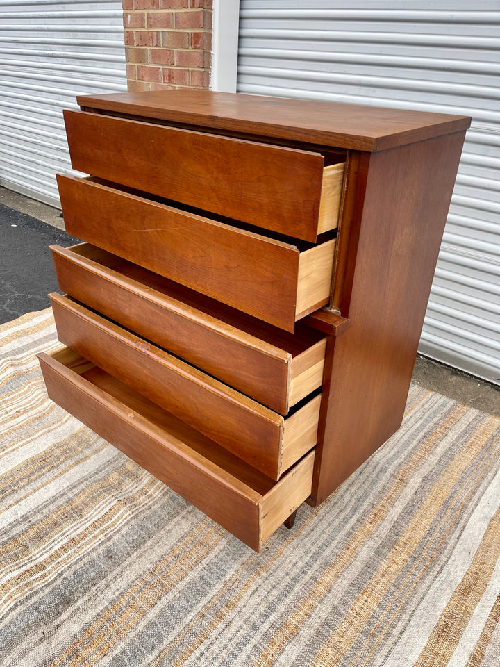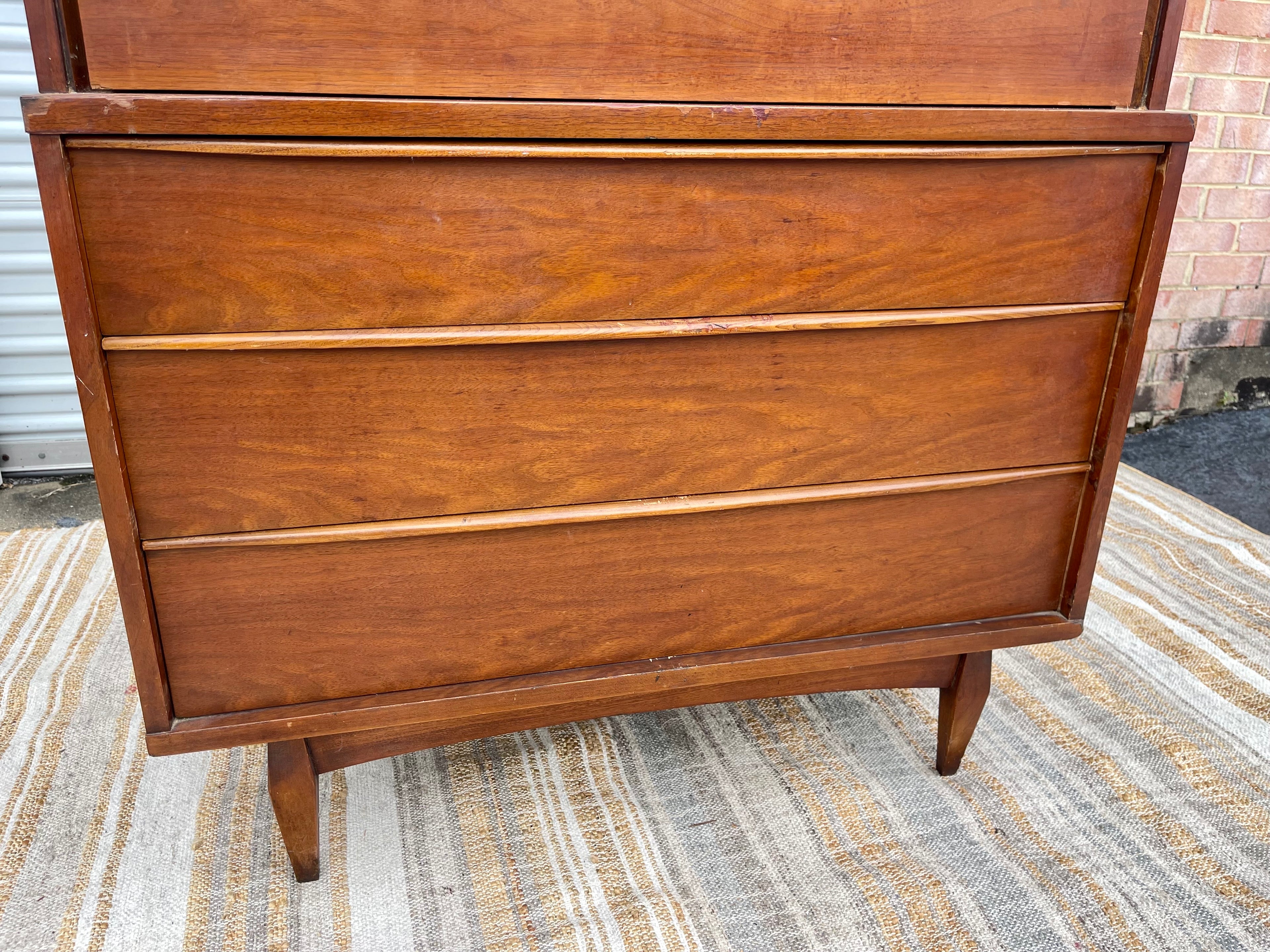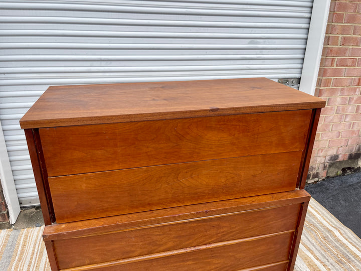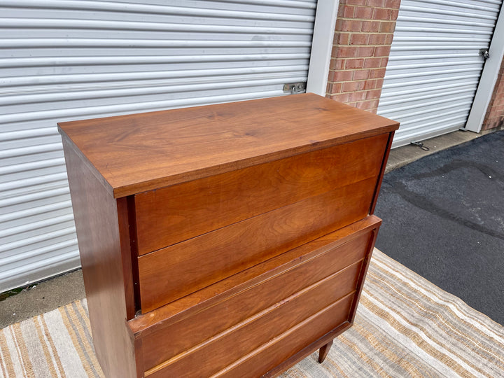 Midcentury modern Kent Coffey Tallboy dresser. Walnut finish and tapered MCM lines make this a handsome bedroom piece. Five spacious drawers; really holds a lot of clothes. In fair vintage condition; the top has been refinished but there are still some blemishes present. Overall a solid MCM dresser from a desirable designer.