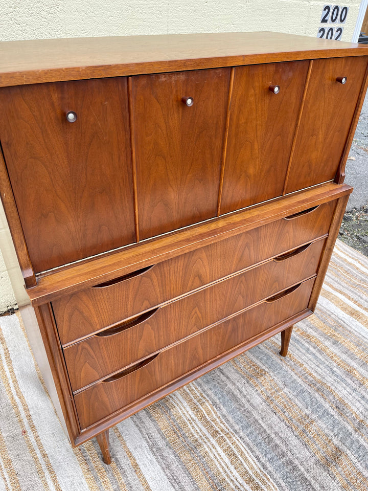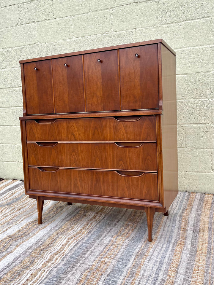 Handsome Midcentury modern Tallboy dresser or gentleman’s chest in a beautiful book matched walnut. The upper cabinet lowers down to reveal two drawers, one of which opens up to a petite vanity mirror. The lower drawers have carved wood pulls. Overall a very elevated example of Midcentury furniture.