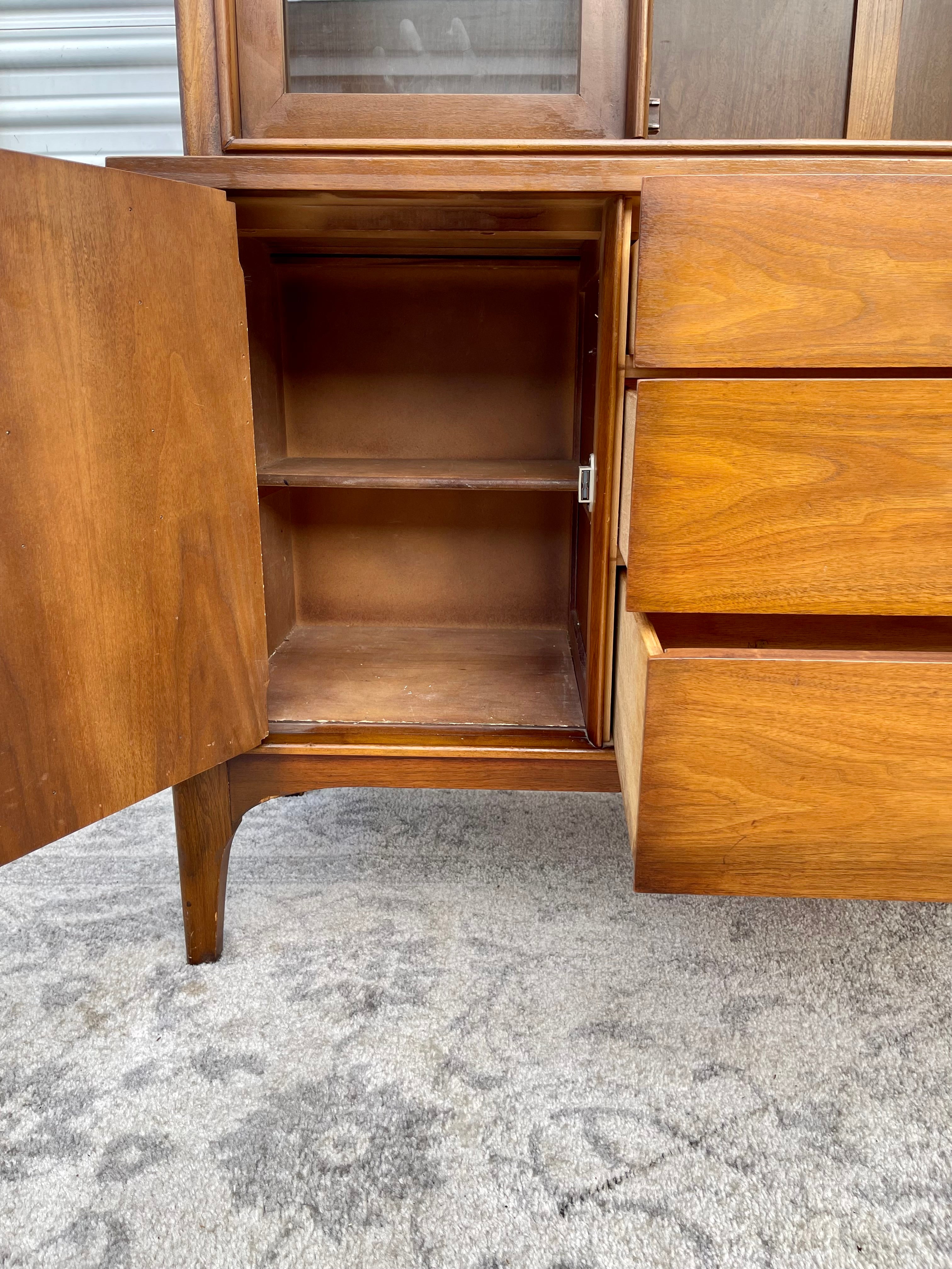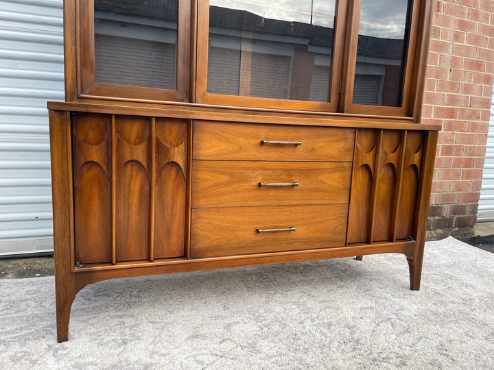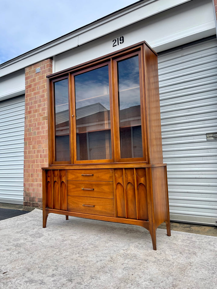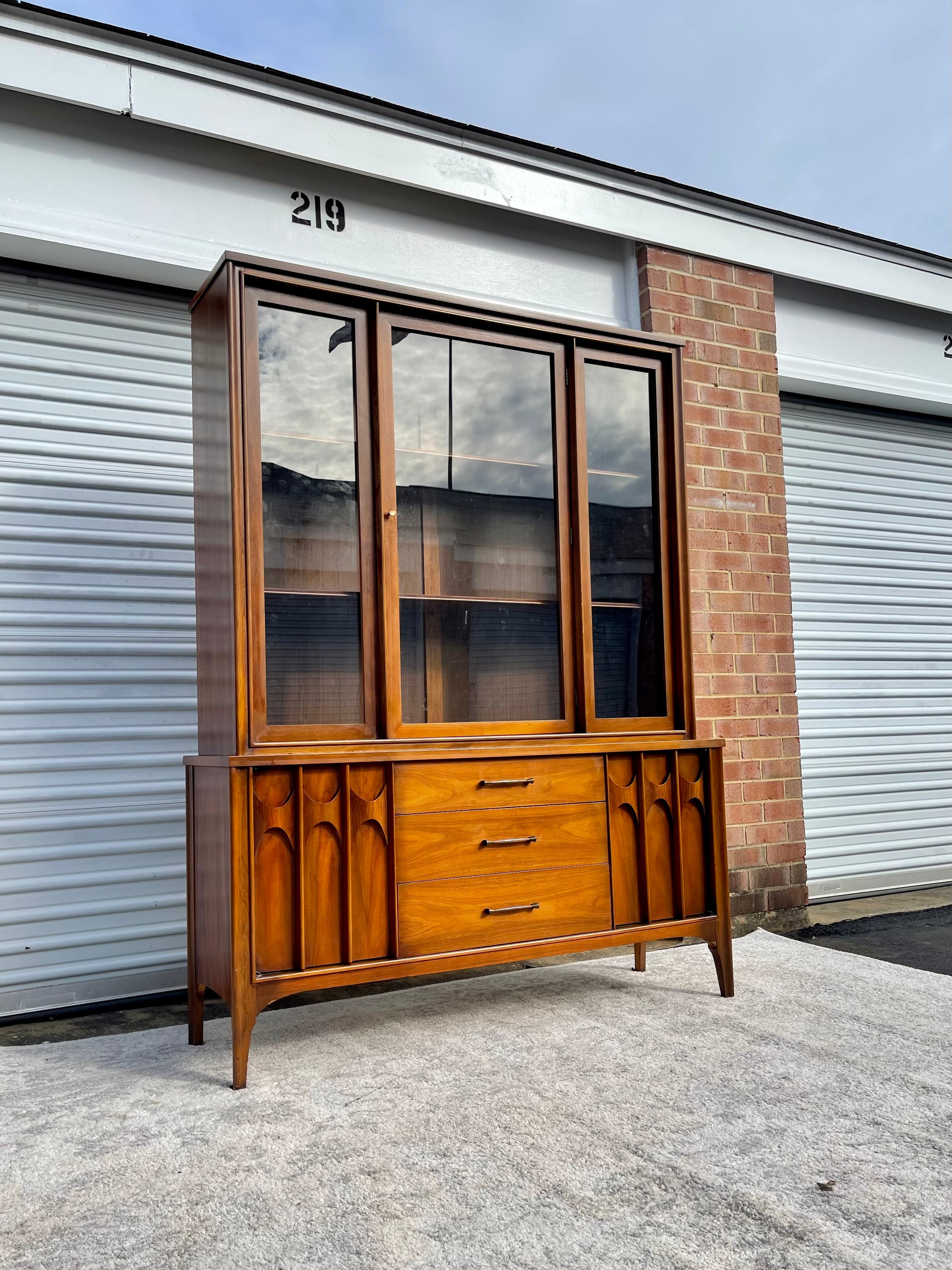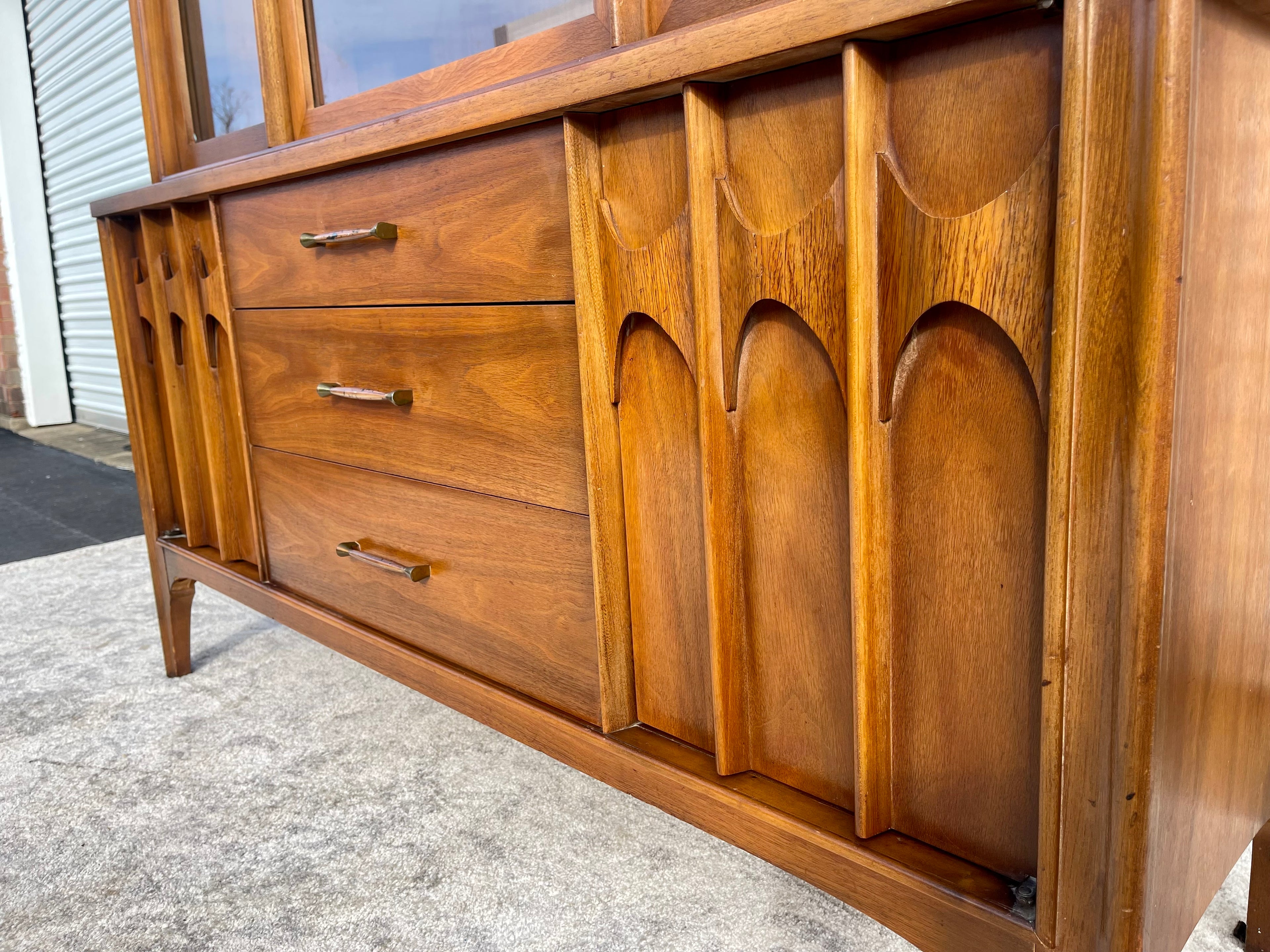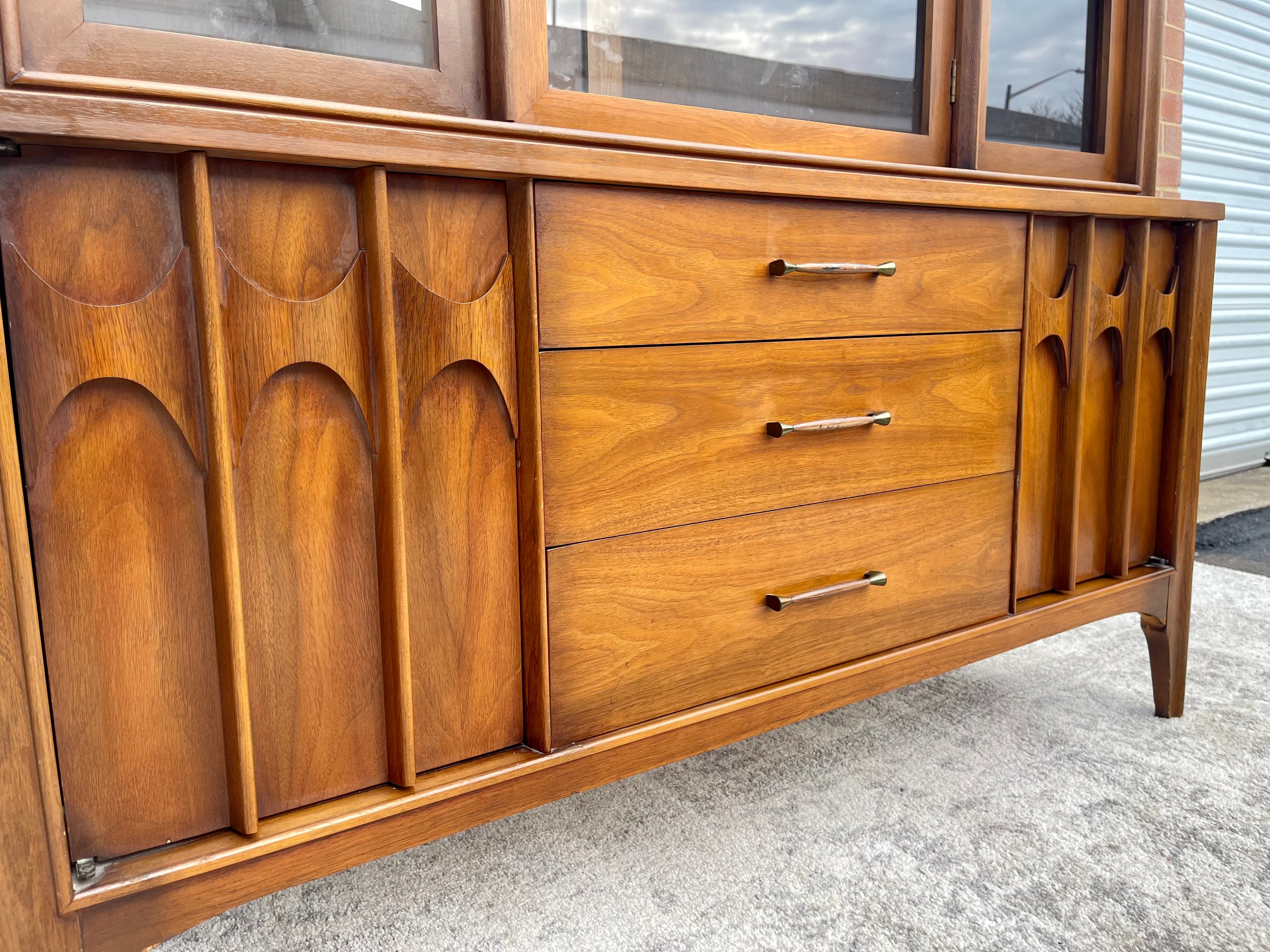 A fabulous piece from one of the most popular mid century brutalist collections! This petite Kent Coffey Perspecta China Cabinet has those stunning curved wood arches that are all the rave at the moment. A truly stunning, yet not overstated statement piece for your home. The hutch has two large shelves, and the credenza has three central drawers and two cupboards with additional shelving inside. It really doesn’t get any better than Kent Coffey in terms of quality.