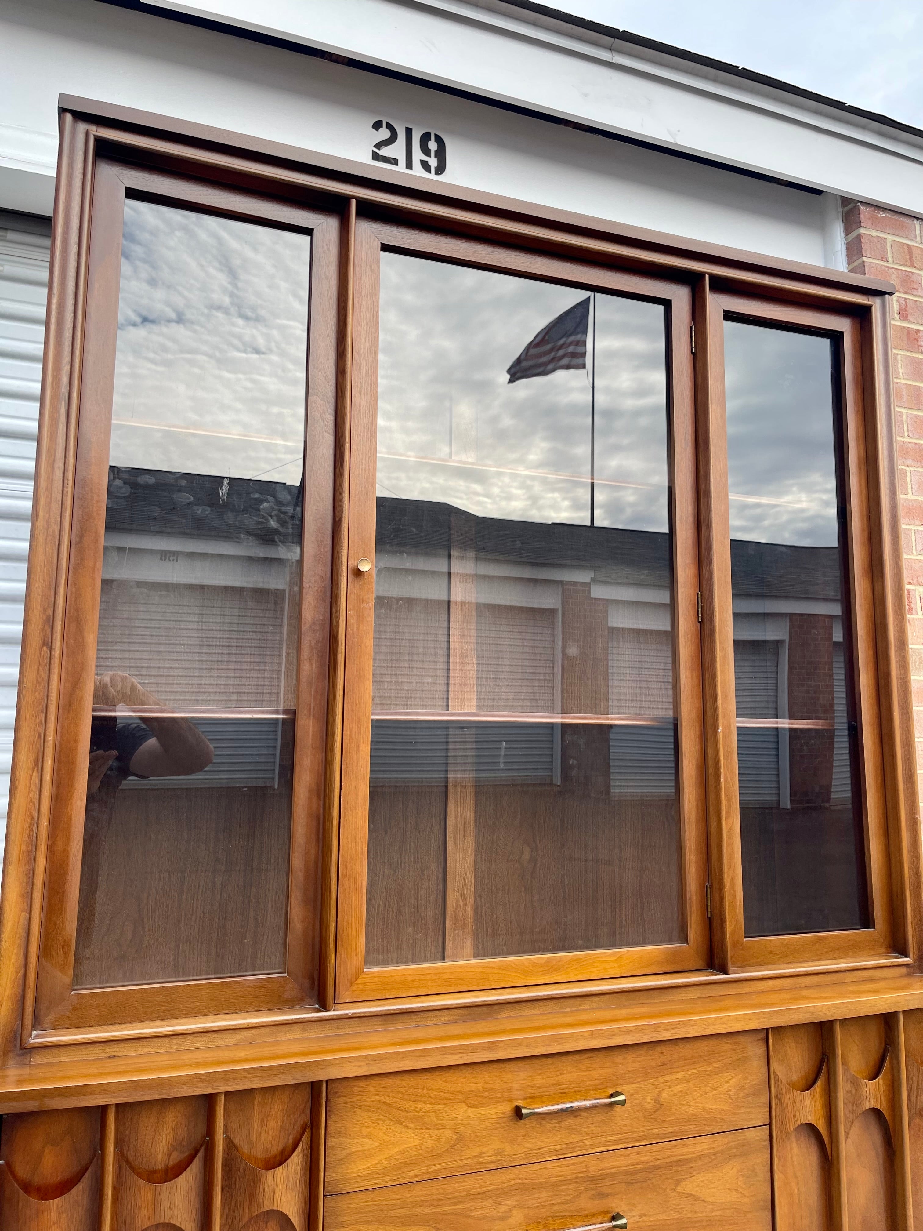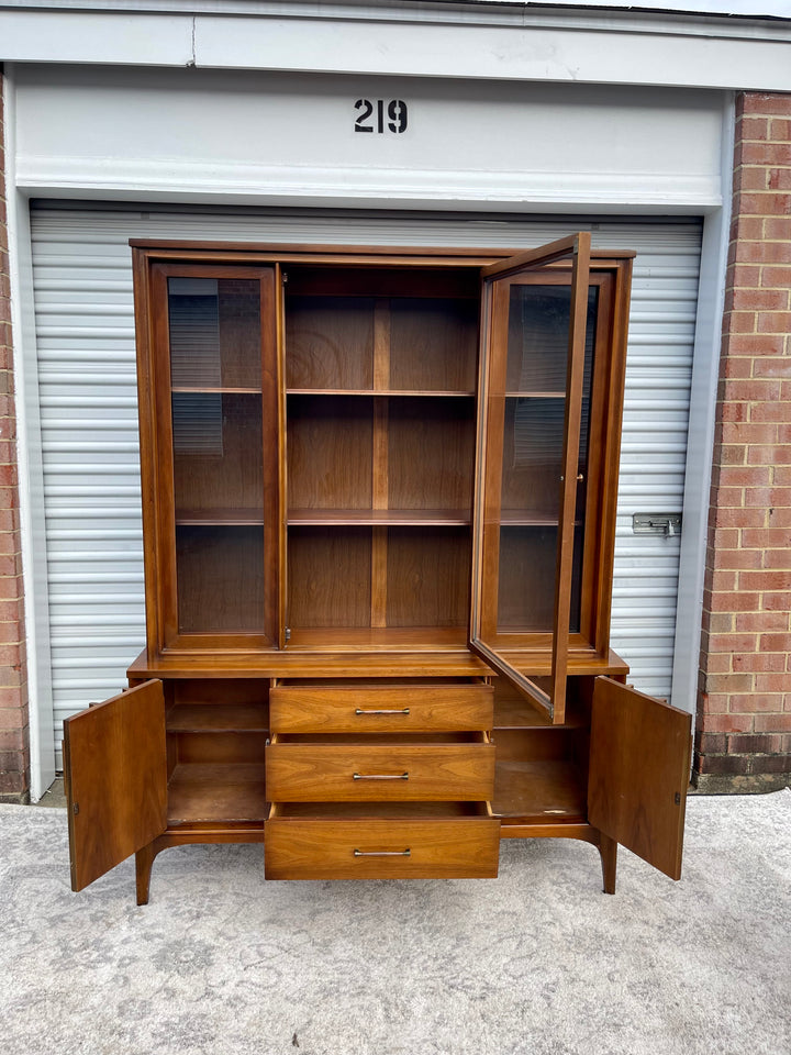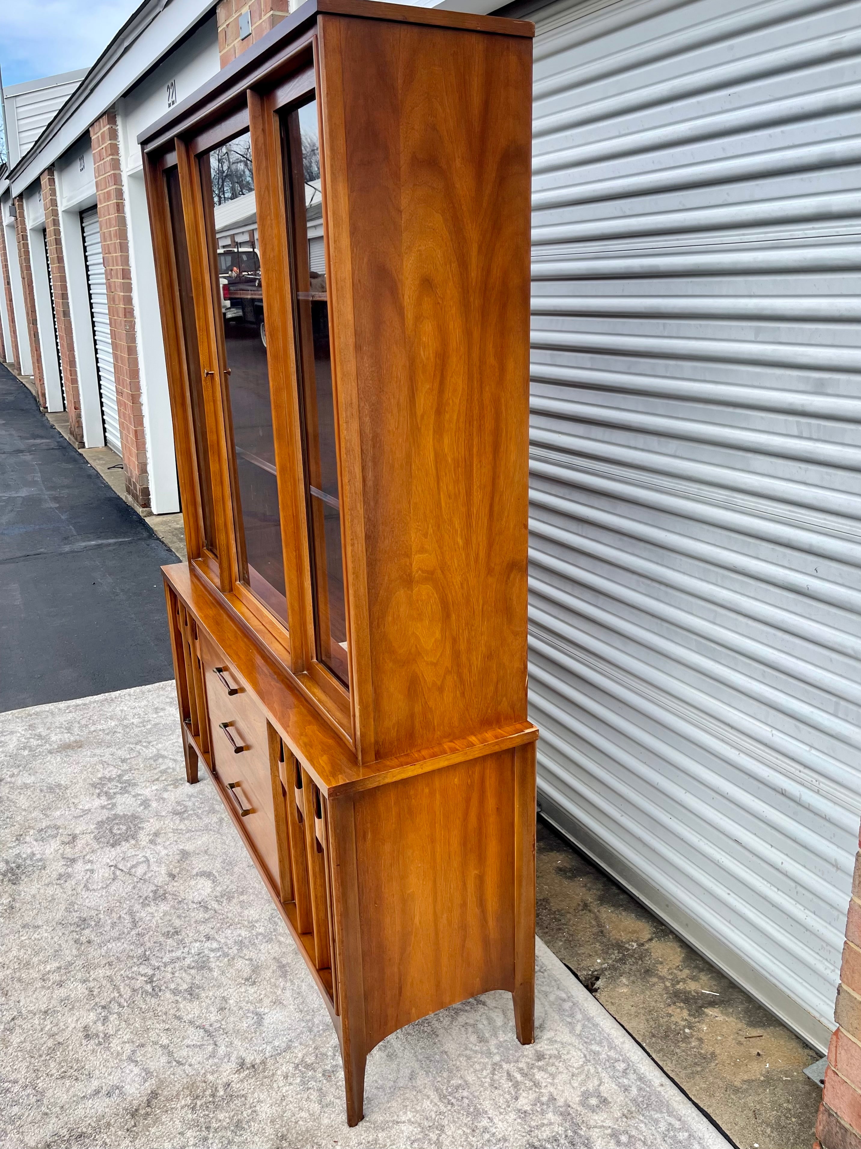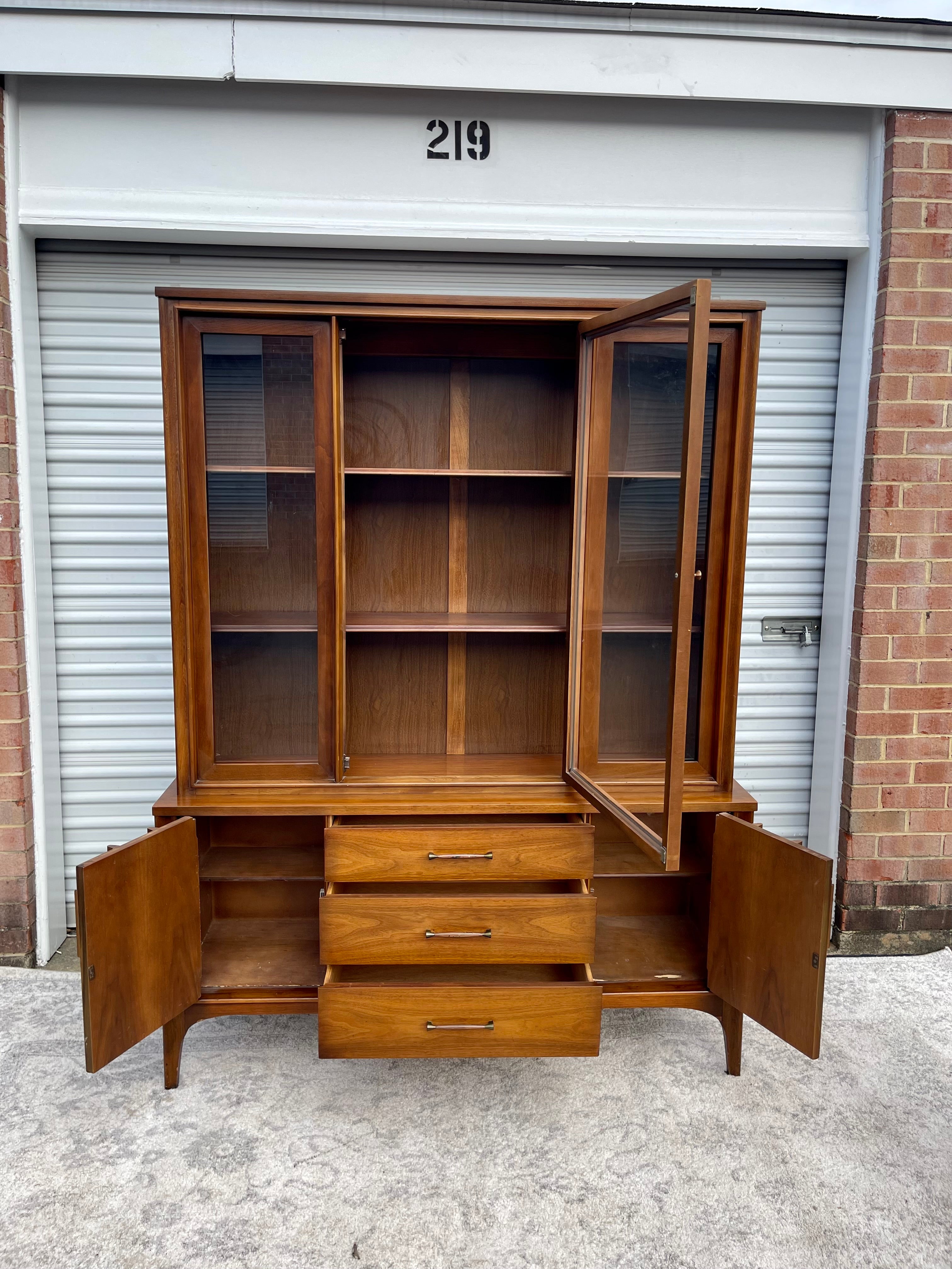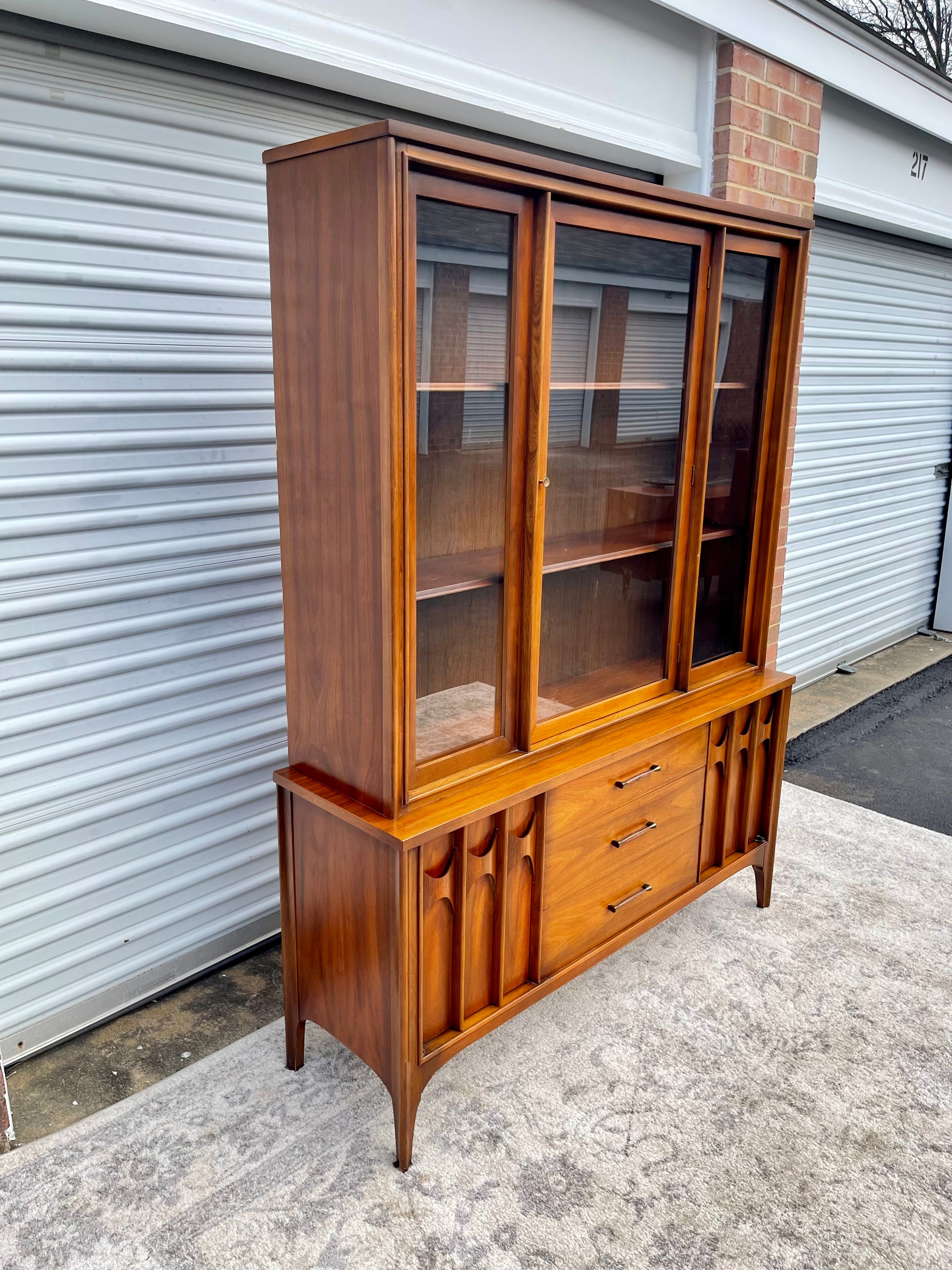 A fabulous piece from one of the most popular mid century brutalist collections! This petite Kent Coffey Perspecta China Cabinet has those stunning curved wood arches that are all the rave at the moment. A truly stunning, yet not overstated statement piece for your home. The hutch has two large shelves, and the credenza has three central drawers and two cupboards with additional shelving inside. It really doesn’t get any better than Kent Coffey in terms of quality.