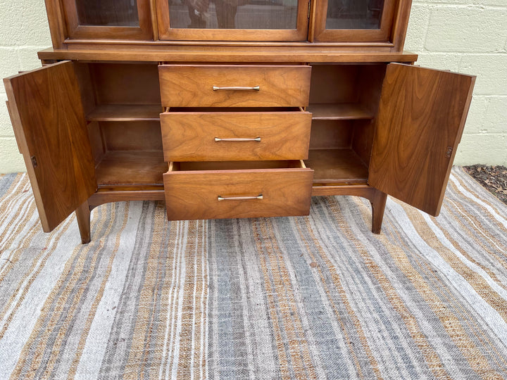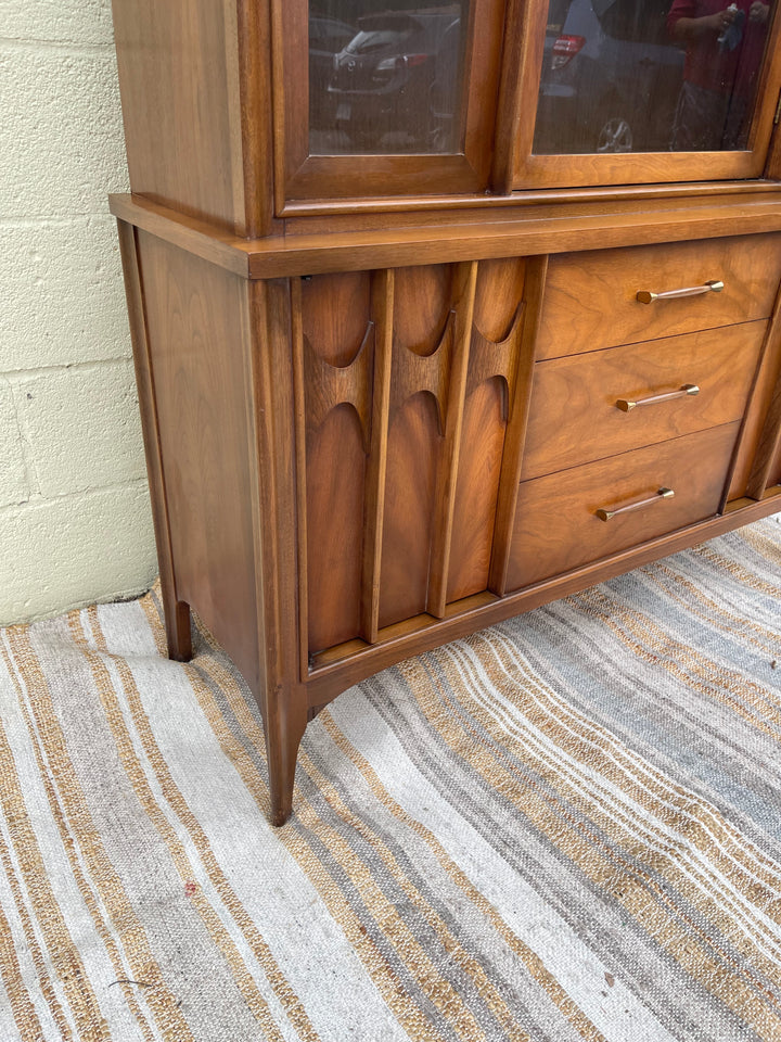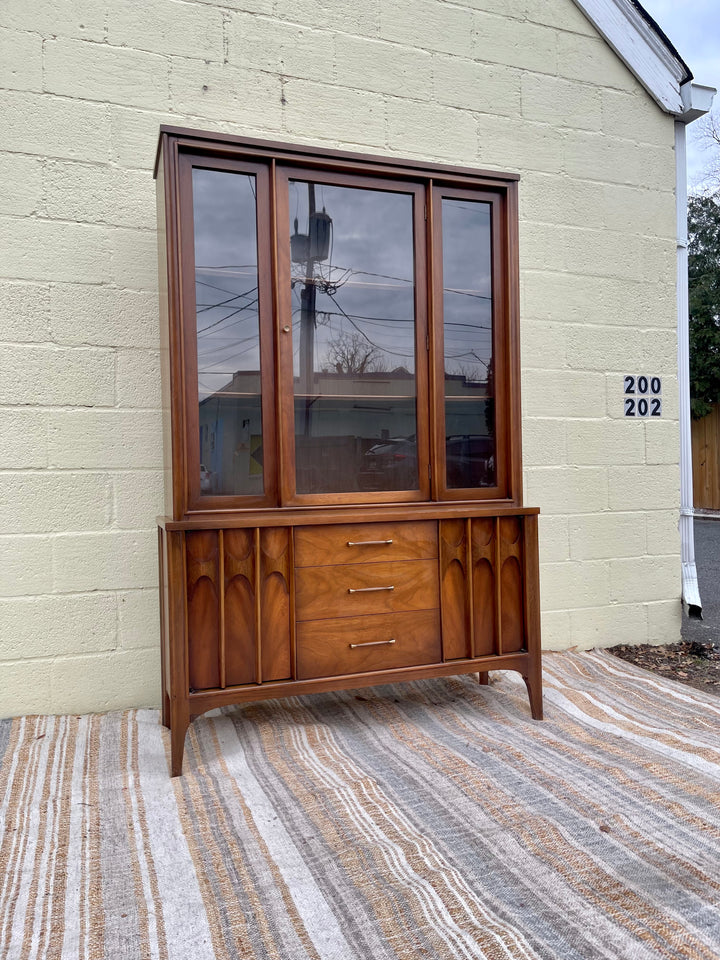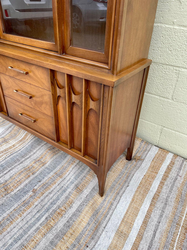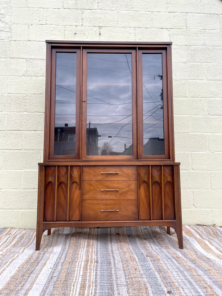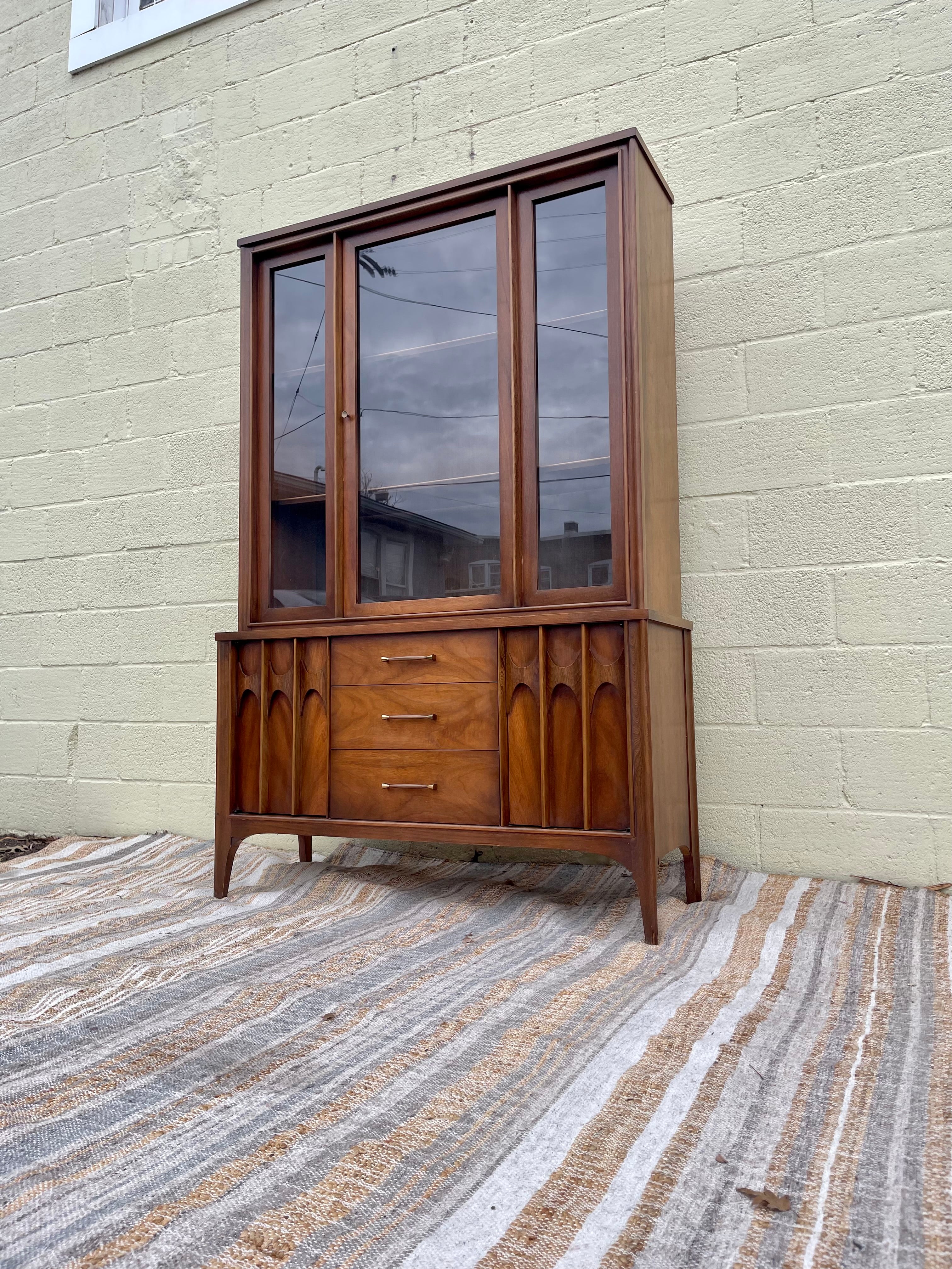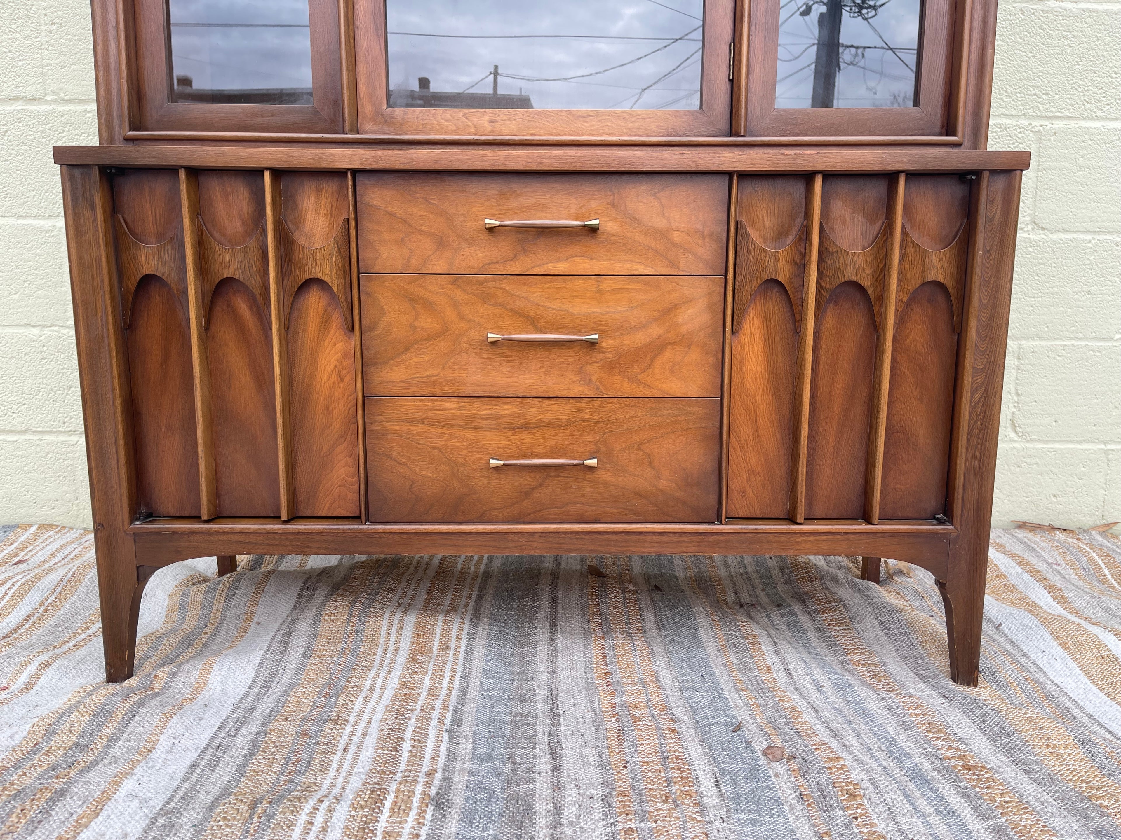 A fabulous piece from one of the most popular mid century brutalist collections! This petite Kent Coffey Perspecta China Cabinet has those stunning curved wood arches that are all the rave at the moment. A truly stunning, yet not overstated statement piece for your home. The hutch has two large shelves, and the credenza has three central drawers and two cupboards with additional shelving inside. It really doesn’t get any better than Kent Coffey in terms of quality.