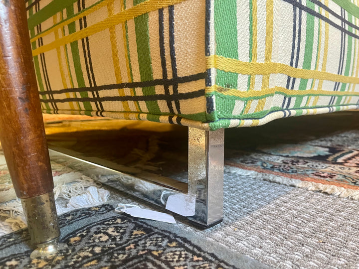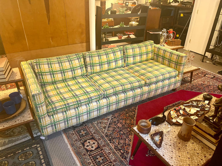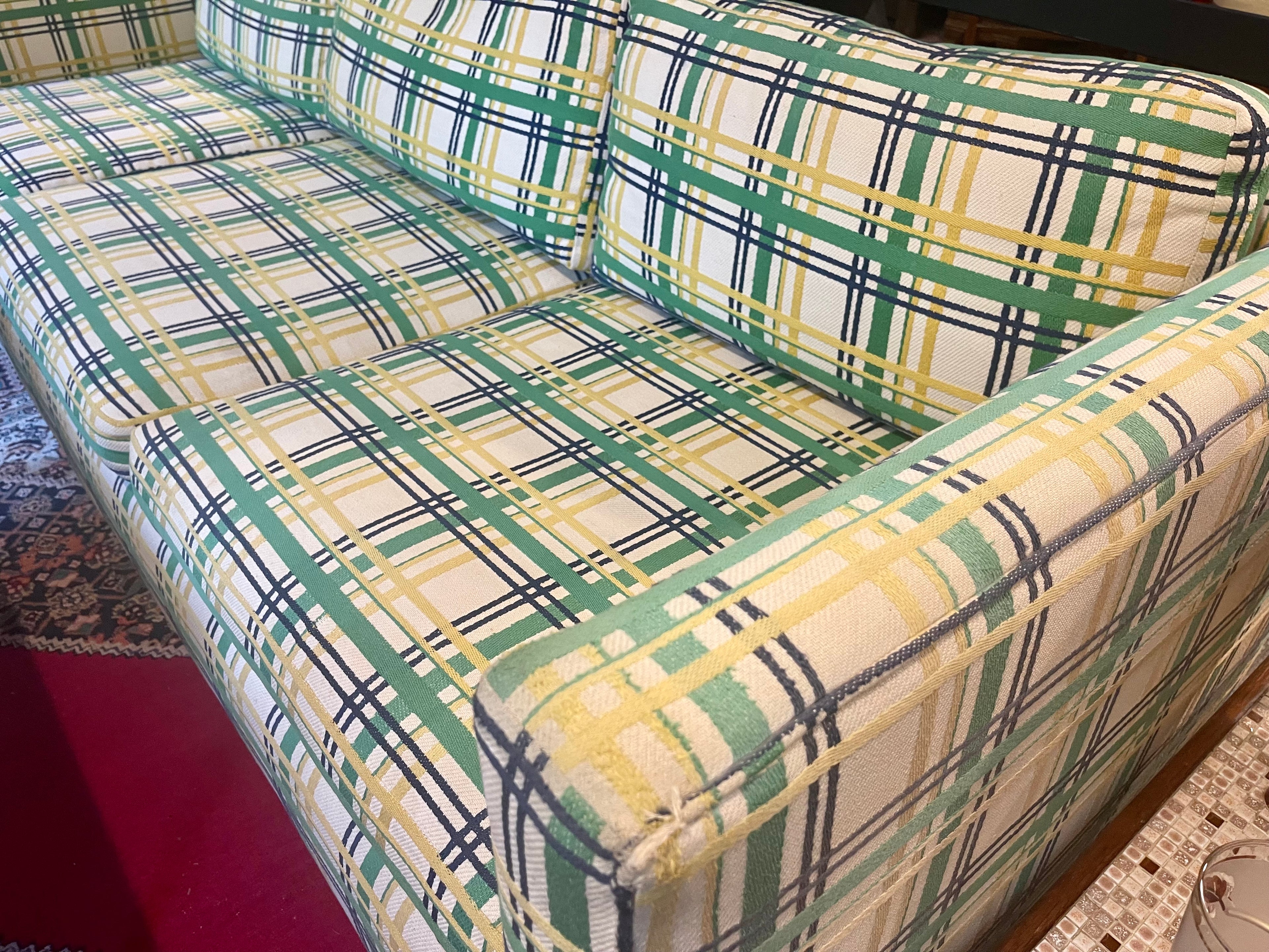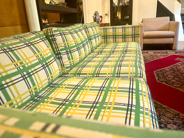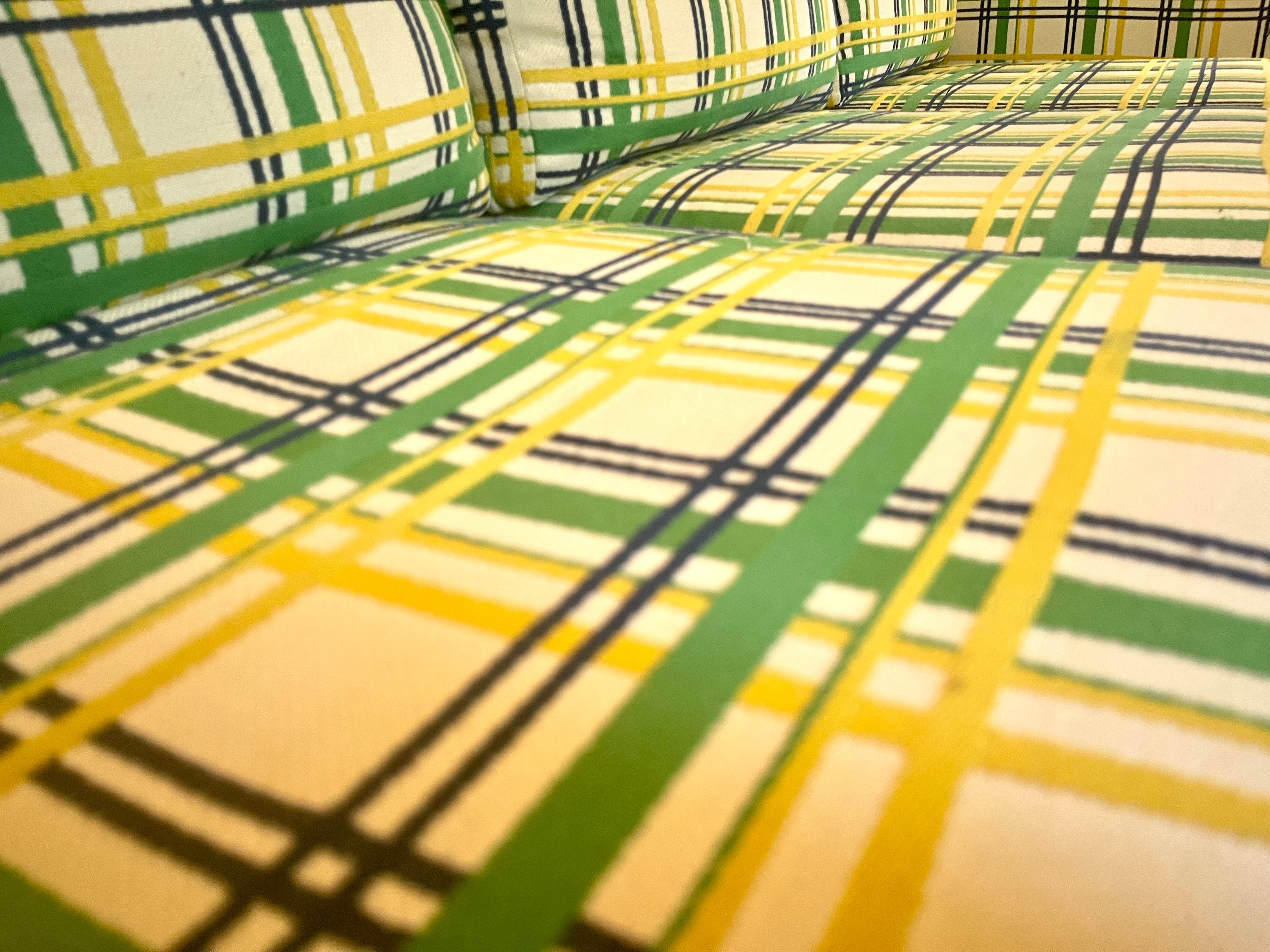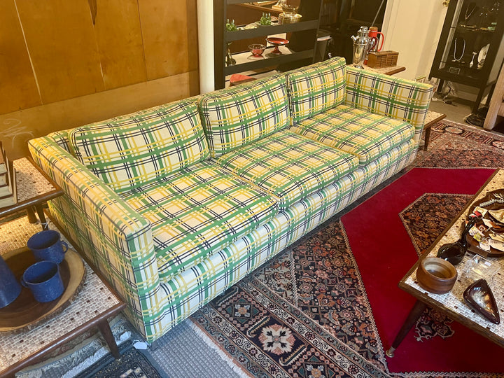 Really well made vintage Midcentury modern sofa by local company King Furniture Mfg (Baltimore, MD). Upholstered in a green and yellow plaid with a cream base. Upholstery is in excellent vintage condition with few signs of aging/wear. Cushions are all in great shape and the couch is very comfortable. Chrome sleigh legs add a unique element.