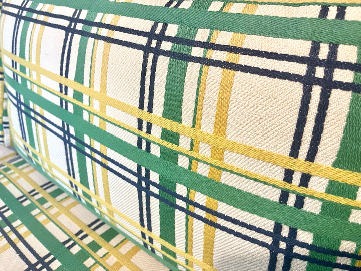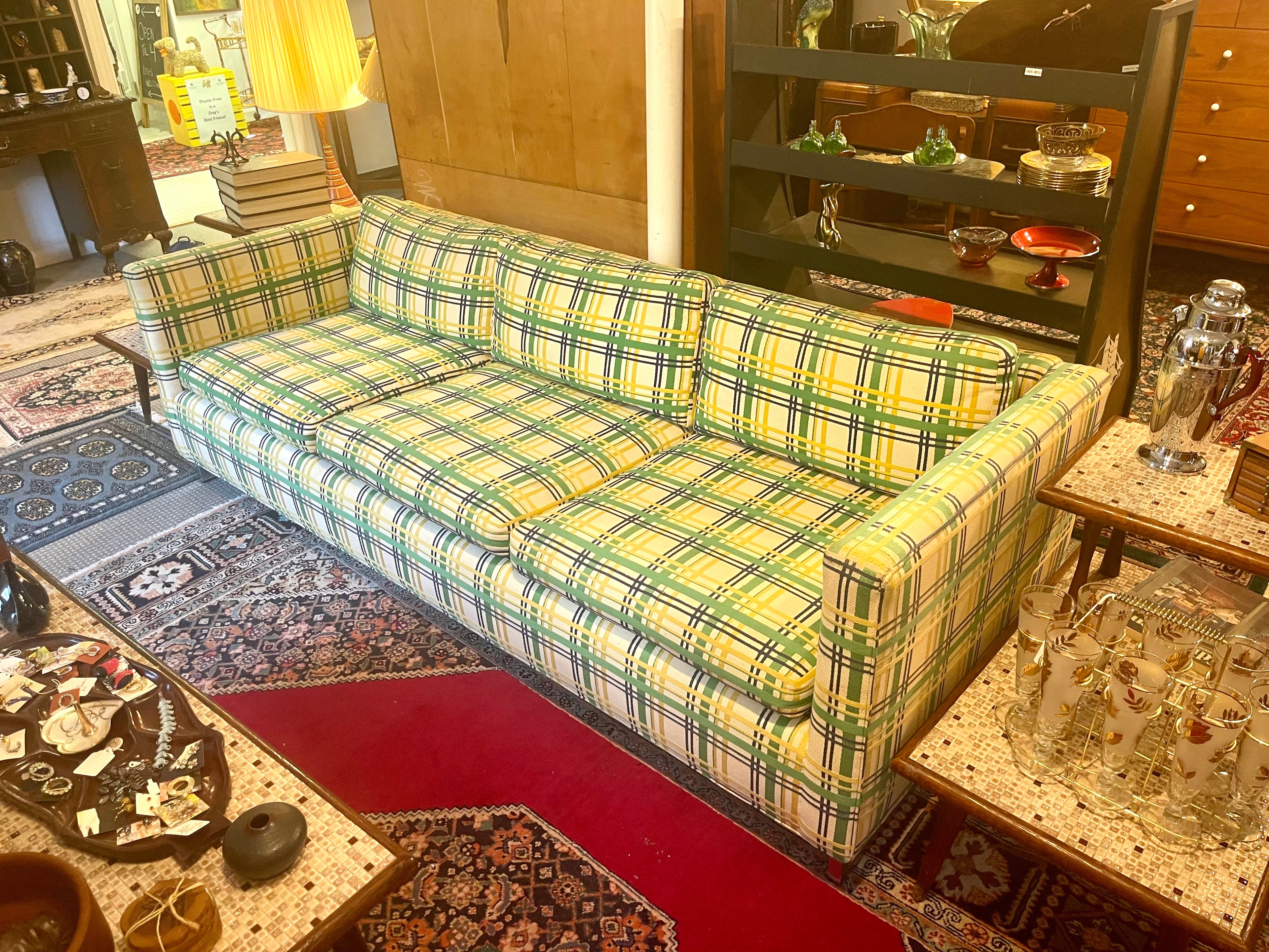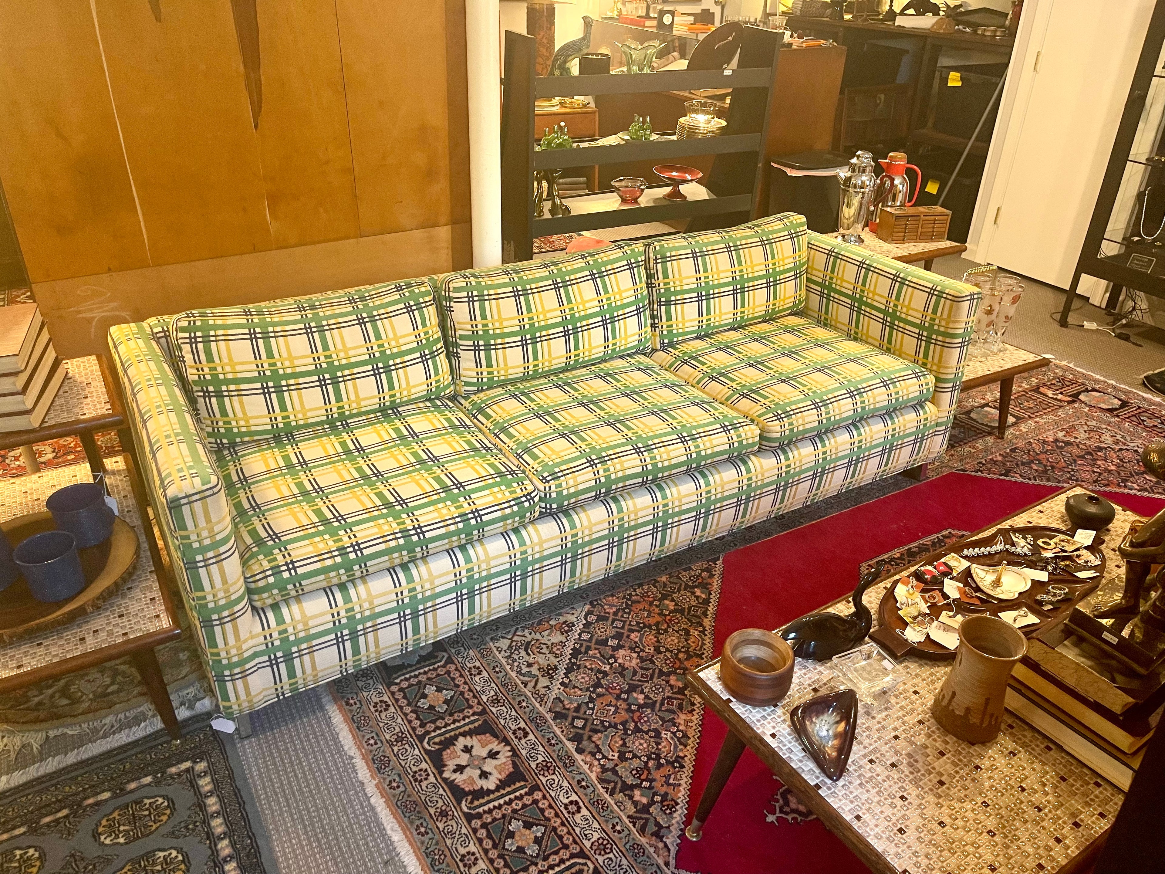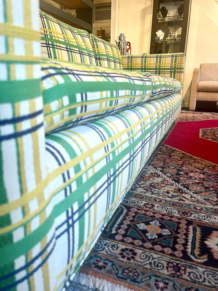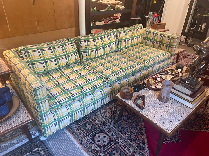 Really well made vintage Midcentury modern sofa by local company King Furniture Mfg (Baltimore, MD). Upholstered in a green and yellow plaid with a cream base. Upholstery is in excellent vintage condition with few signs of aging/wear. Cushions are all in great shape and the couch is very comfortable. Chrome sleigh legs add a unique element.